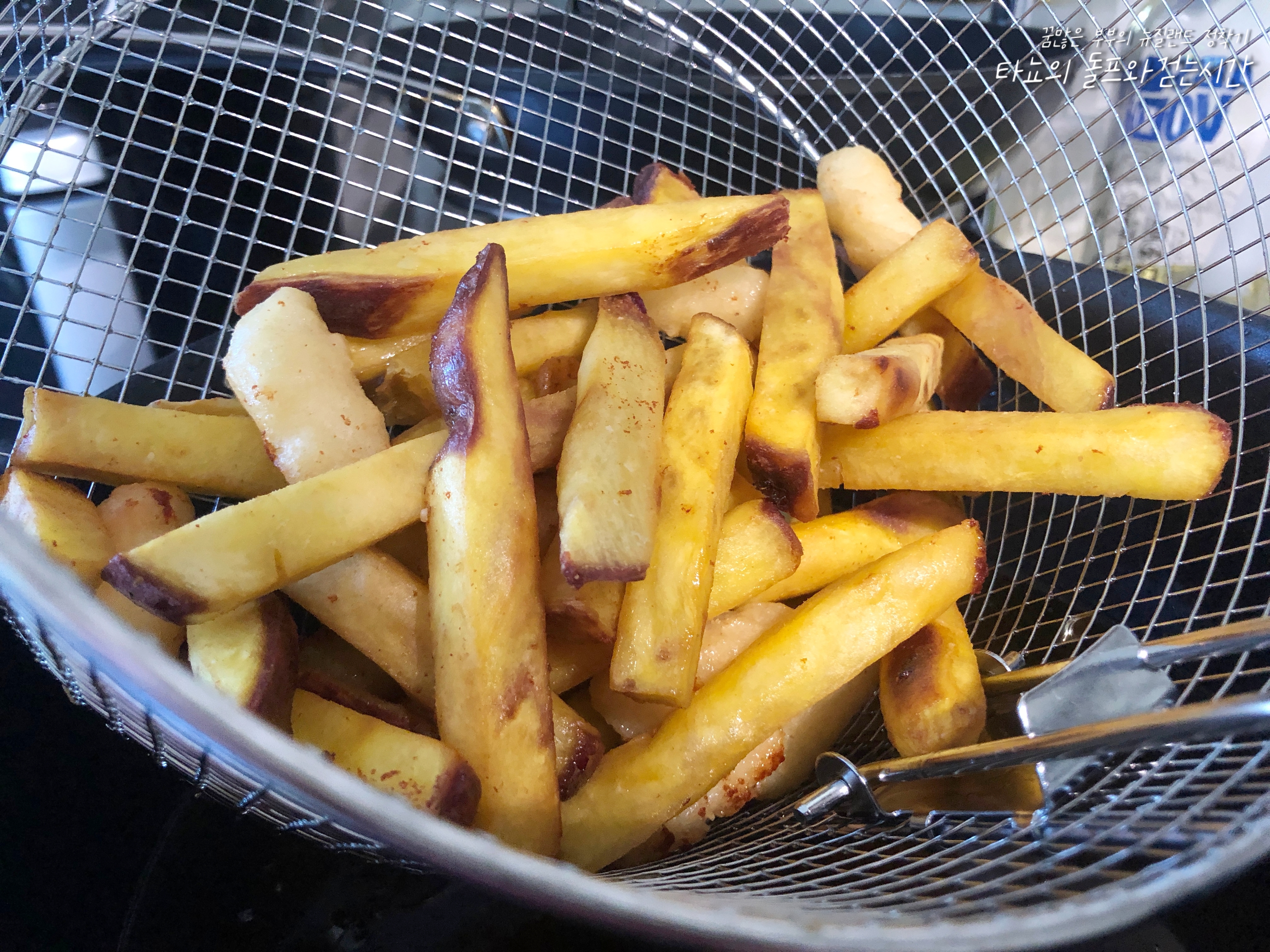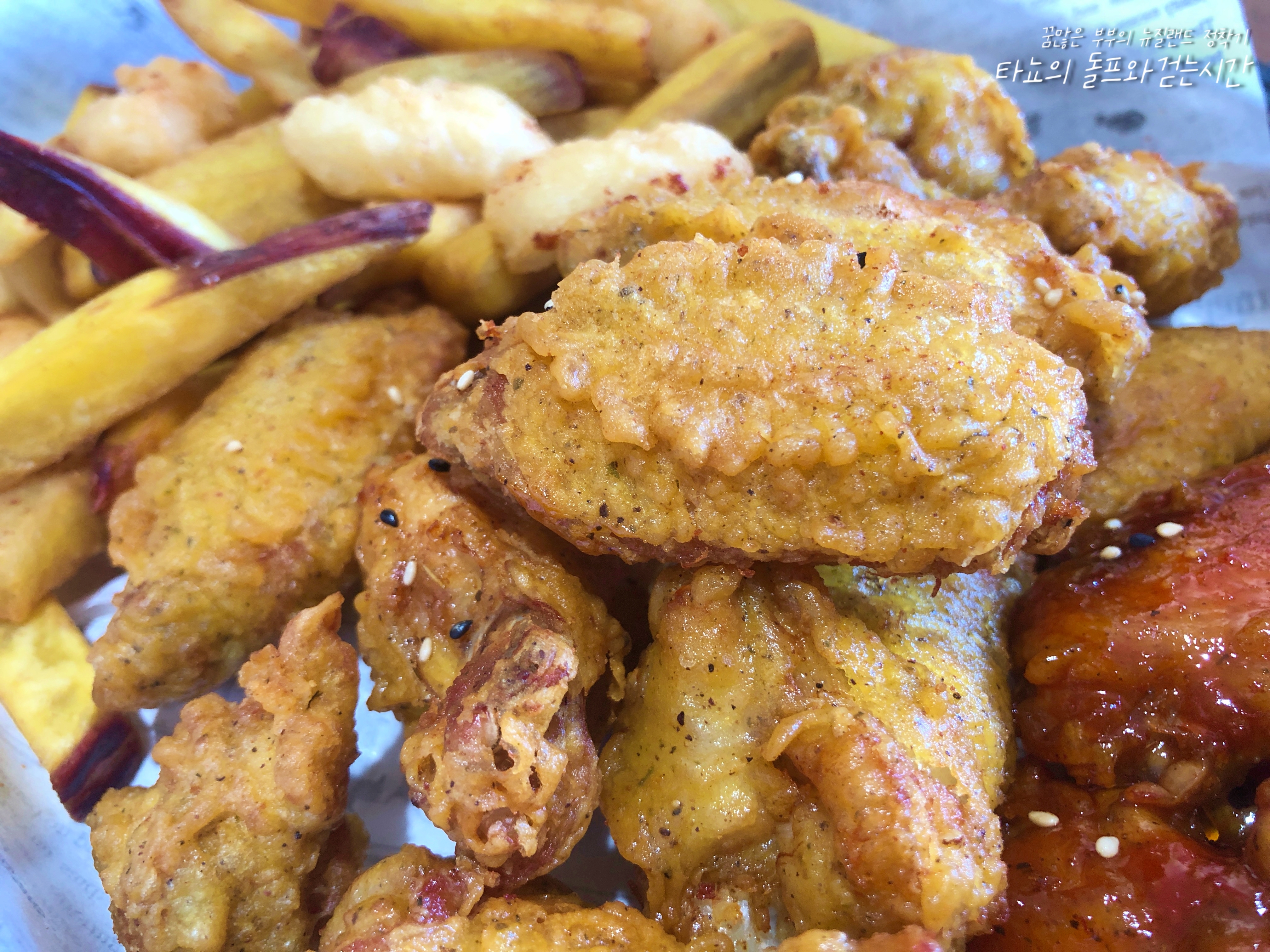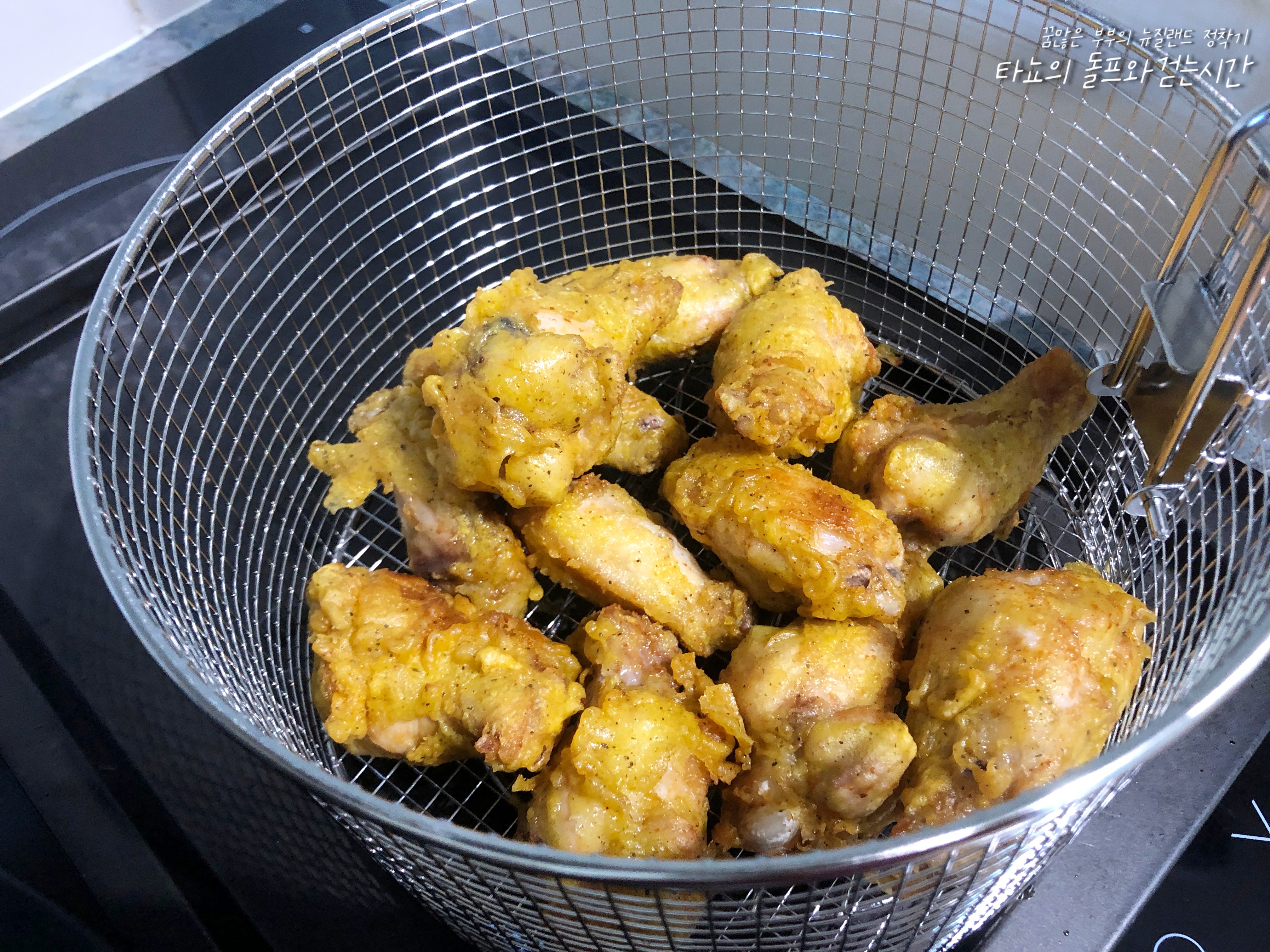 반죽을 하고 닭을 버무려 1차로 튀기고 2차로 또 튀기고 고구마 칩스와 떡튀김도 함께 넣어 튀겼습니다. 어제는 신랑과 둘이서 먹었지만, 오늘은 플랫 메이트 J도 함께 먹을 거라서 조금 더 넉넉하게 준비했어요.