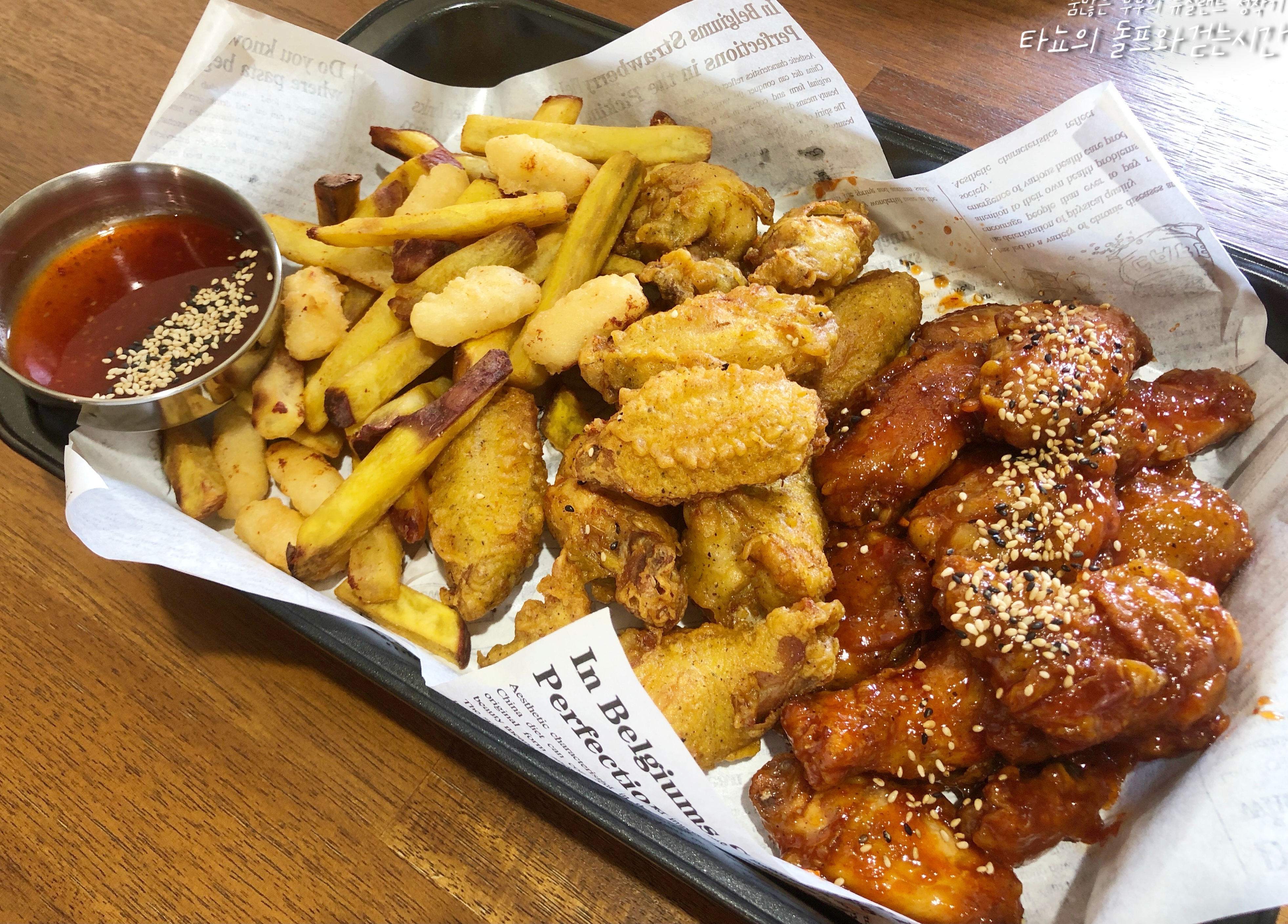 한 번에 다 담을 예쁜 접시가 없어서 그냥 오븐 팬에 유산지 깔고 담았습니다. 고구마랑 떡 튀김, 후라이드 치킨 취향 따라 찍어 먹으라고 양념도 따로 부어서 준비했어요. 점심에 아주 배를 팡팡 두드리며 맛있게 먹었습니다.