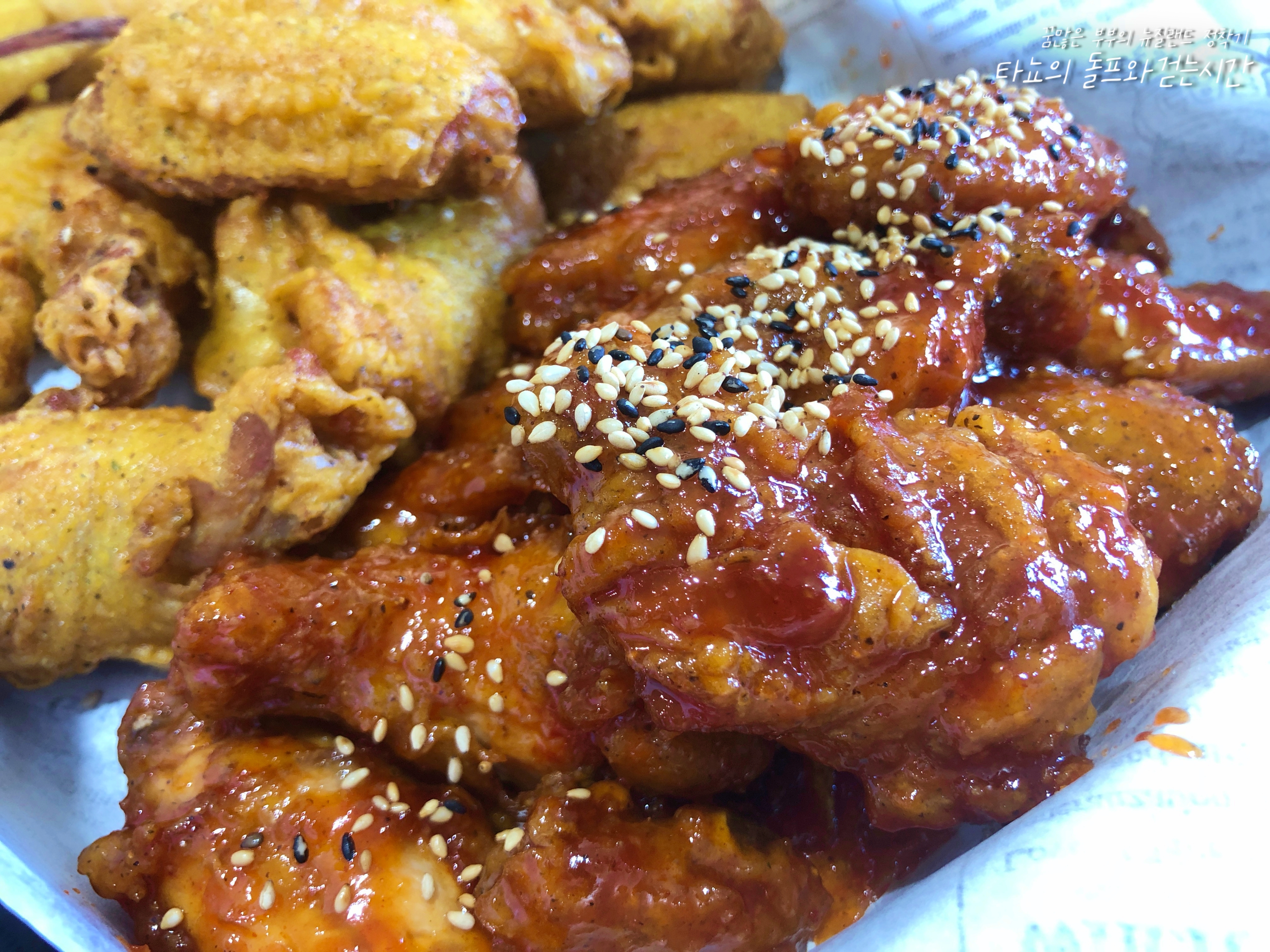 어제와 마찬가지로 아주 성공적으로 잘 튀겨진 양념 반, 후라이드 반 치킨입니다.