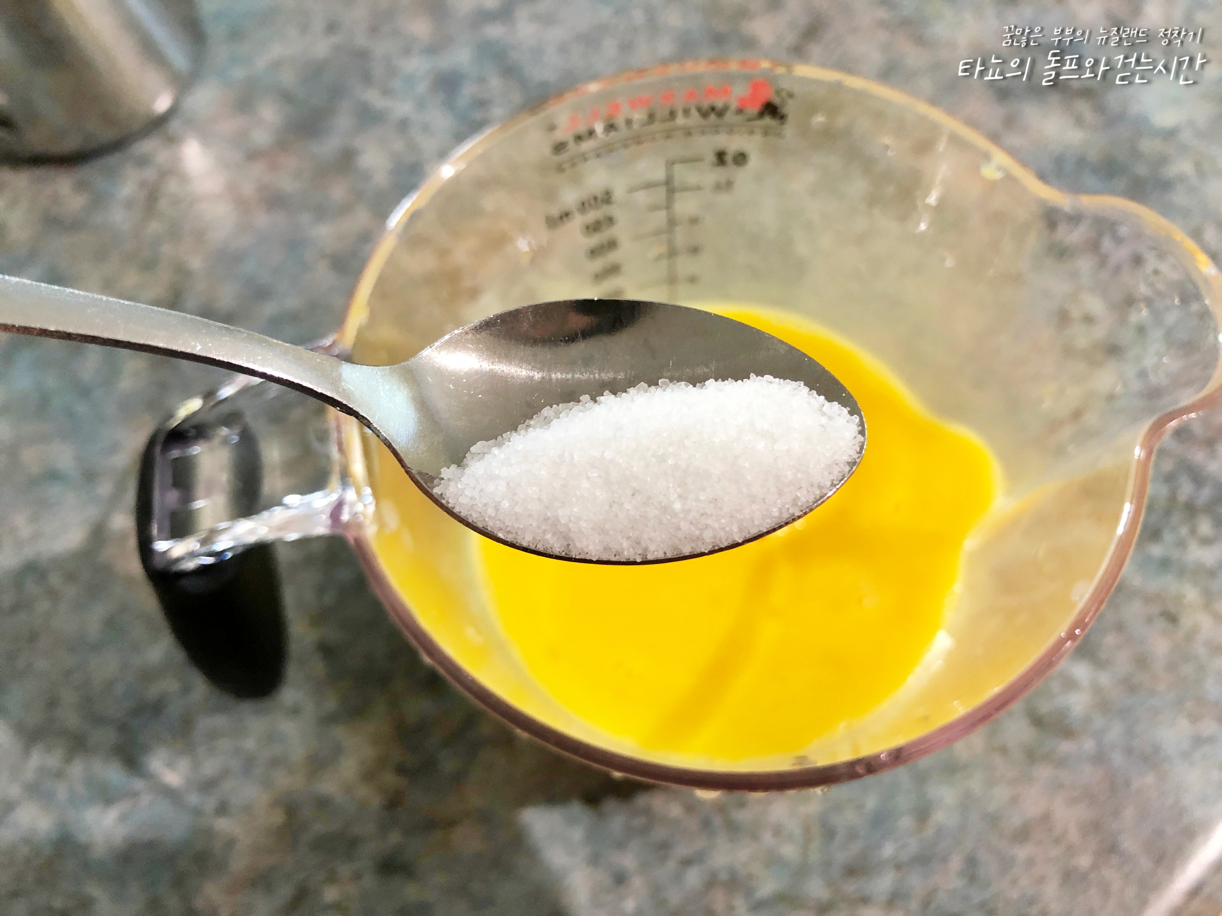 재료 : 달걀 4개, 물 40ml, 설탕 1/2 작은술, 소금 1/2 작은술, 다진 당근 2큰술, 다진 파 2큰술, 참기름, 참깨, 후추 조금