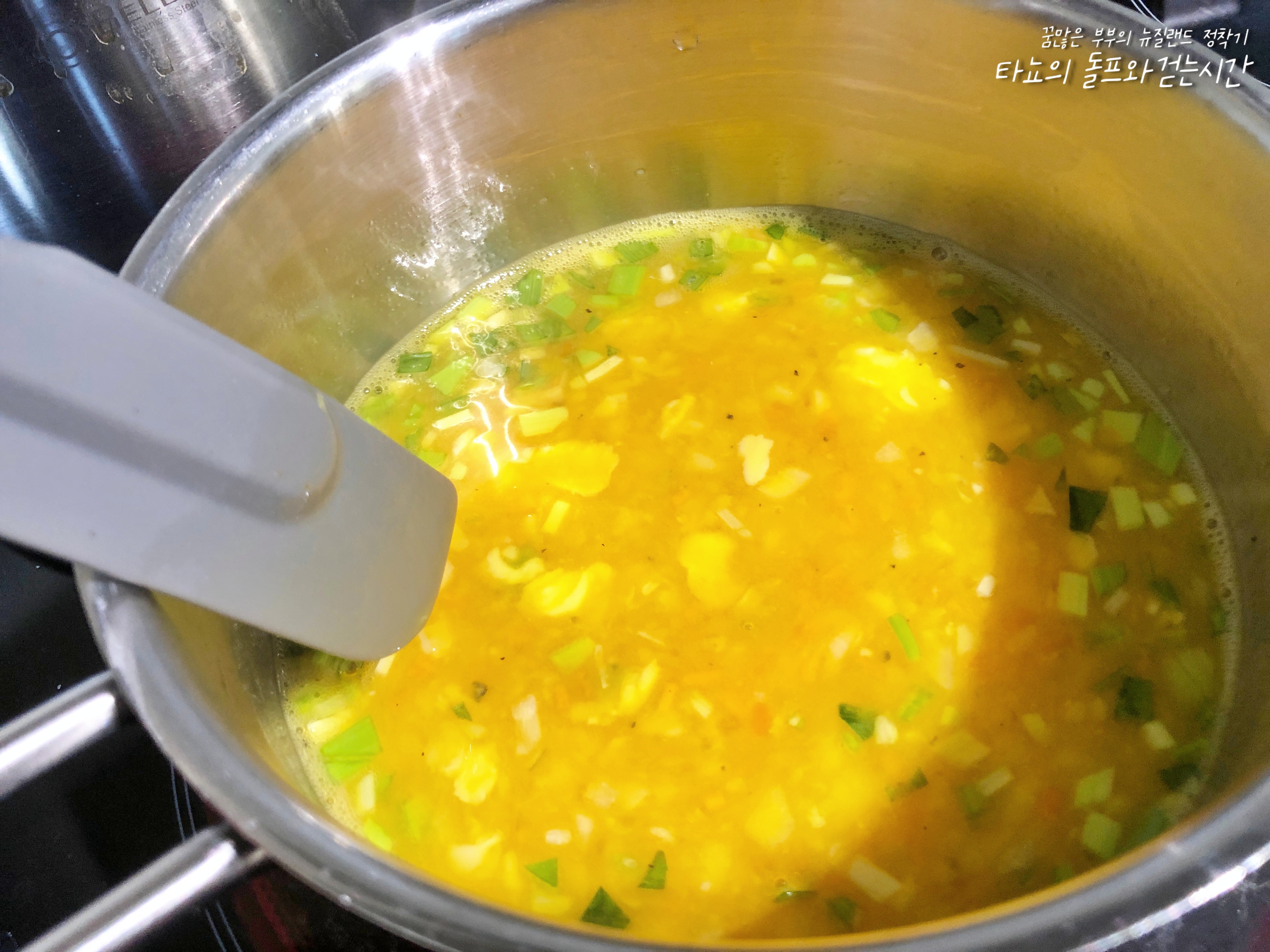 불을 올리고 꾸준하게 저어주세요. 언제 익나 싶지만... 어느 순간 순식간에 익어버립니다. 계속 저어주다보면 몽글몽글 조금씩 뭉쳐지는 계란의 모습을 발견할 수 있습니다. 이때부터는 더 눈을 떼지 말고 열심히 저어주세요.