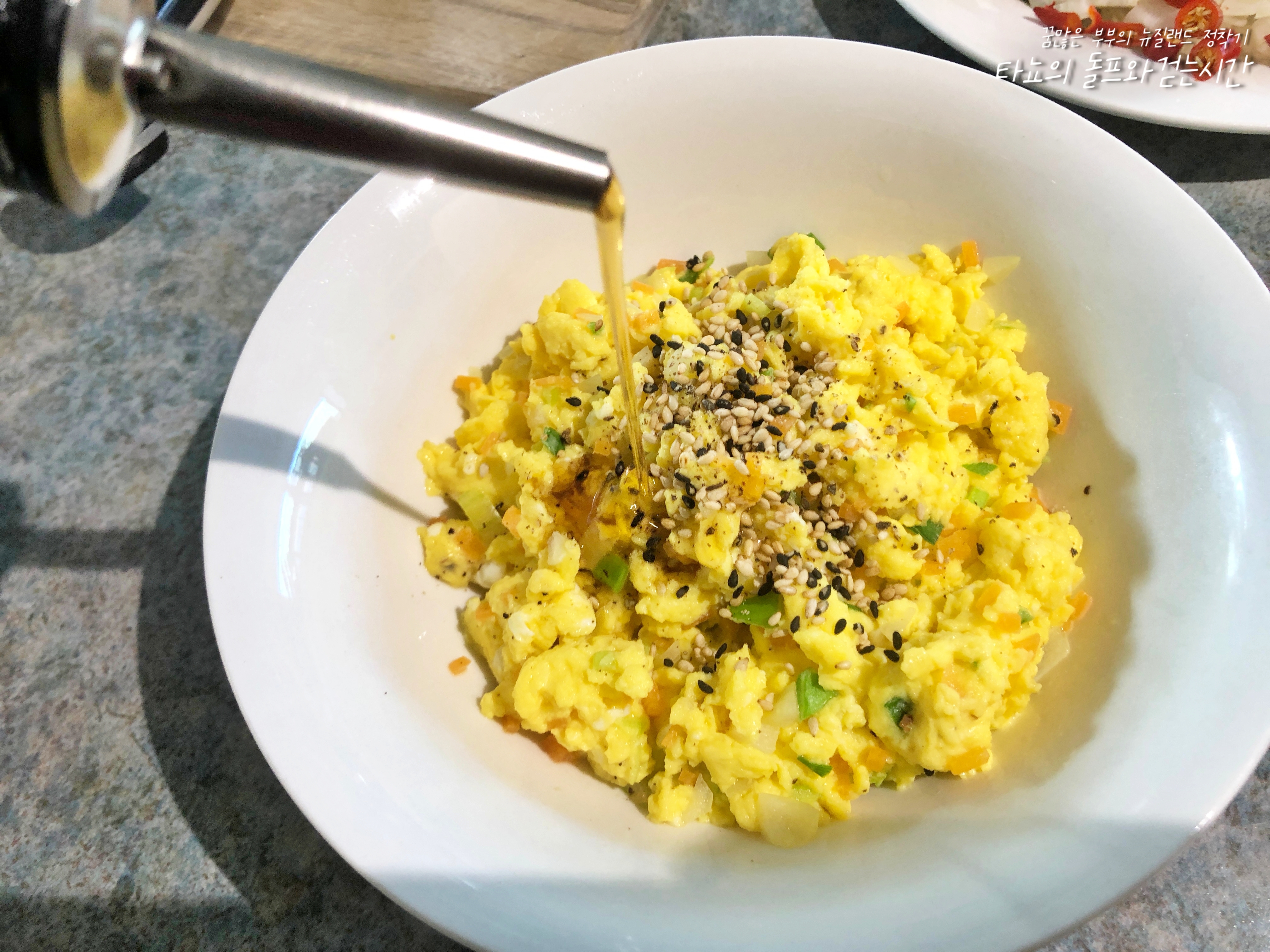 약간 스크램블 같은 느낌도 나는데요. 차이가 있다면 식용유를 두르고 구운 계란이냐, 물 넣고 몽글몽글하게 익힌 계란이냐... 그거겠죠? 밥 위에 올려서 먹으니 아주 맛있었습니다. 달걀은 실패가 없죠.