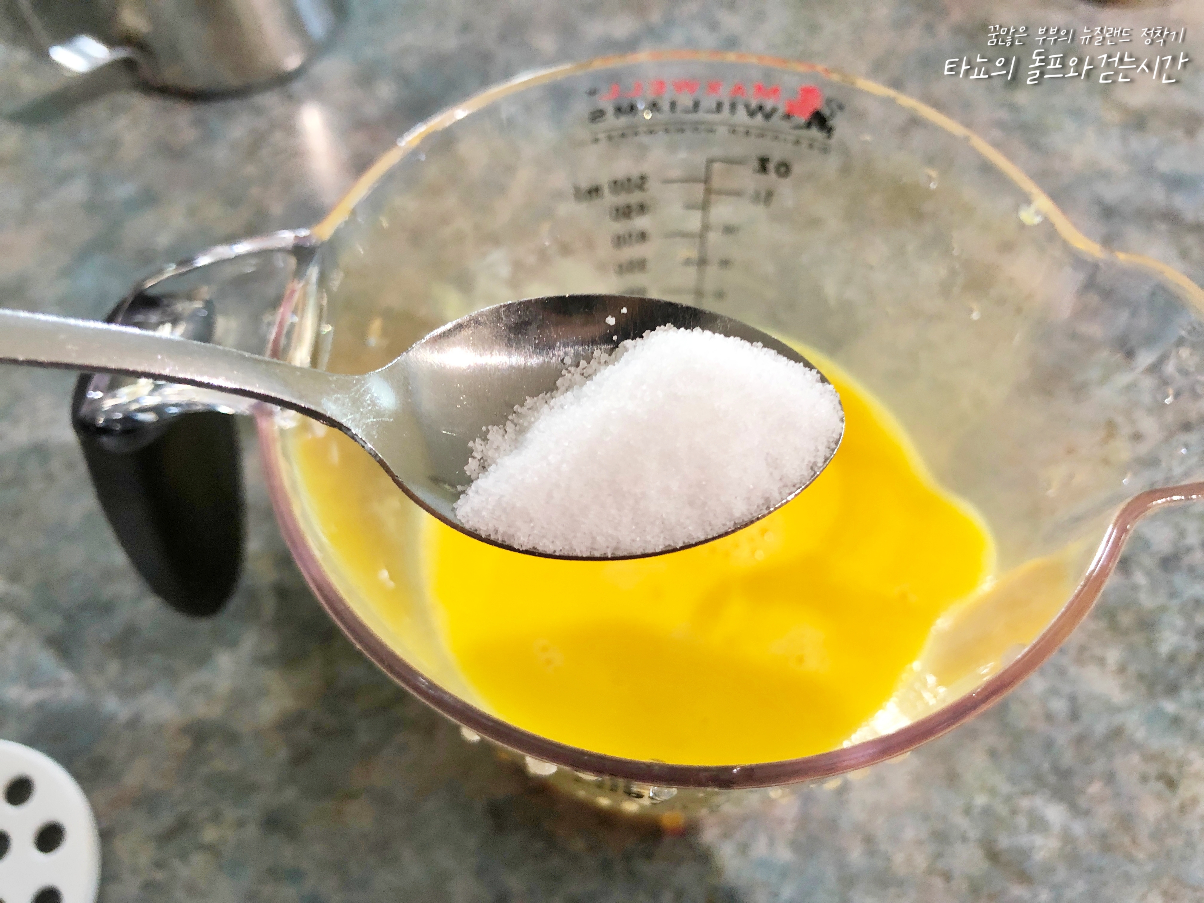재료 : 달걀 4개, 물 40ml, 설탕 1/2 작은술, 소금 1/2 작은술, 다진 당근 2큰술, 다진 파 2큰술, 참기름, 참깨, 후추 조금