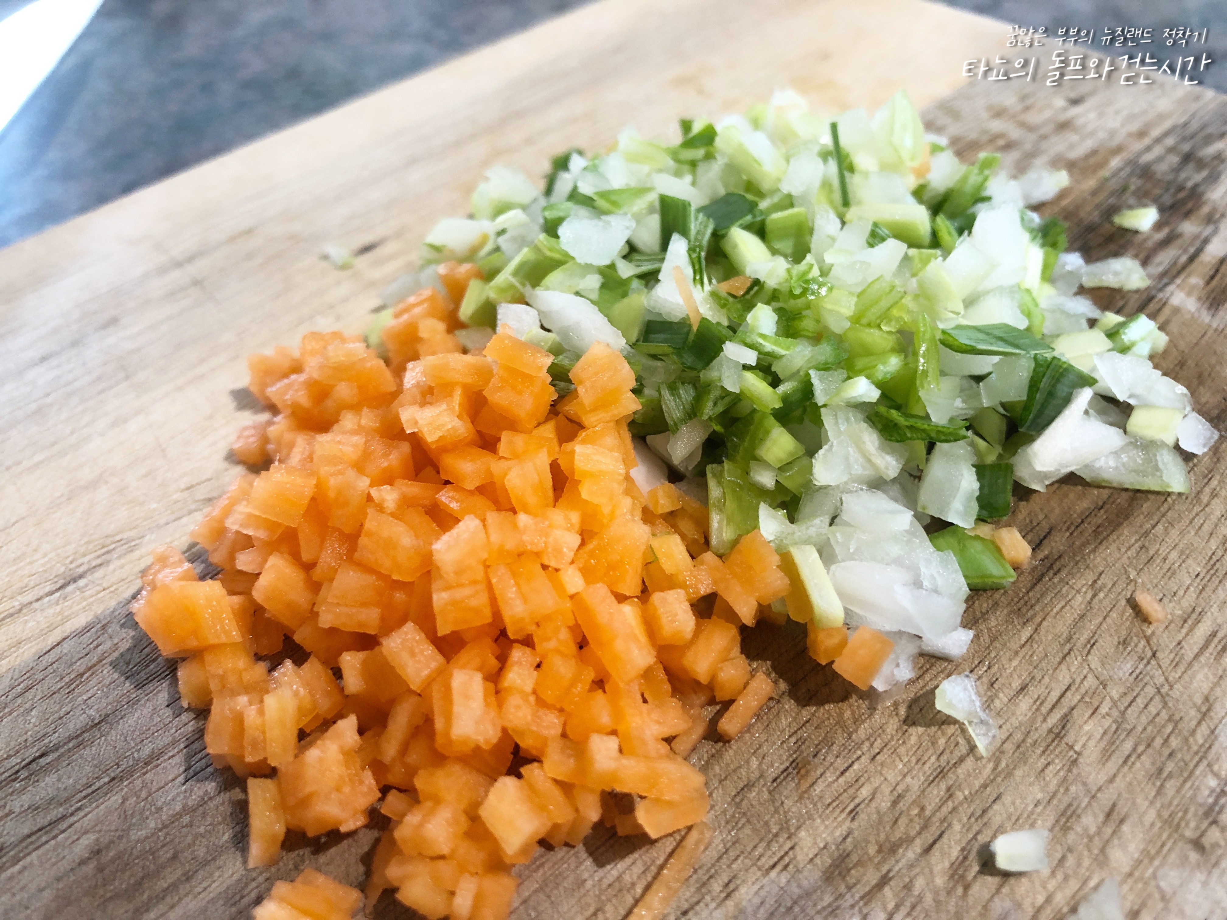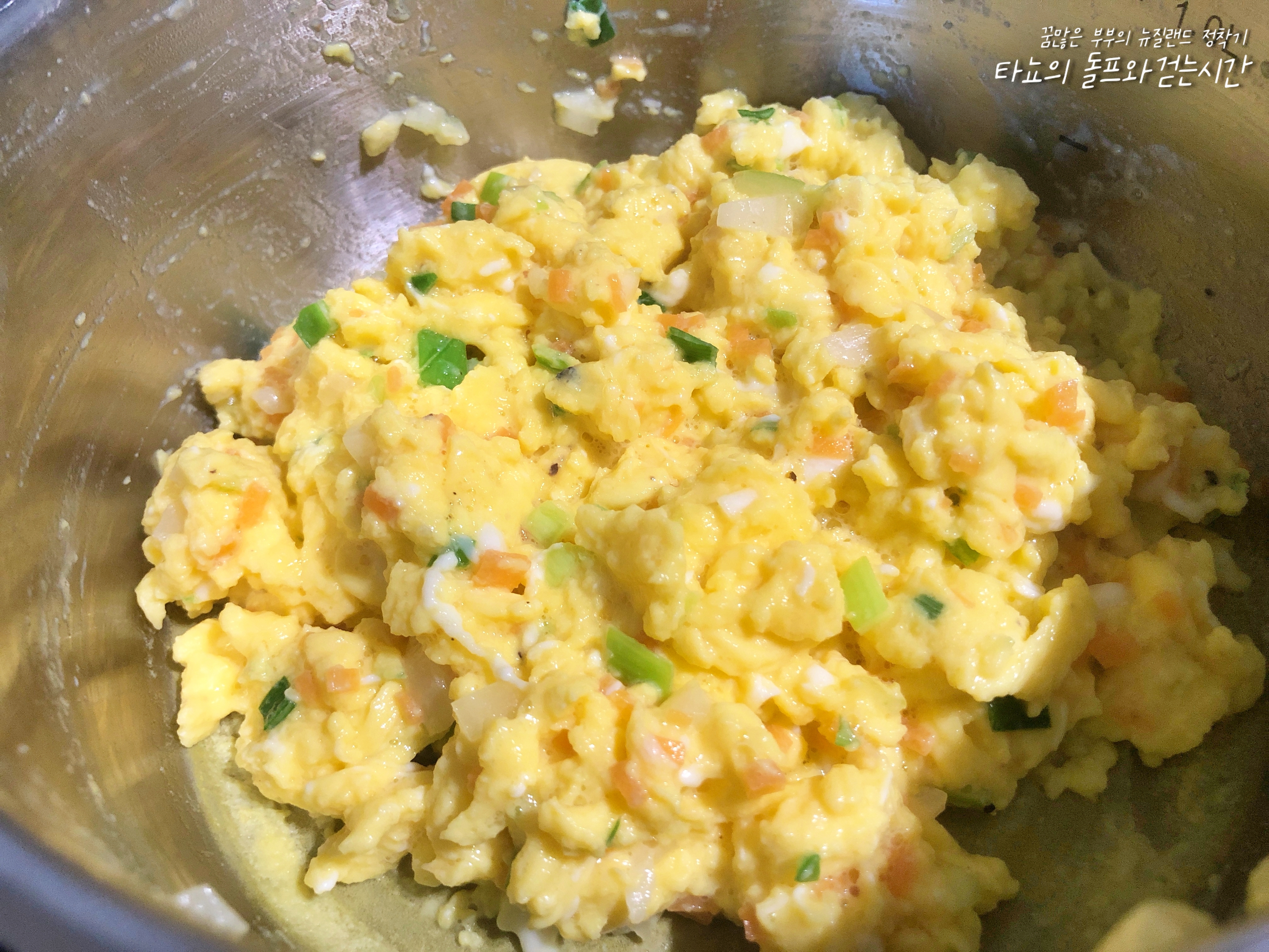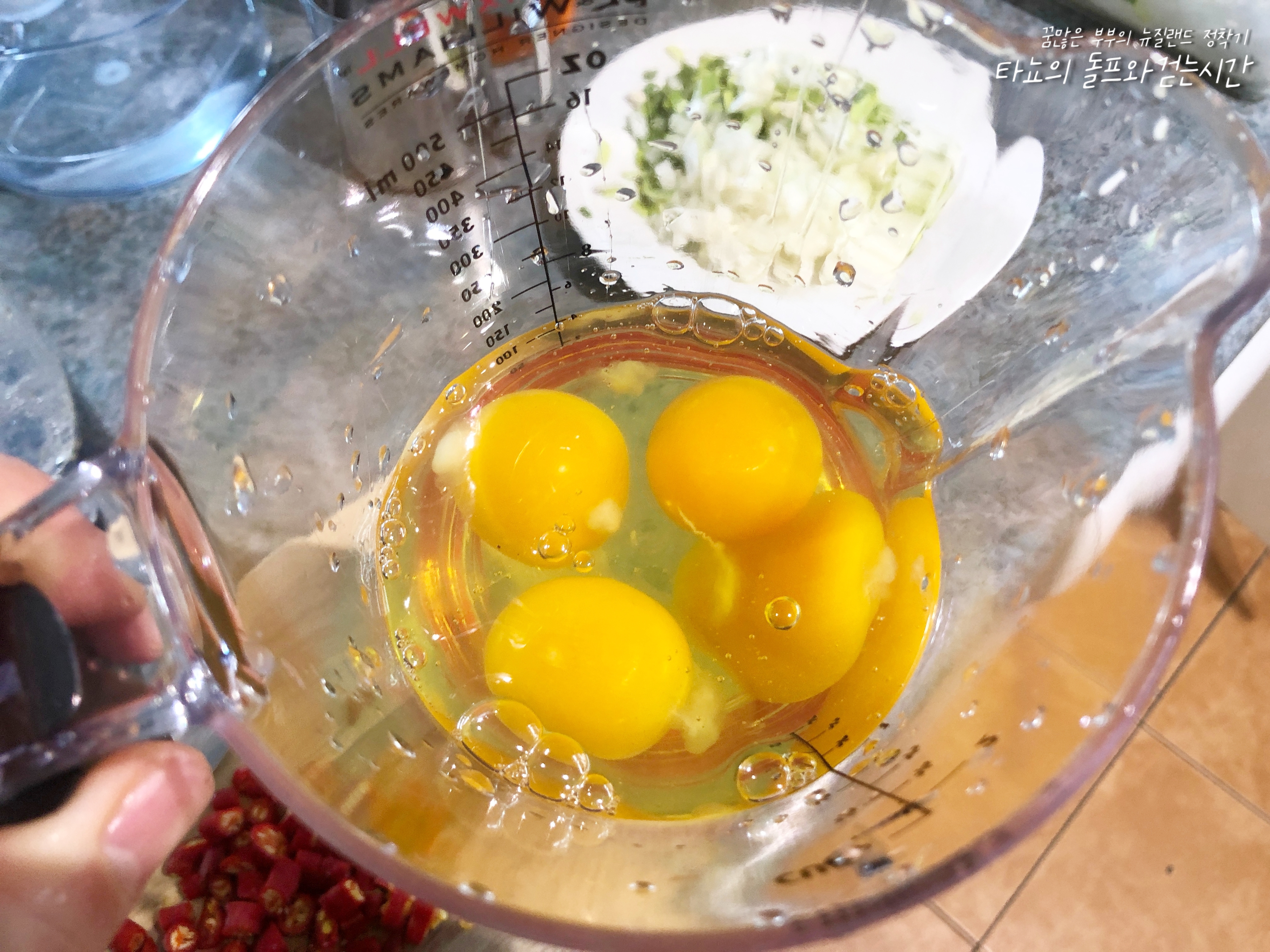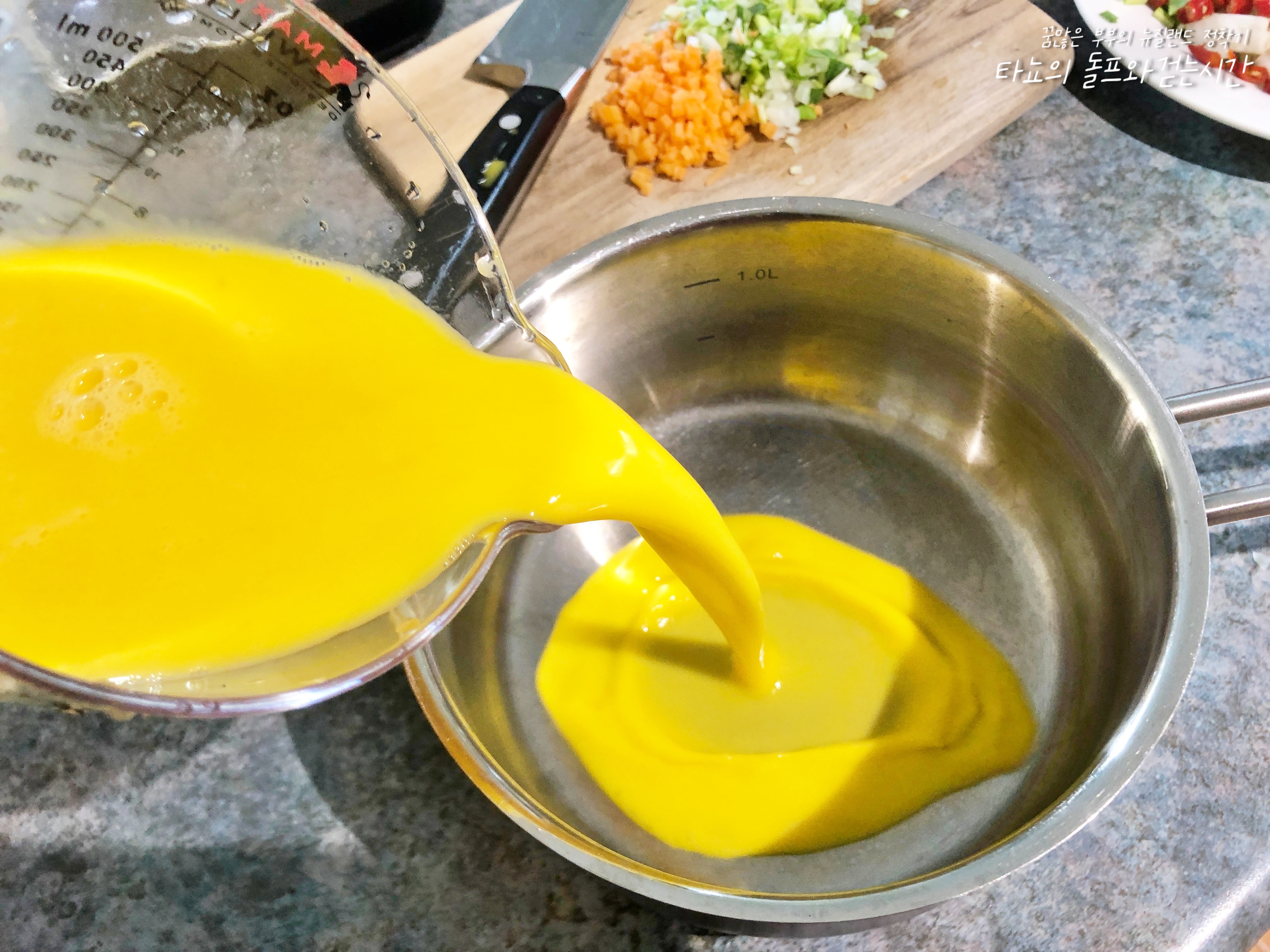 달걀 4개 풀어서 준비하고 야채는 작게 다져서 준비해주세요. 집에 야채 없으면 아예 없이 해도 괜찮아요. 달걀 알끈 제거하시려면 체에 한번 걸러서 준비해주세요. 저는 그냥 사용했습니다.