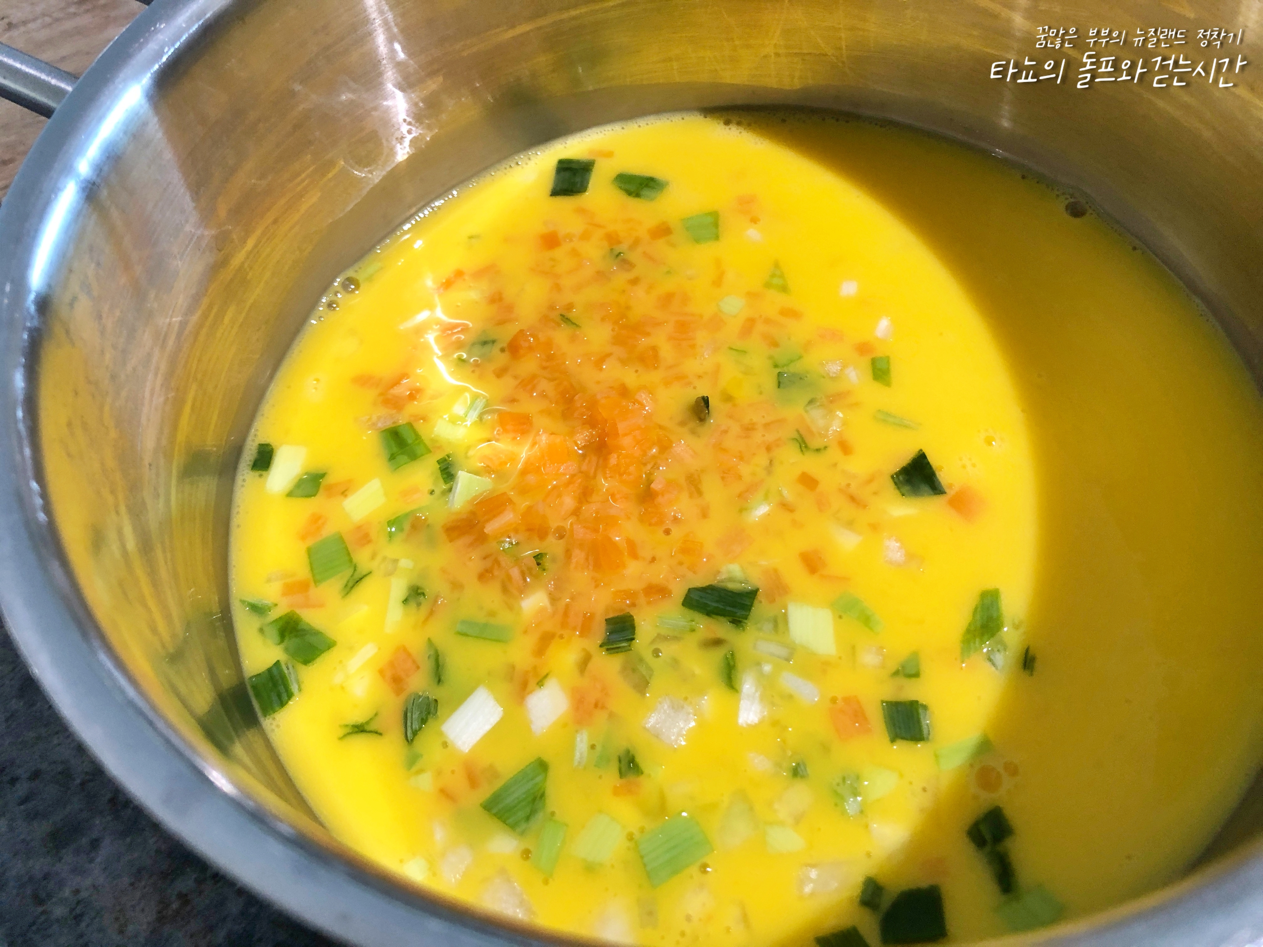 냄비에 달걀물 부어주고 야채도 함께 넣어주세요.