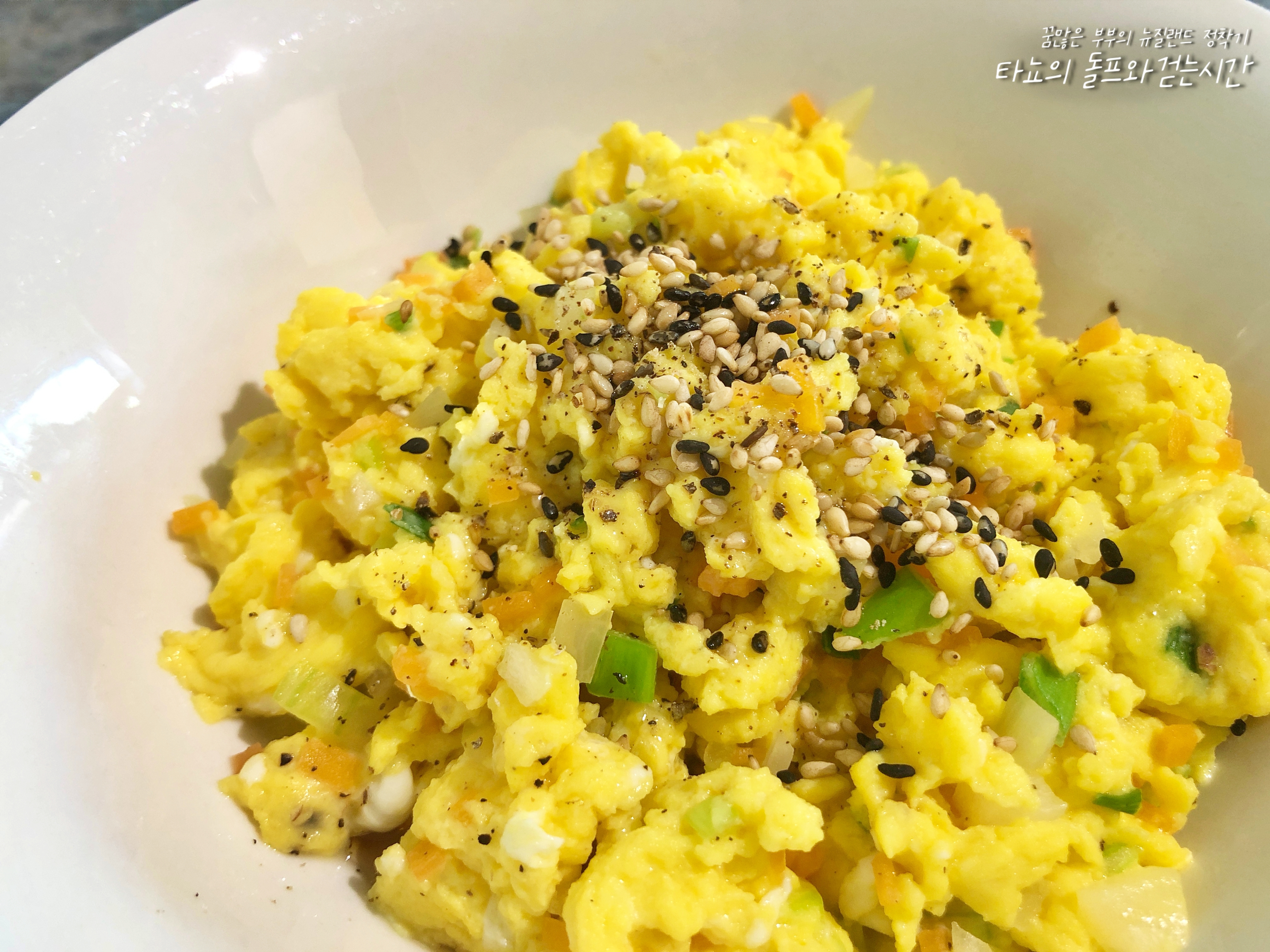 약간 스크램블 같은 느낌도 나는데요. 차이가 있다면 식용유를 두르고 구운 계란이냐, 물 넣고 몽글몽글하게 익힌 계란이냐... 그거겠죠? 밥 위에 올려서 먹으니 아주 맛있었습니다. 달걀은 실패가 없죠.