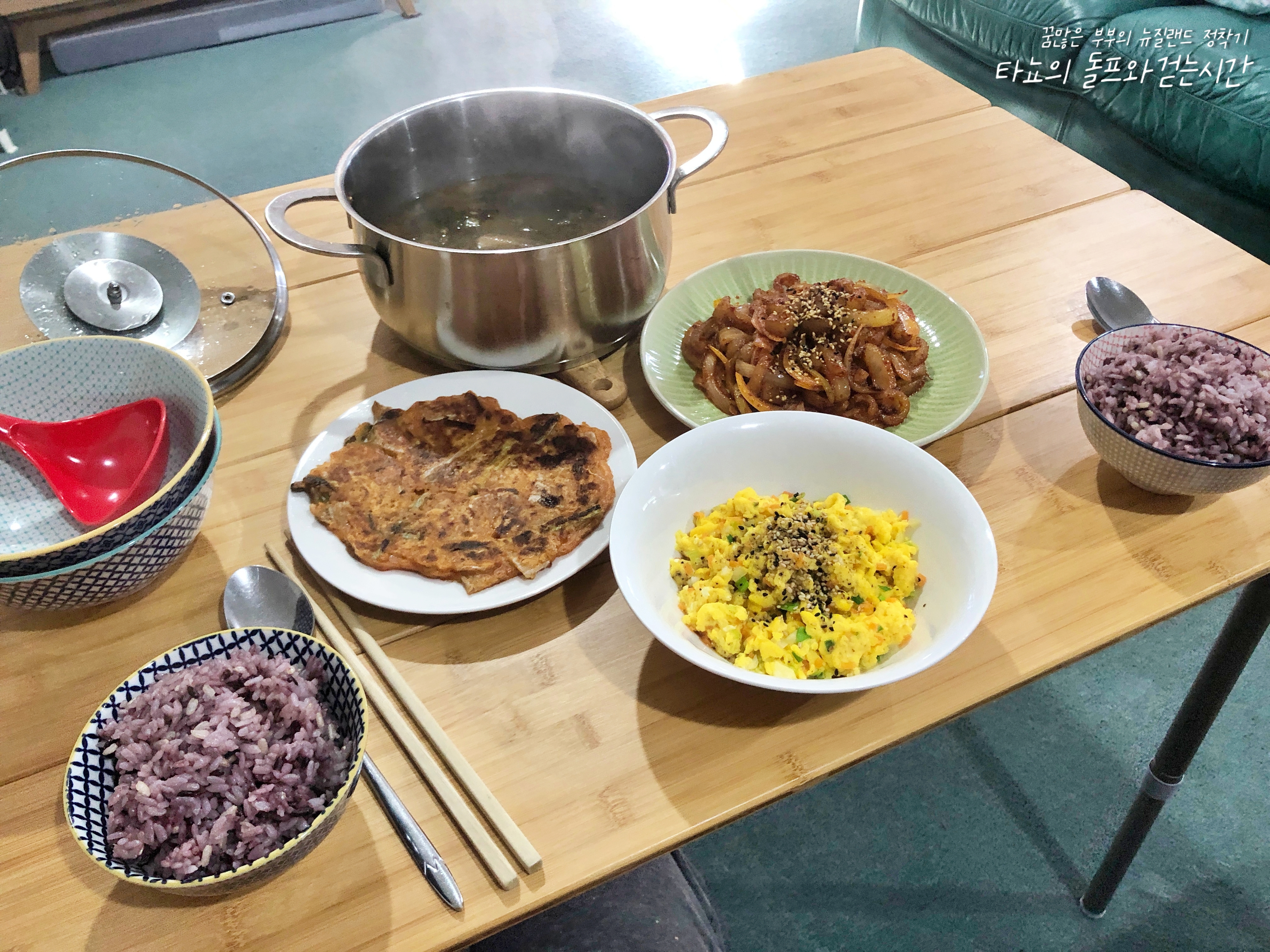 락다운이라 집에만 있으니까 식사는 더 잘 챙겨 먹어야죠. 시래기 된장국, 돼지껍데기 두루치기, 김치전, 달걀찜 만들어서 먹었어요.