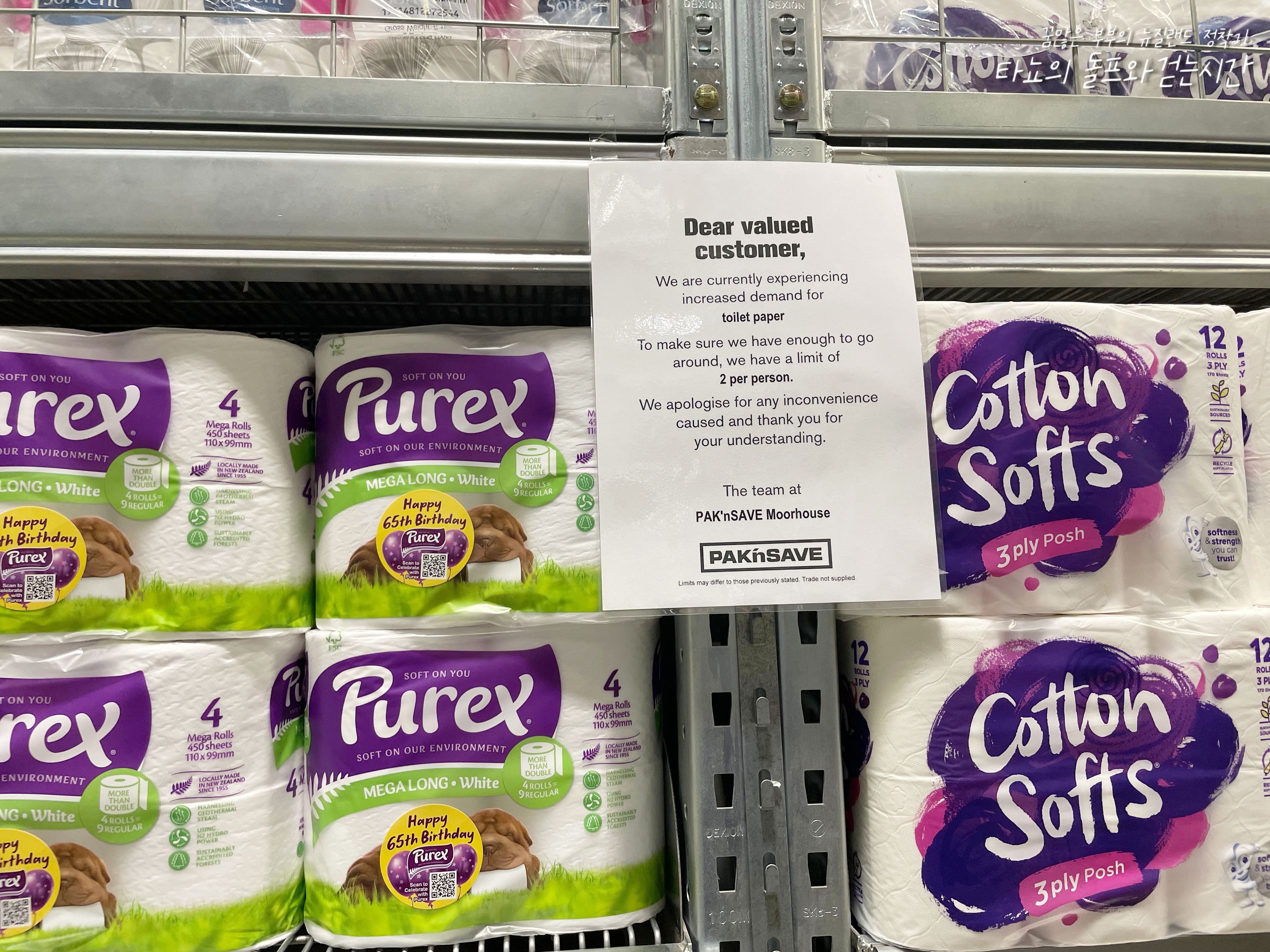 그리고 손님들에게 화장실 휴지는 한 사람에 2 봉지까지만 가능하다는 안내문이 붙어 있습니다. 이런 안내문은 휴지 코너와 파스타, 빵 코너 등 사람들이 많이 몰리는 코너에 보통 붙어있습니다.