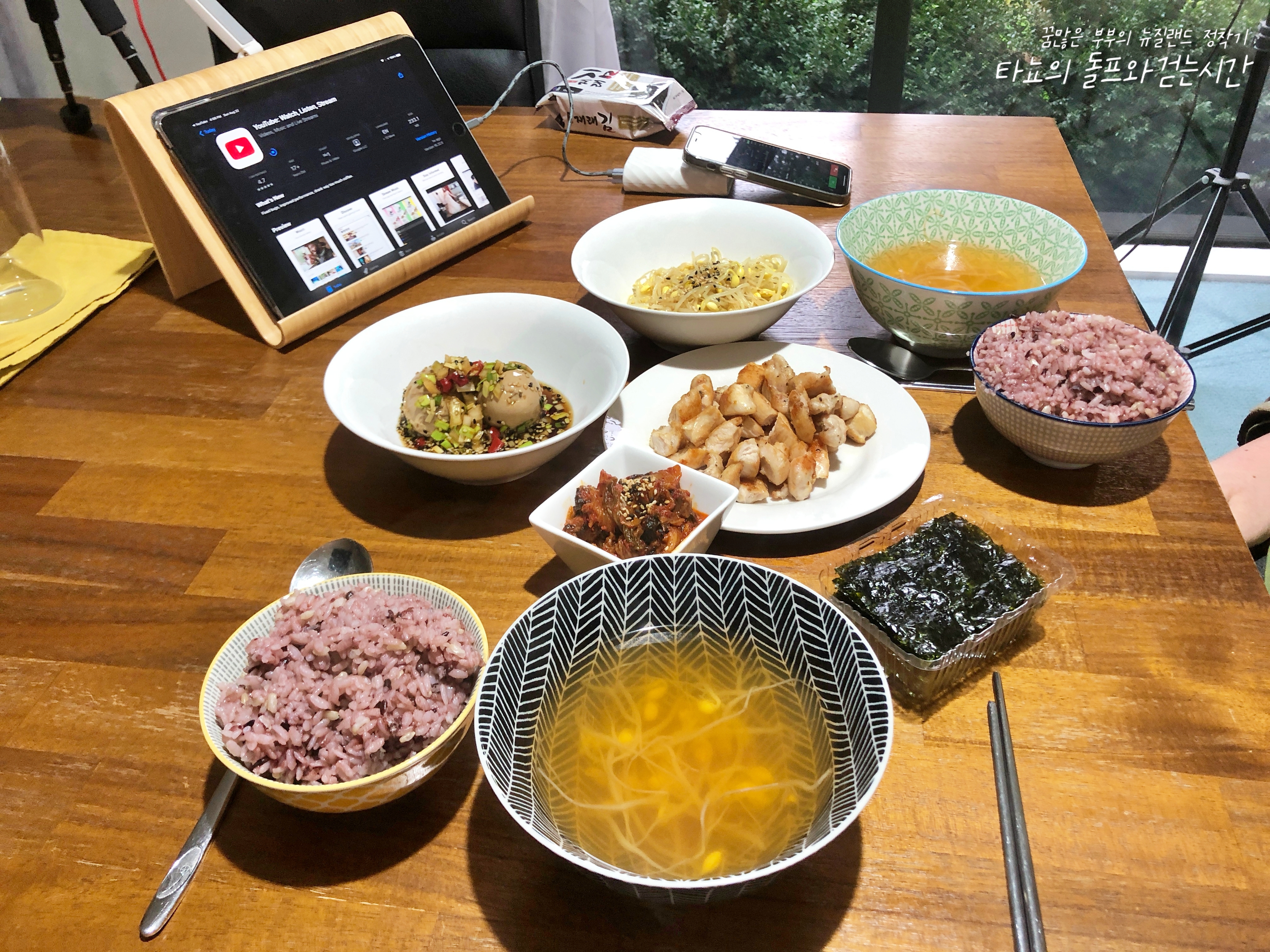 콩나물 국, 콩나물 무침, 마약 계란장, 김치볶음, 구운 치킨텐더, 김 차려서 저녁으로 먹었습니다. 계란장이 아주 꿀맛이었어요. 밥도둑!