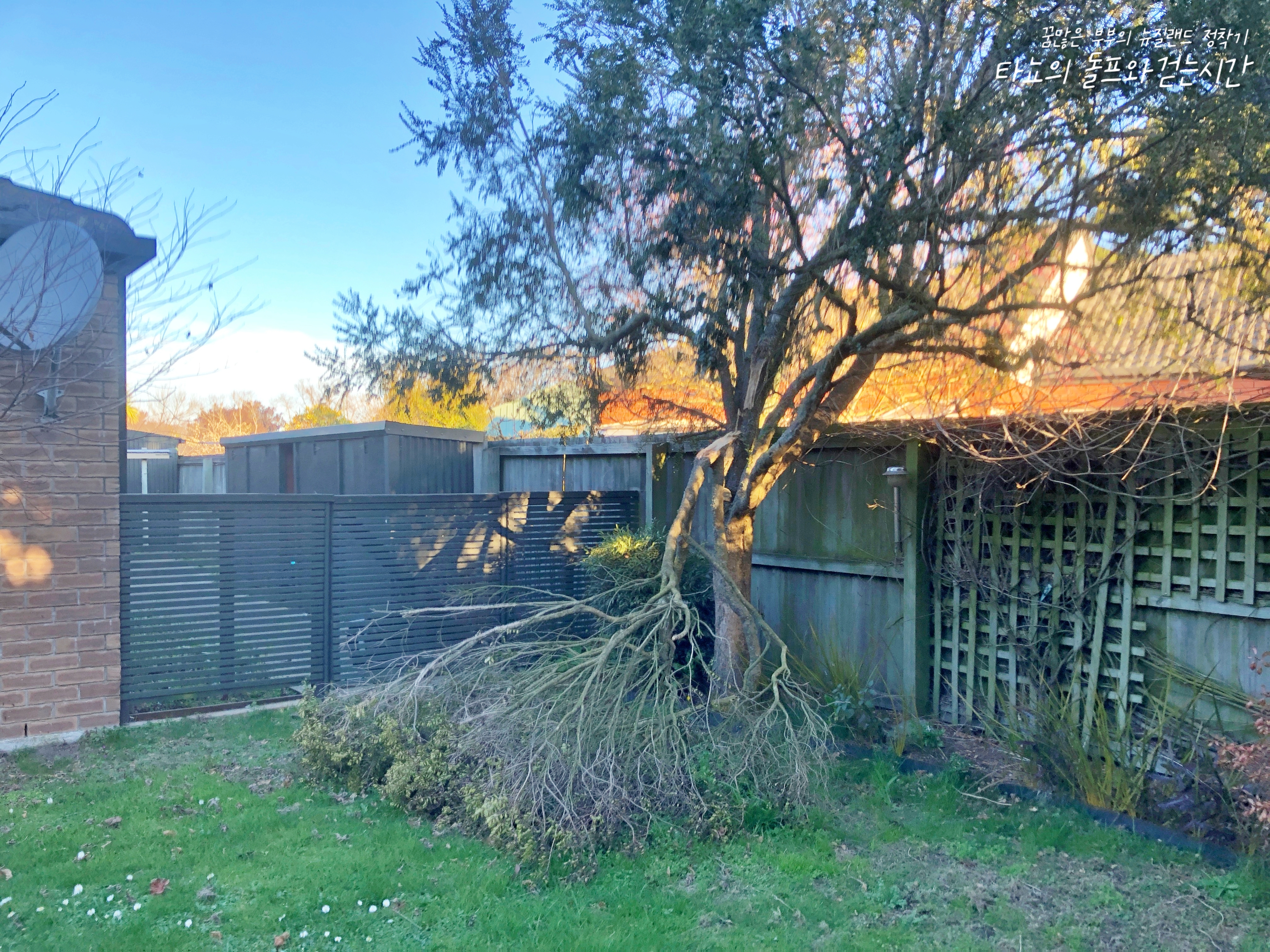 거센 바람이 불던 날 부러진 나무의 모습입니다. 사진으로 보면 부러진 나뭇가지가 작아 보이지만, 실제로는 저보다 훨씬 큽니다. 제대로 된 톱이 없는 저희는 저걸 어떻게 작게 잘라서 버려야 하나 싶습니다.