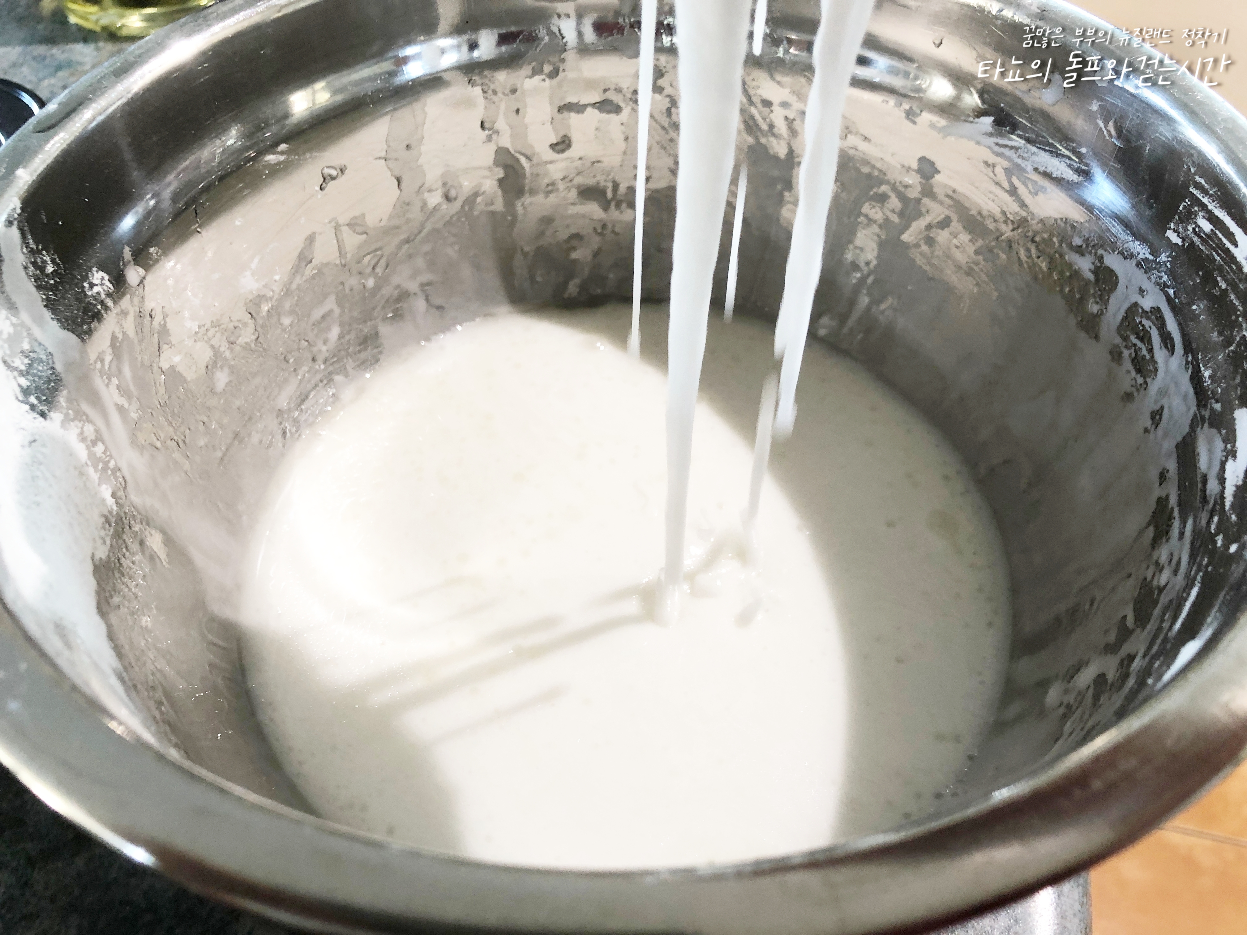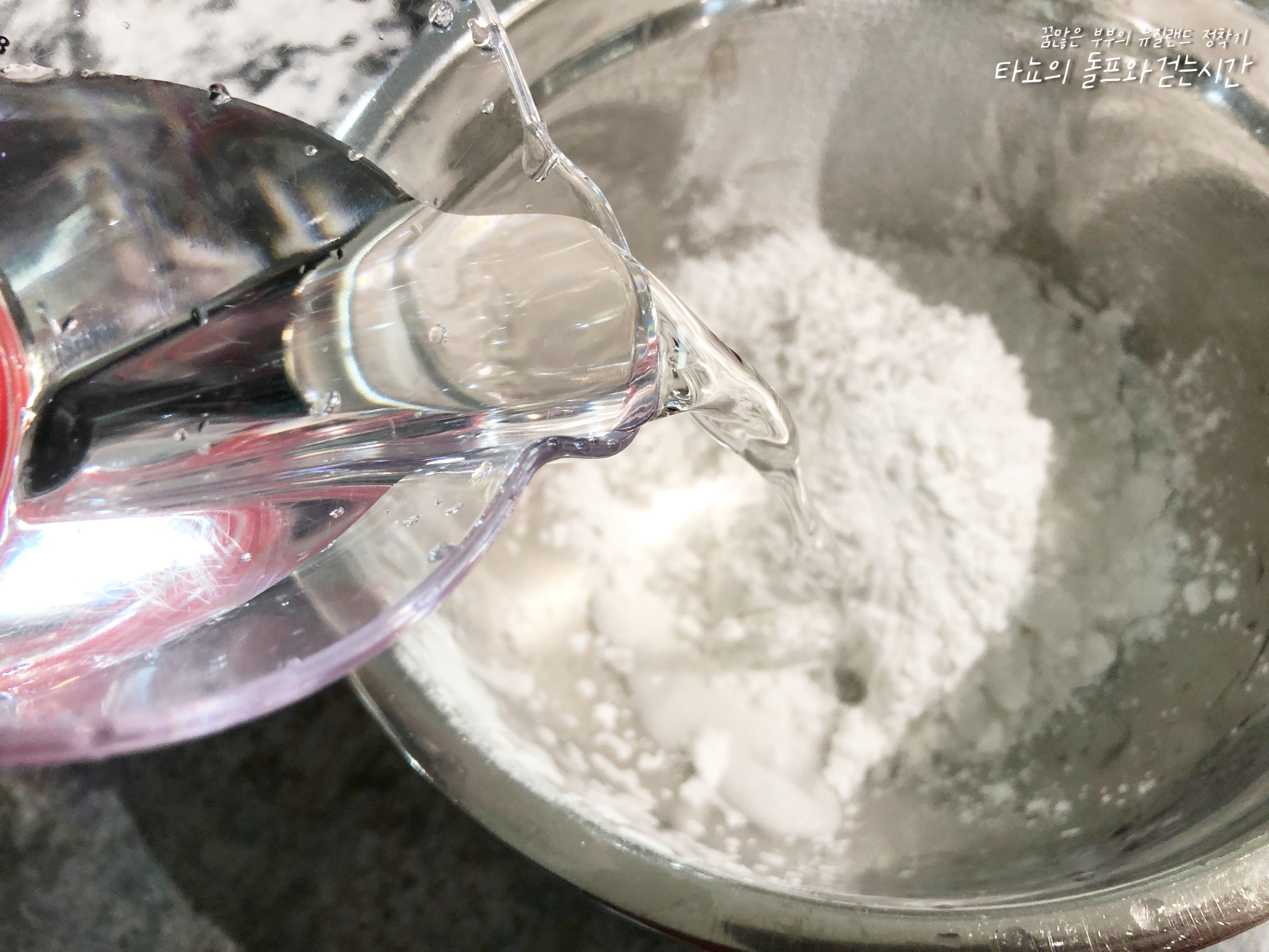 이제 반죽을 만듭니다. 전분가루와 찹쌀가루 섞은 것에 물을 넣어주고 잘 섞어준 다음 재빠르게 식용유를 부어 섞었습니다. 식용유 안 넣고 해 본 적 있는데 반죽이 너무 뻑뻑해서 손가락에 쥐 납니다. 식용유를 넣어줘야 약간 뭐랄까... 약간 굳은 마요네즈 만지는 것처럼 몰캉합니다.