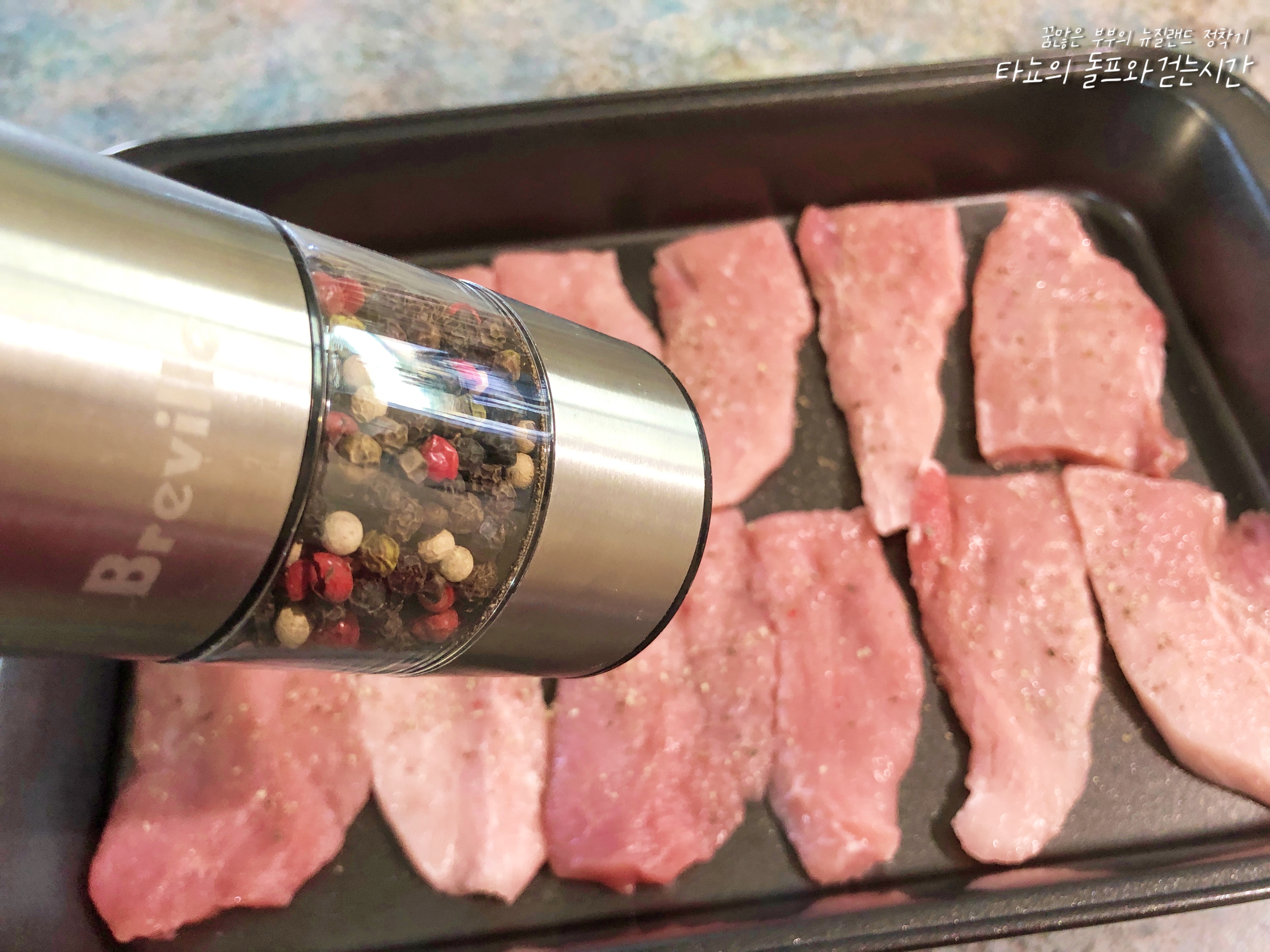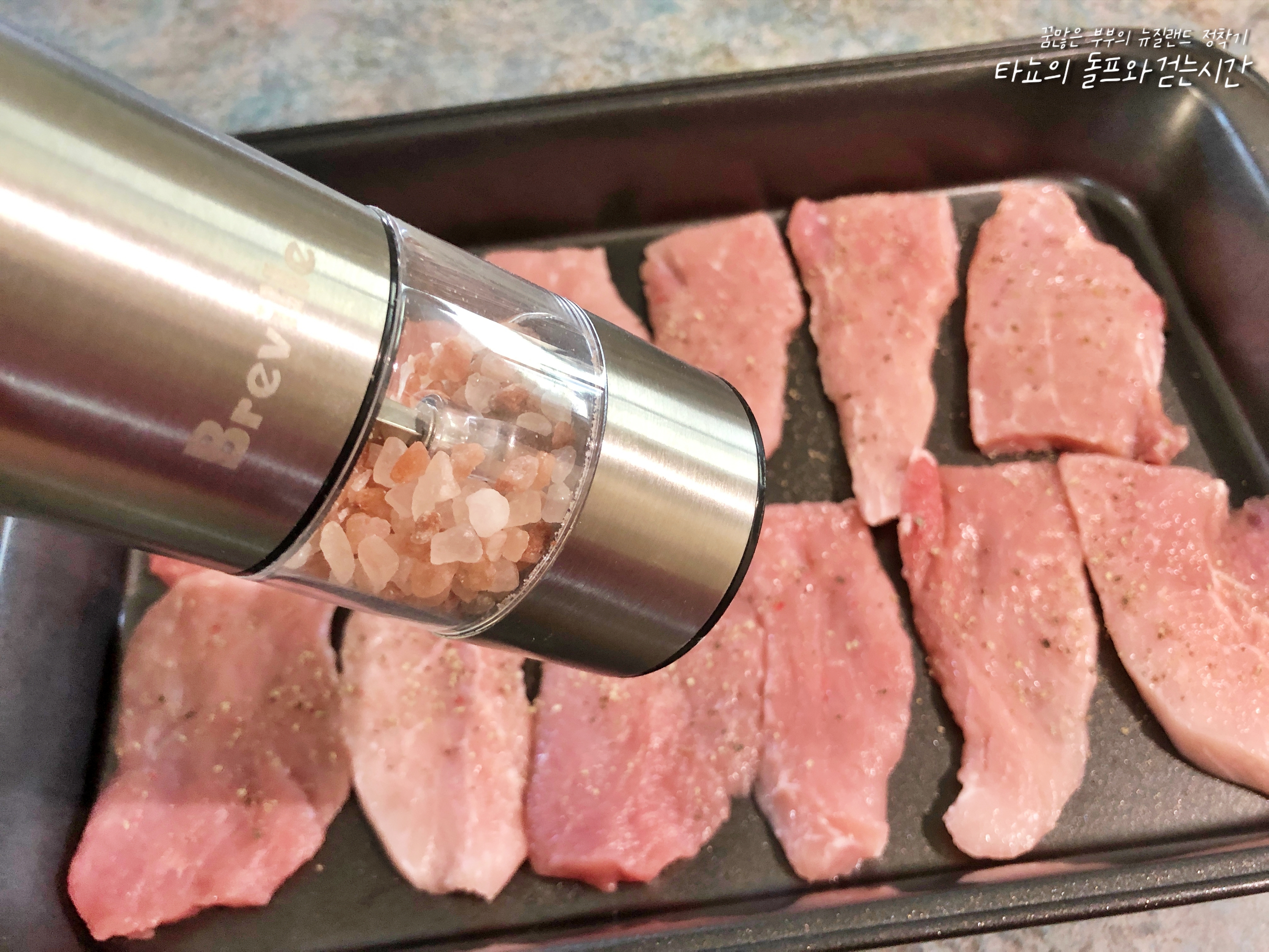 소금과 후추로 고기에 밑간을 했습니다. 어차피 소스 뿌려 먹을 거라서 소금은 살짝만 뿌려줍니다.