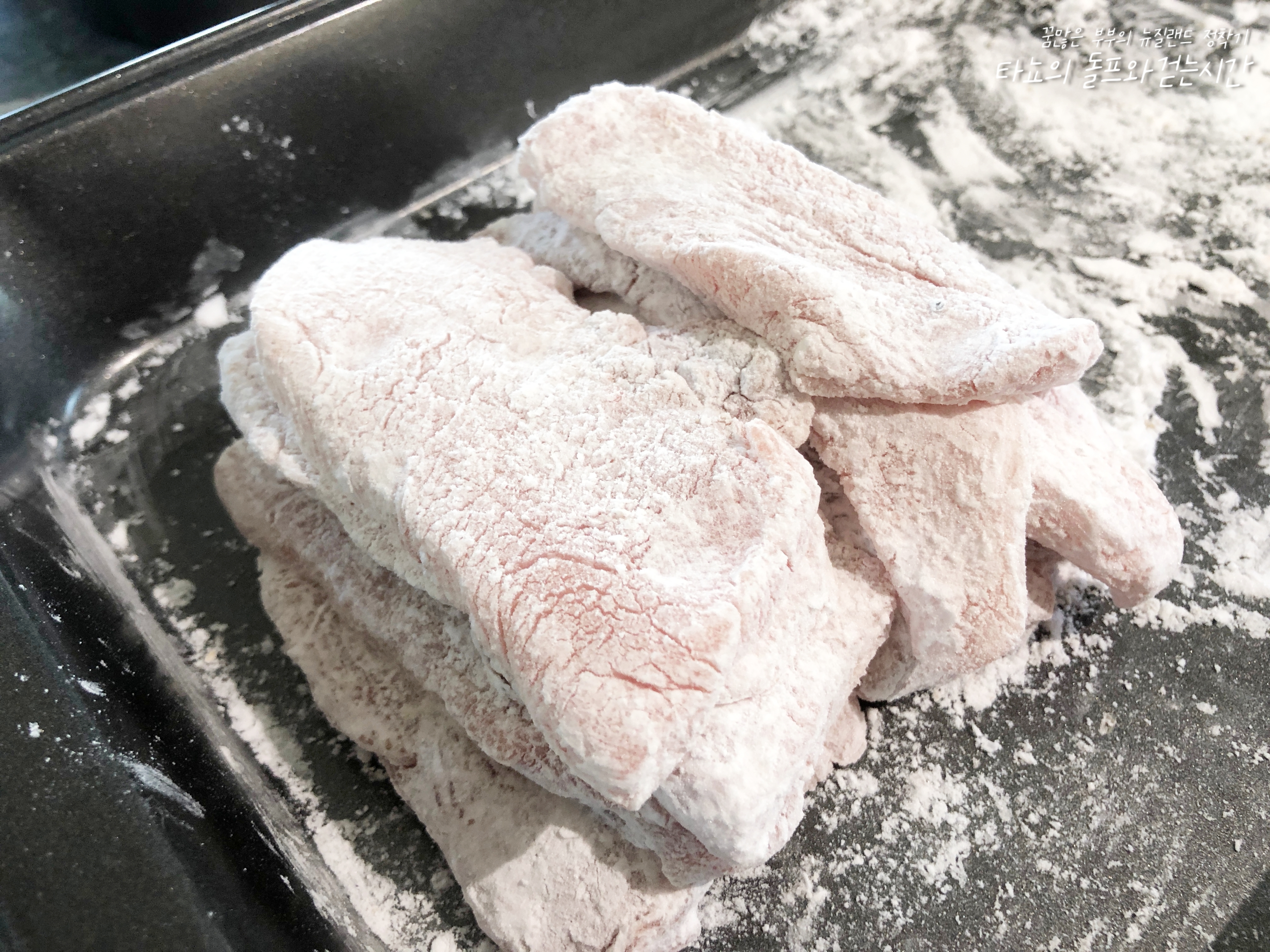 고기에 찹쌀가루 옷을 입혀줍니다. 만약 찹쌀가루가 없으면 전분가루 대체 가능합니다.