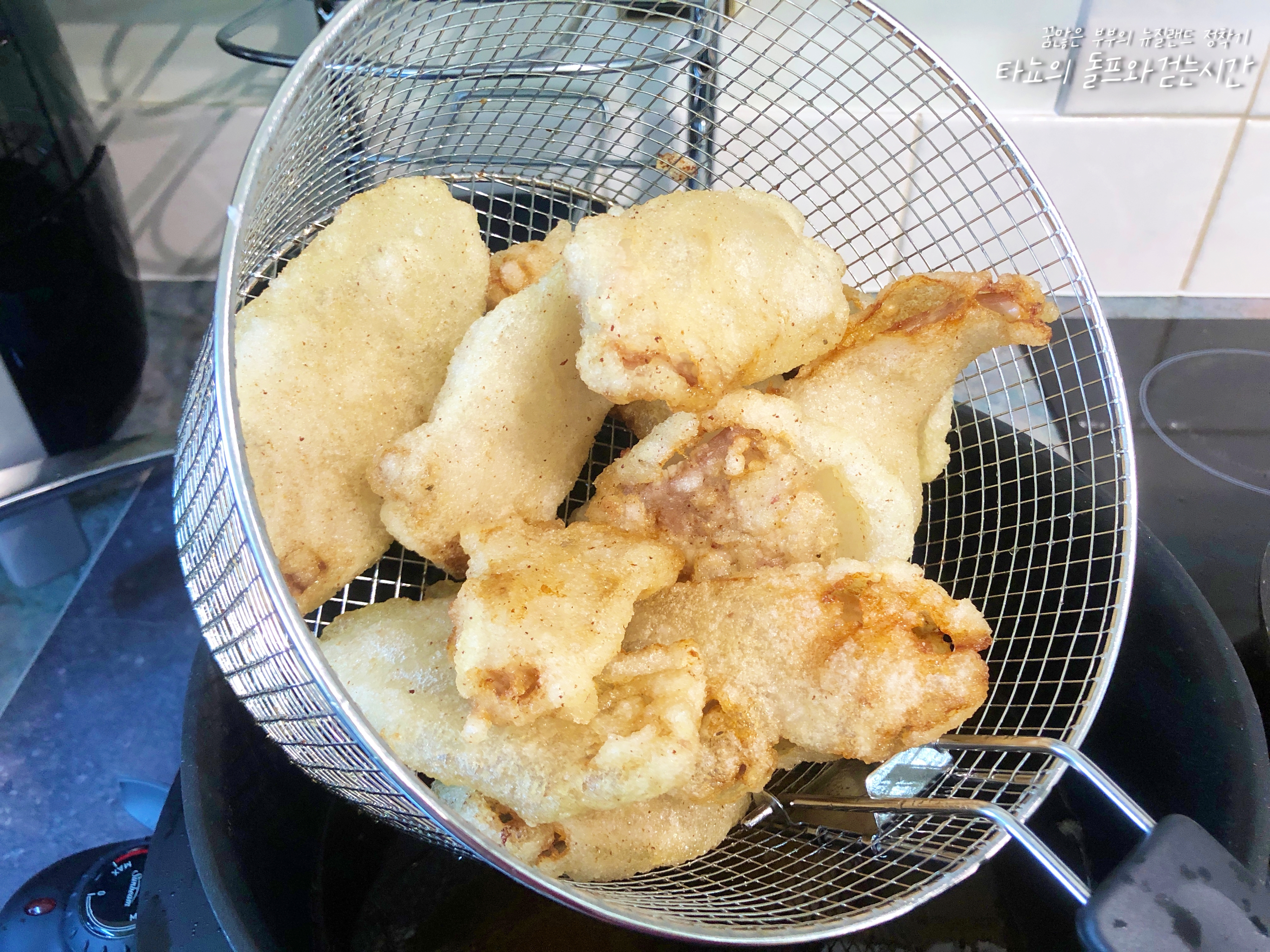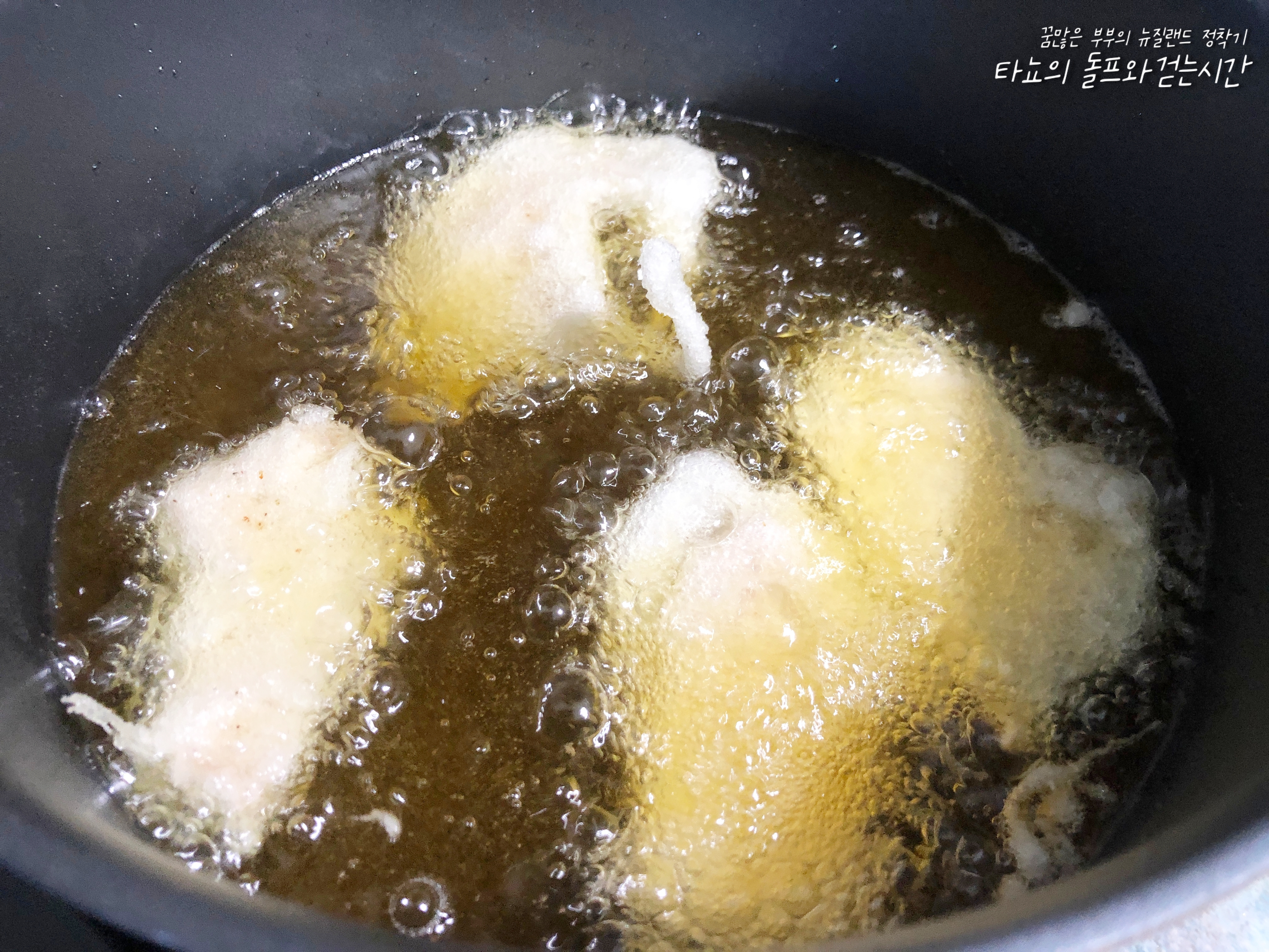 하지만 제 바람일 뿐, 뭔가 튀김이 오늘따라 더 두껍게만 보입니다. 꼭 갑옷을 입은 것만 같네요. 튀김이 동동 뜰 때 꺼냈습니다.