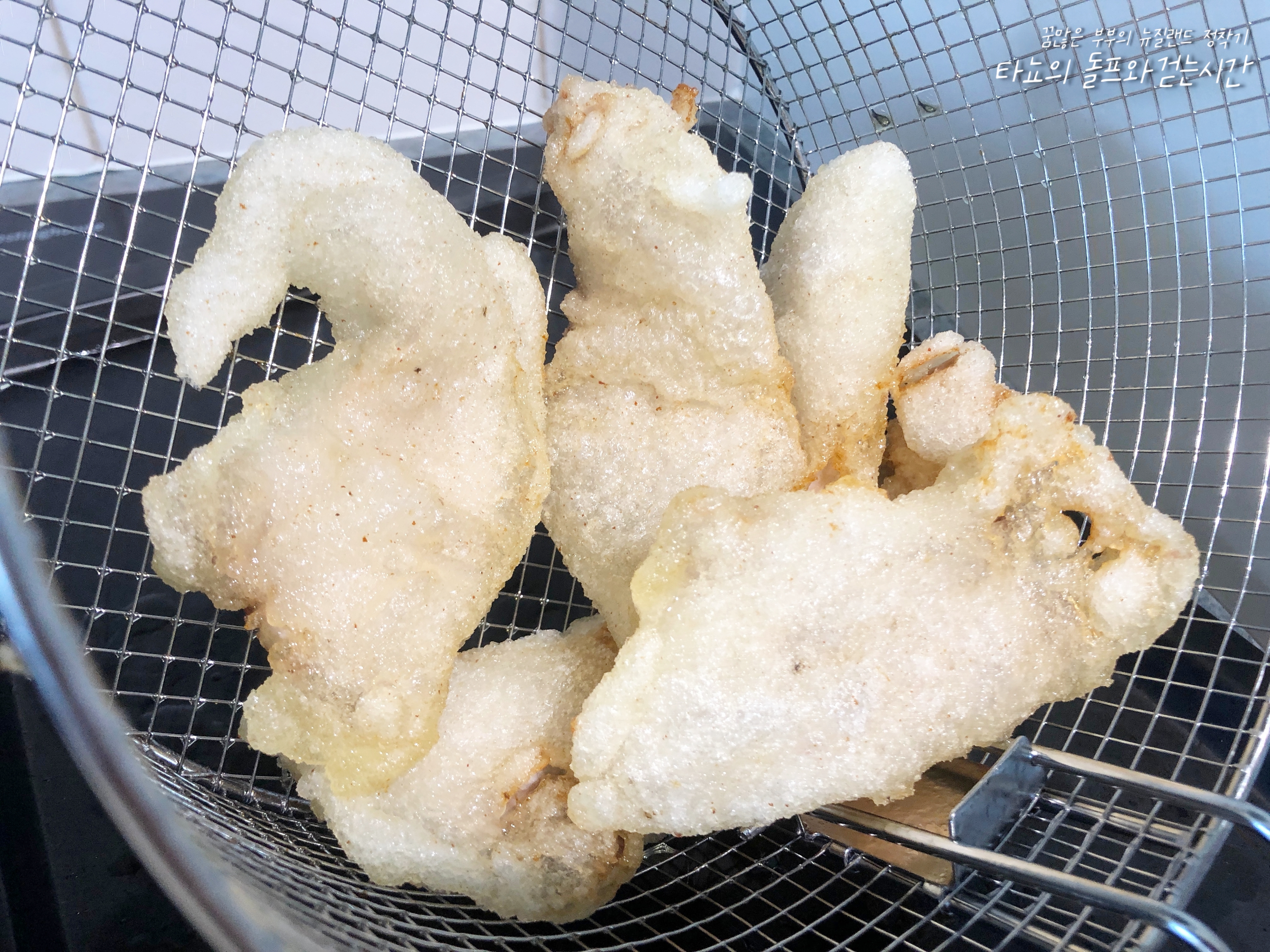 하지만 제 바람일 뿐, 뭔가 튀김이 오늘따라 더 두껍게만 보입니다. 꼭 갑옷을 입은 것만 같네요. 튀김이 동동 뜰 때 꺼냈습니다.