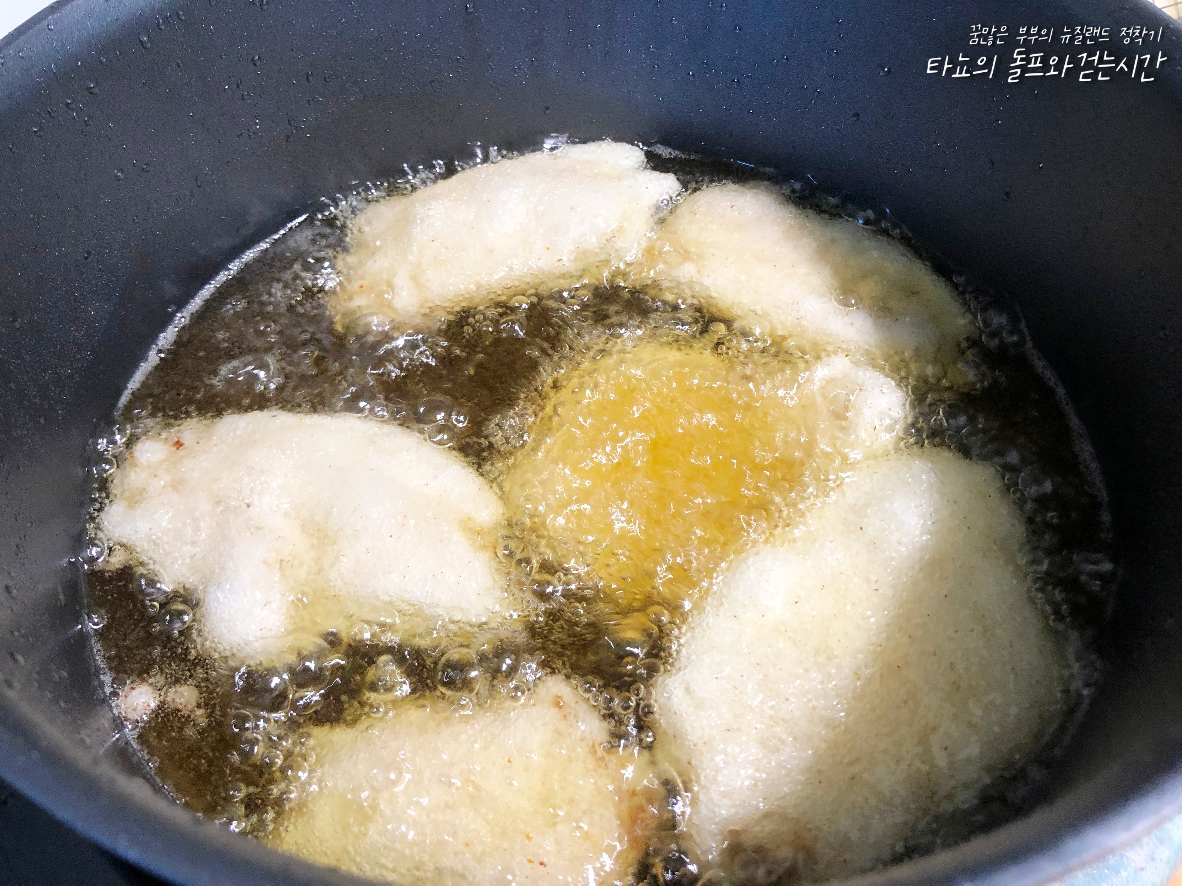 반죽을 얇게 하고 싶어서 최대한 속살이 보이게 반죽을 흘려준 다음 튀겼습니다.