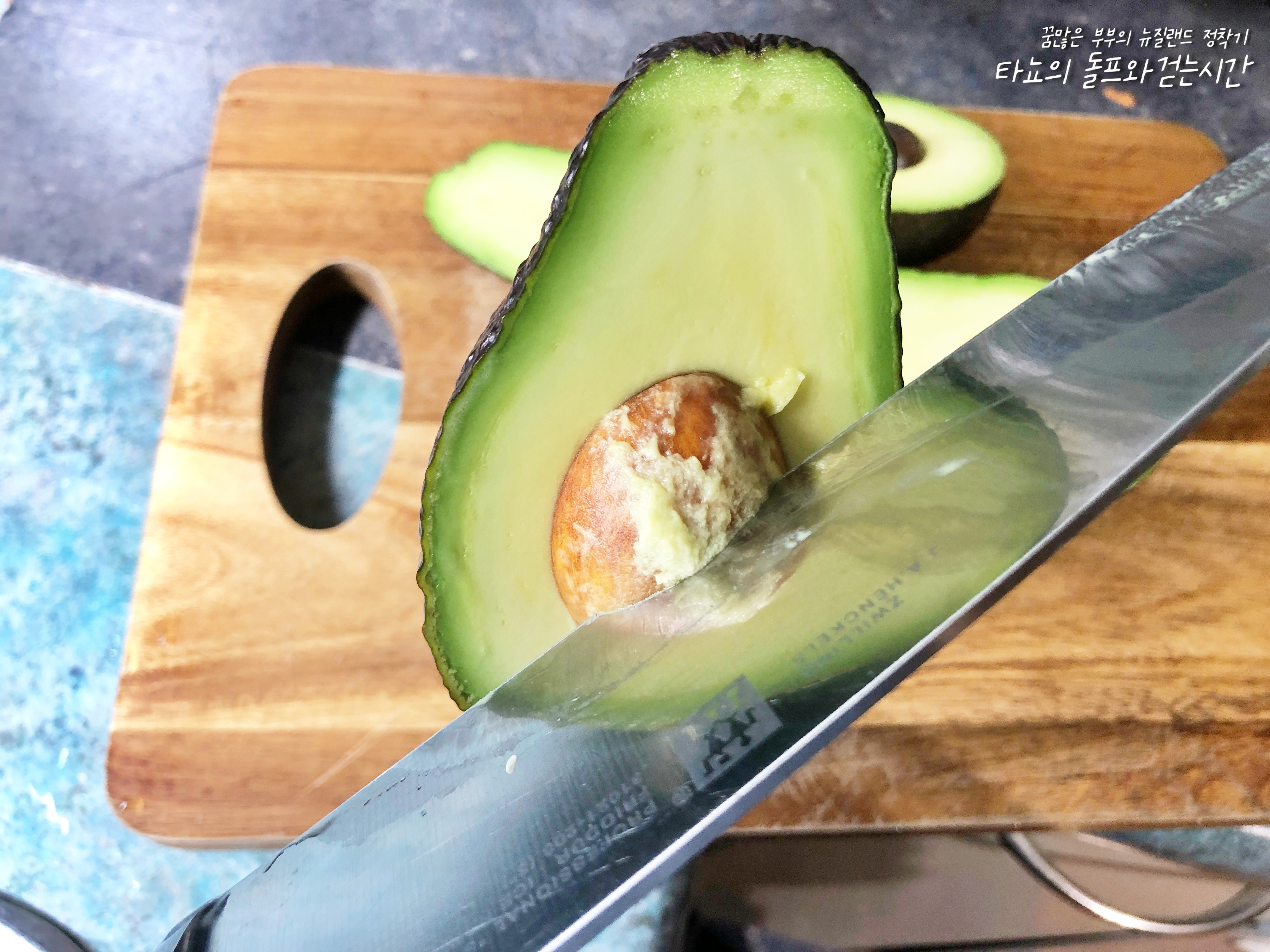 아보카도는 반으로 잘라 중앙에 박힌 씨를 제거합니다. 칼로 톡 찍어서 움직여주면 순식간에 쏙 빠집니다.