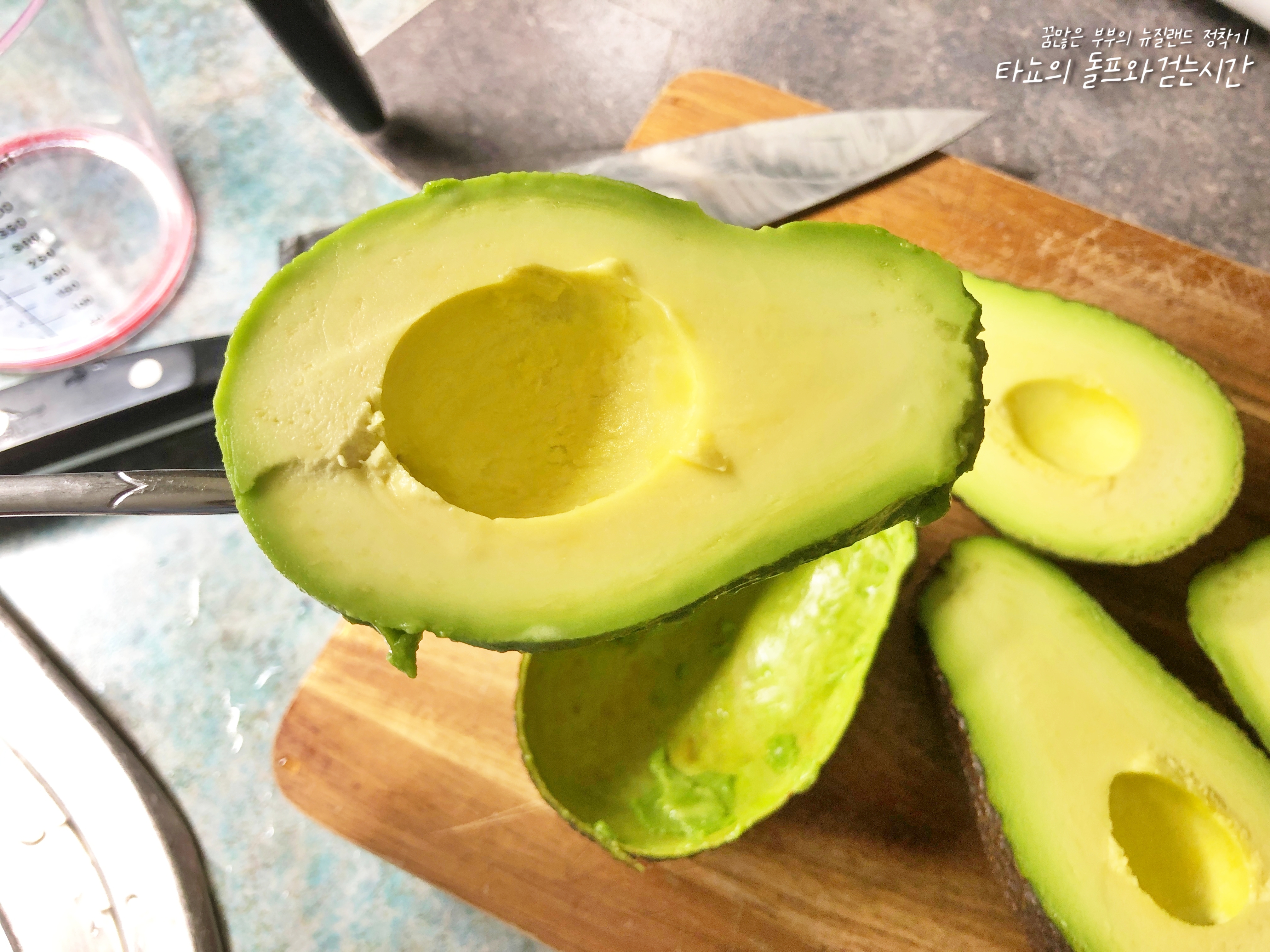 너무 안익지도, 너무 많이 익지도 않은 딱 잘 익은 상태의 아보카도입니다. 잘랐을 때 이렇게 색이 고우면 정말 기분이 좋죠.