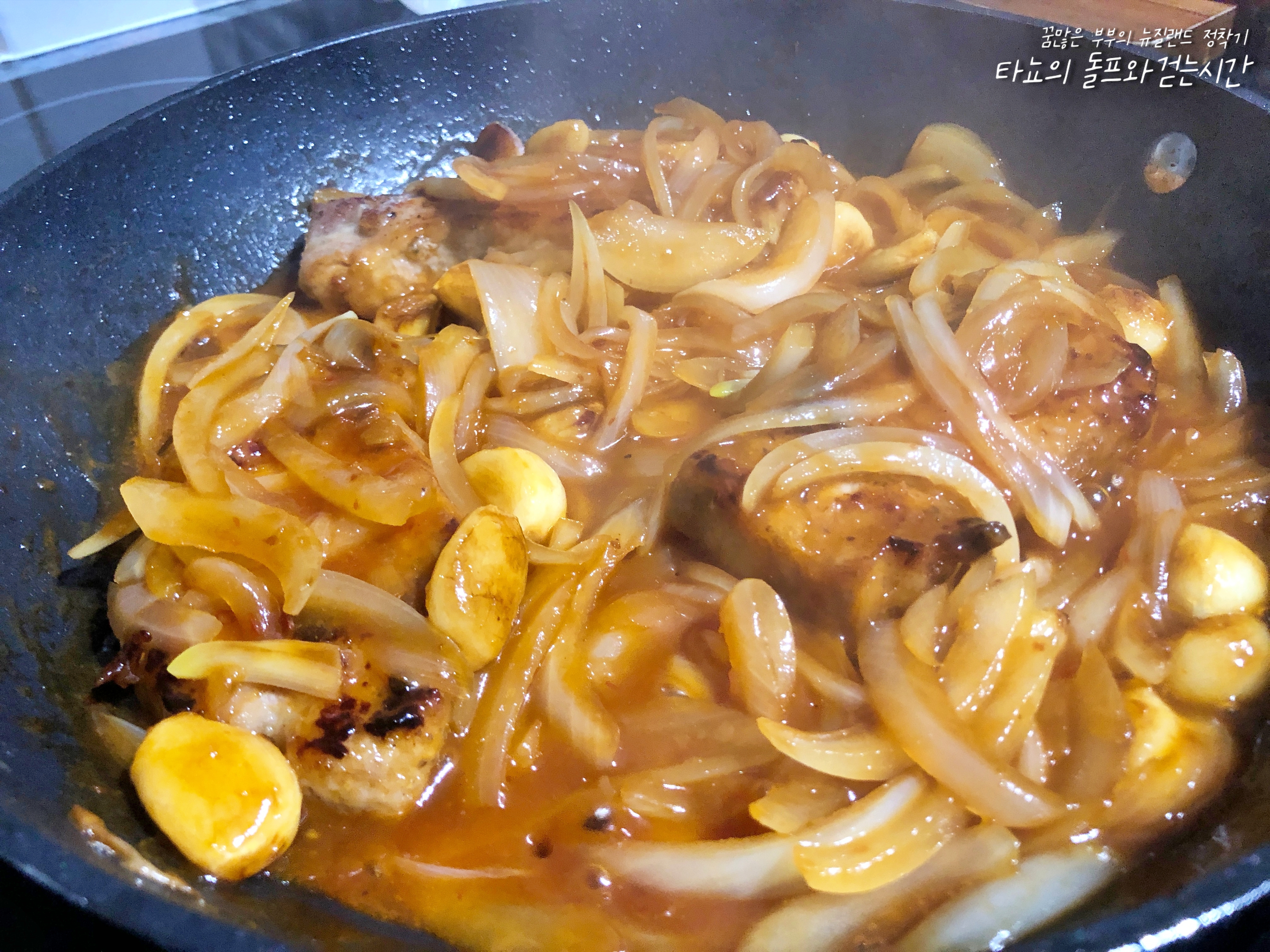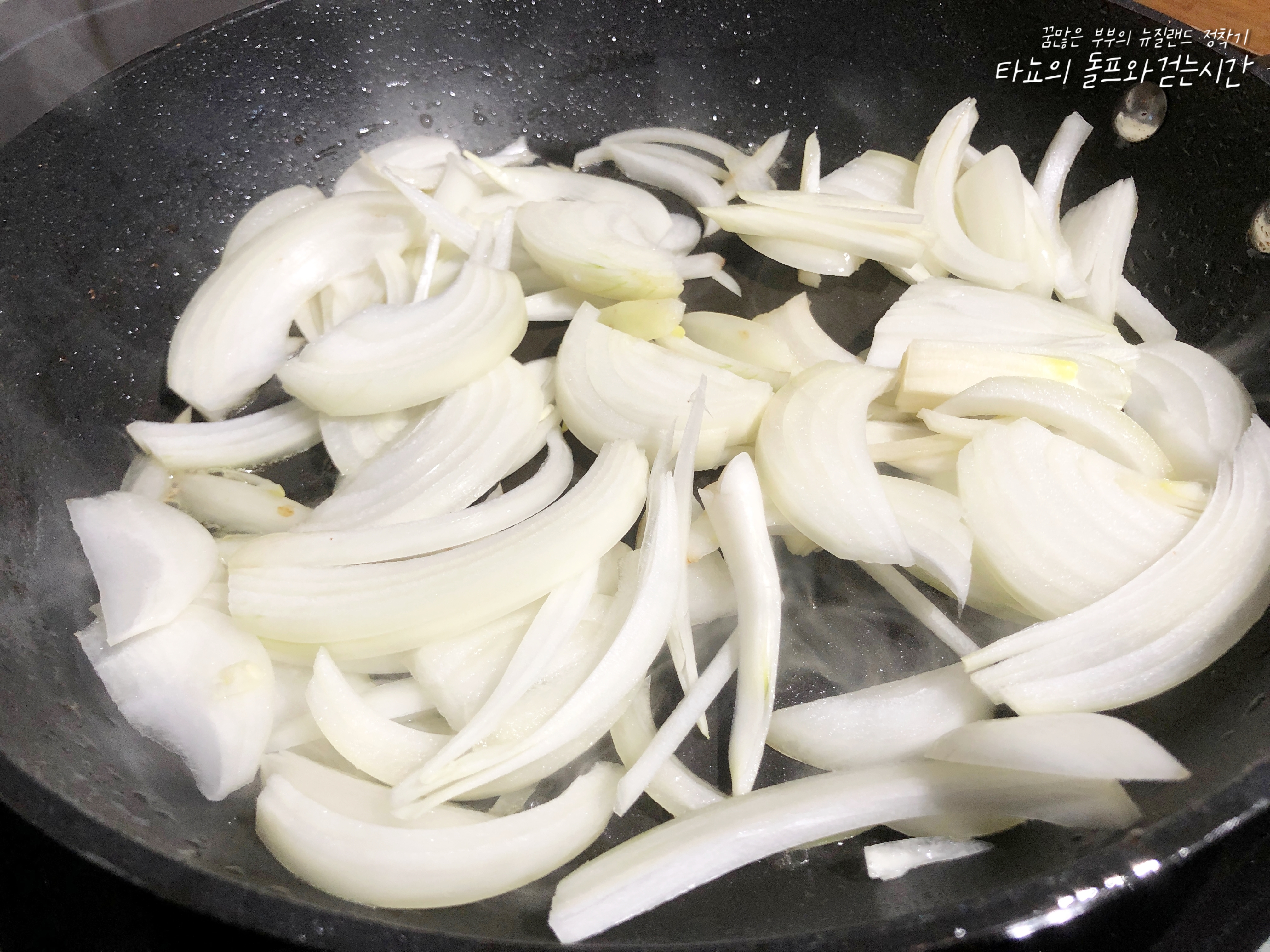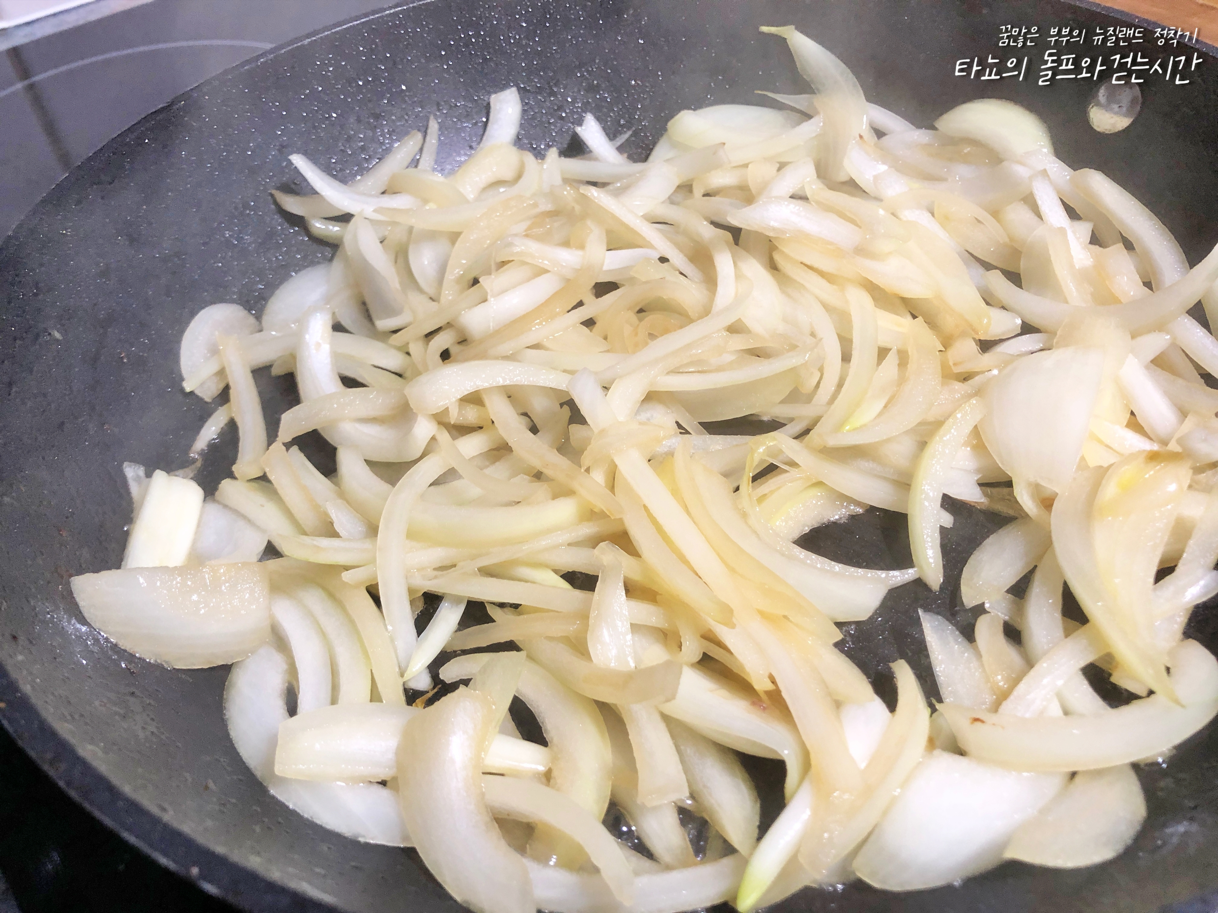 그러나 달짝지근한 소스를 좋아하는 신랑을 위해 오늘은 소스를 만들겠습니다. 생각보다 팬이 지저분하지 않아서 고기 구웠던 팬에 곧바로 양파 넣어서 살짝 투명해질 때까지 볶았습니다.