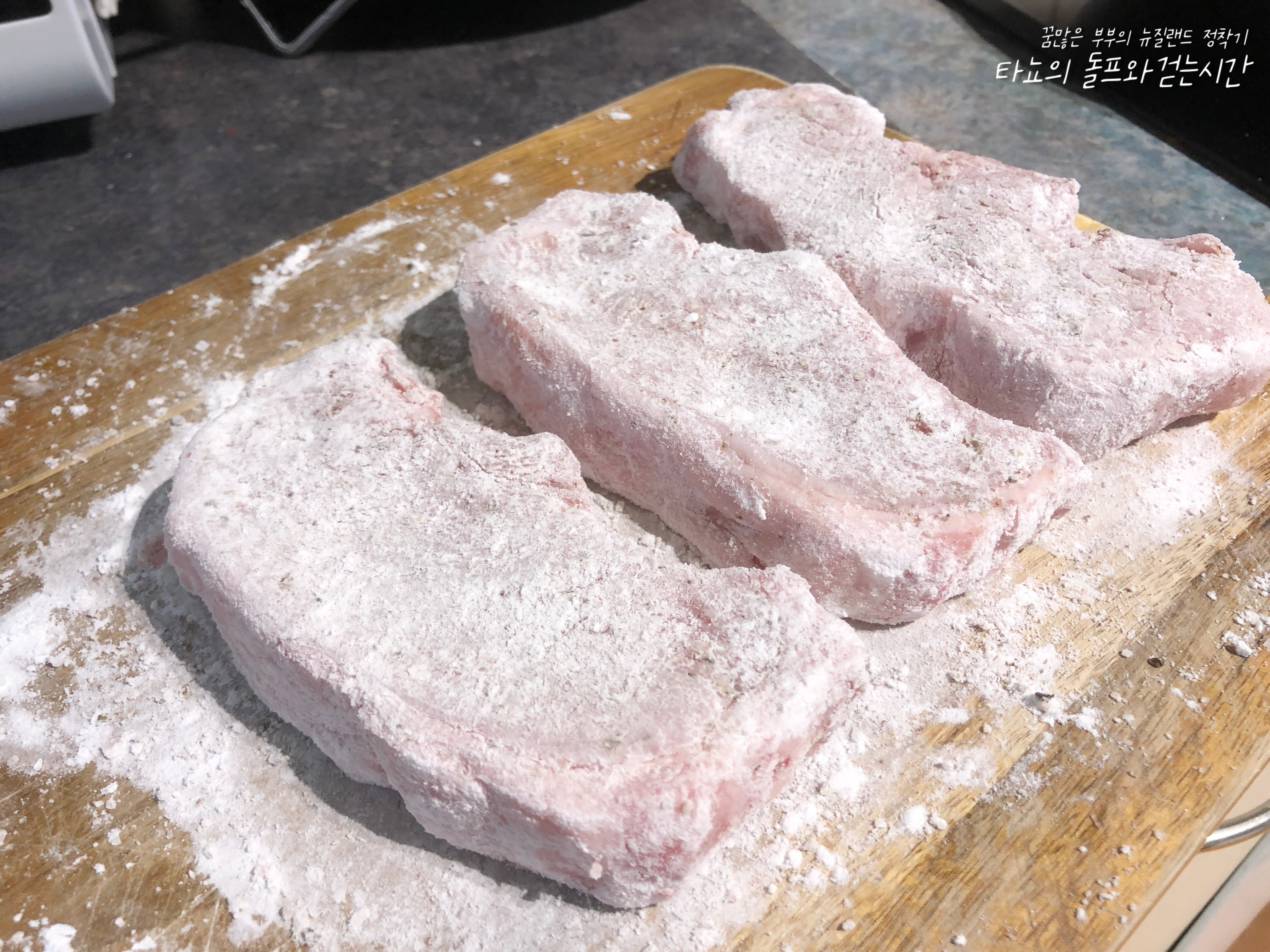 앞뒤로 소금, 후추 뿌려서 밑간하고 30분 후 조리 시작했어요.
