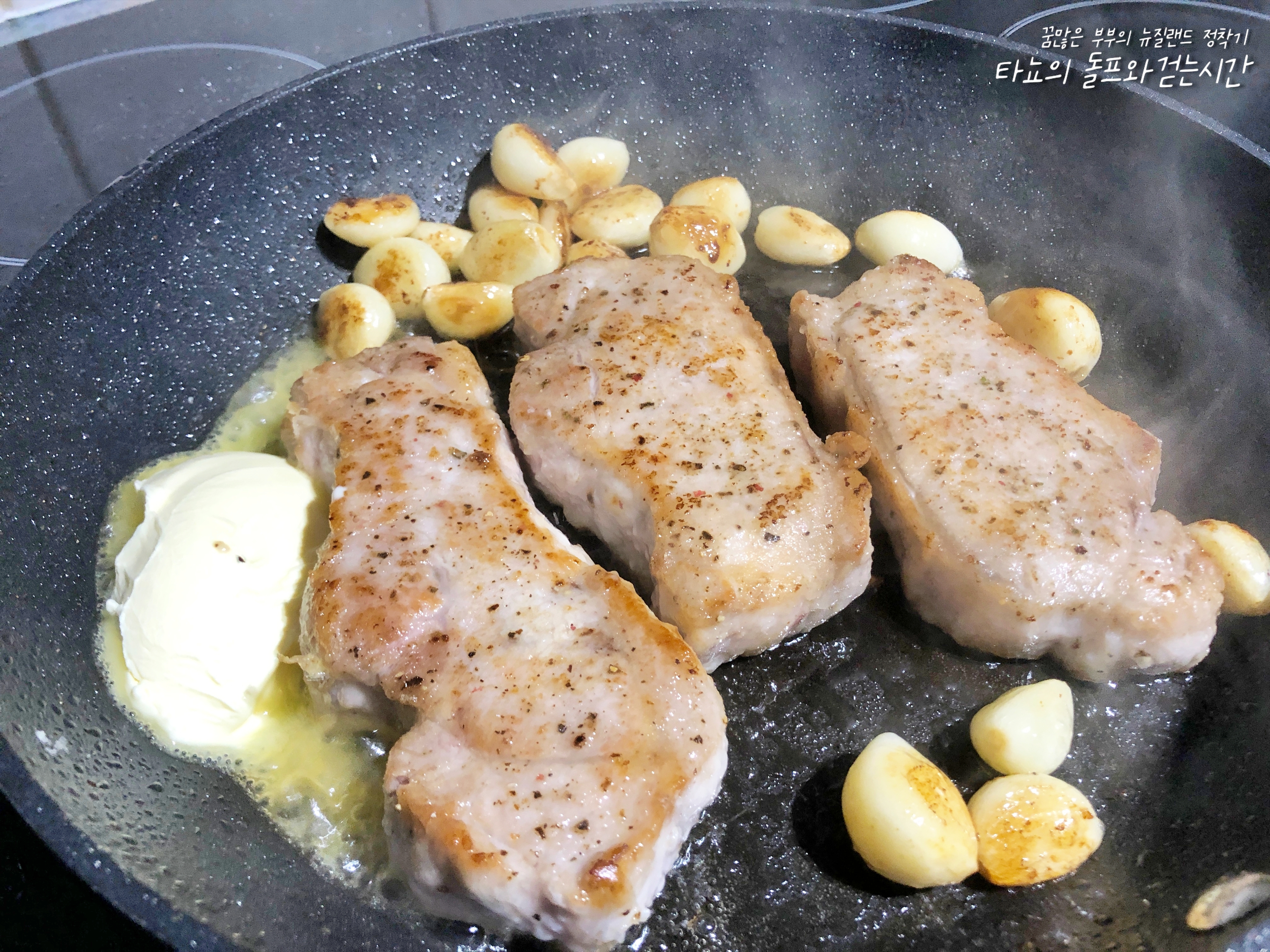 고기가 앞뒤로 노릇노릇하게 구워졌다 싶을 때 버터 2큰술 넣어서 지글지글 튀기듯 구웠습니다.