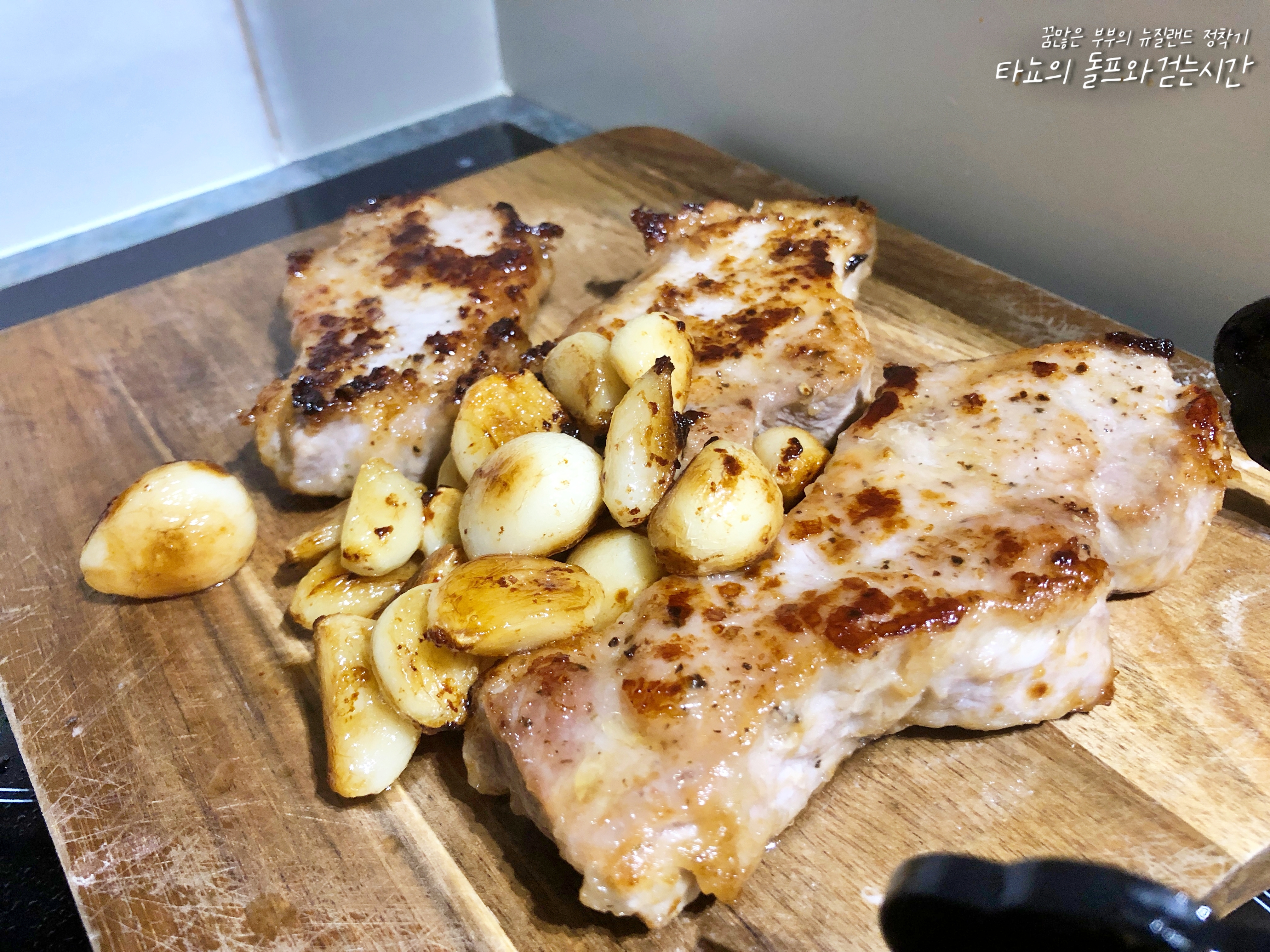 저는 두꺼운 스테이크용 등심을 사용했지만, 더 얇은 등심이나 목살 사용하셔도 맛있게 조리할 수 있어요. 저희 부부는 구운 통마늘을 많이 좋아해서 20쪽이나 넣었지만, 취향에 따라 양은 조절하시면 될 것 같습니다. 전분가루 없을 때는 밀가루로 대체 가능하고 가니쉬로 아스파라거스나 구운 통감자, 파인애플 같은 거 준비해도 좋습니다.