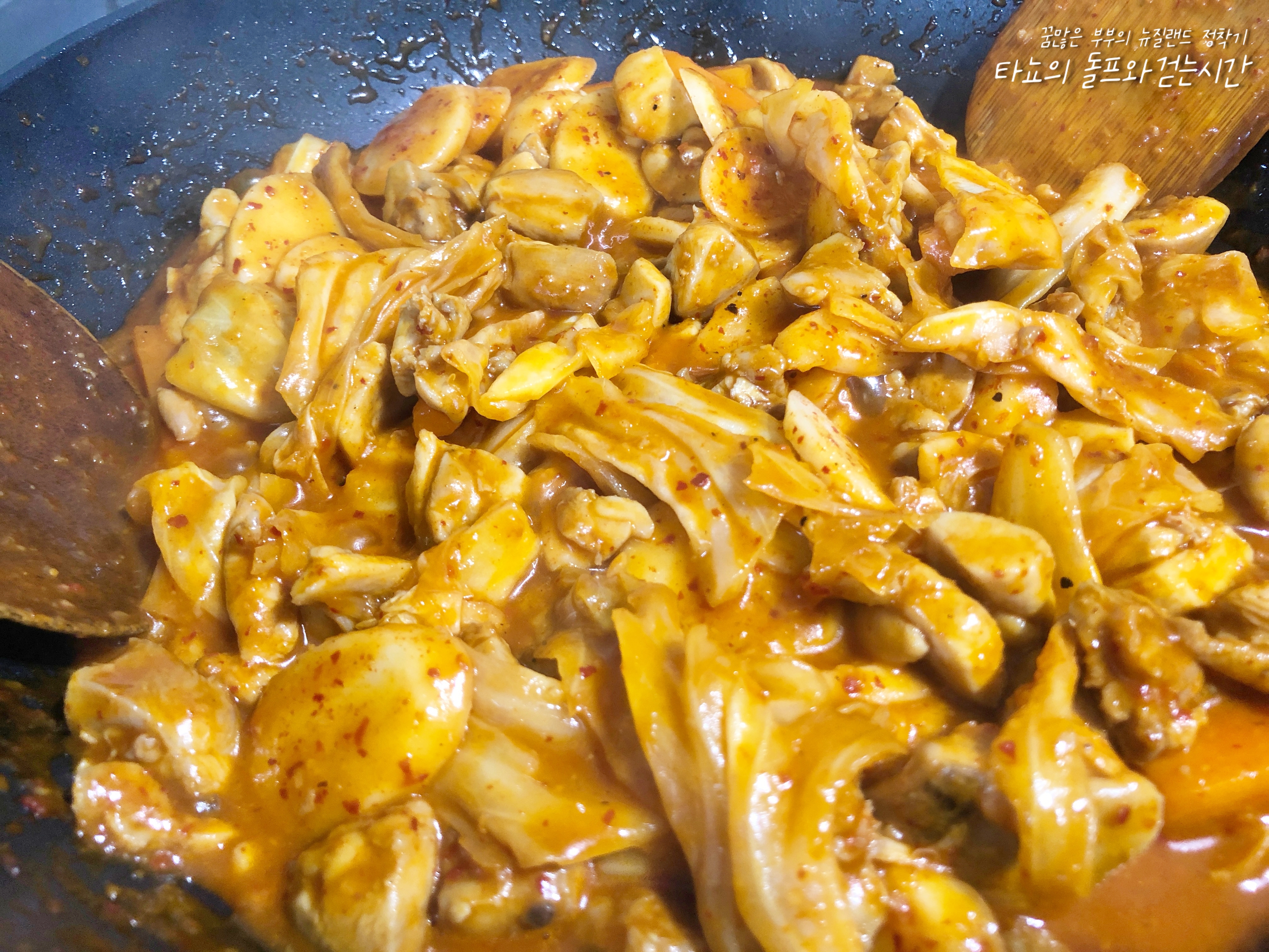재료 : 닭 넓적다리 살 450g, 양배추 2줌, 당근 1줌, 떡국떡 120g, 고추장 1큰술, 진간장 2큰술, 설탕 2큰술, 고춧가루 1큰술, 다진 마늘 1큰술, 물 2/3컵, 다시다 1작은술, 참기름 1큰술, 깨 조금, 후추 조금
