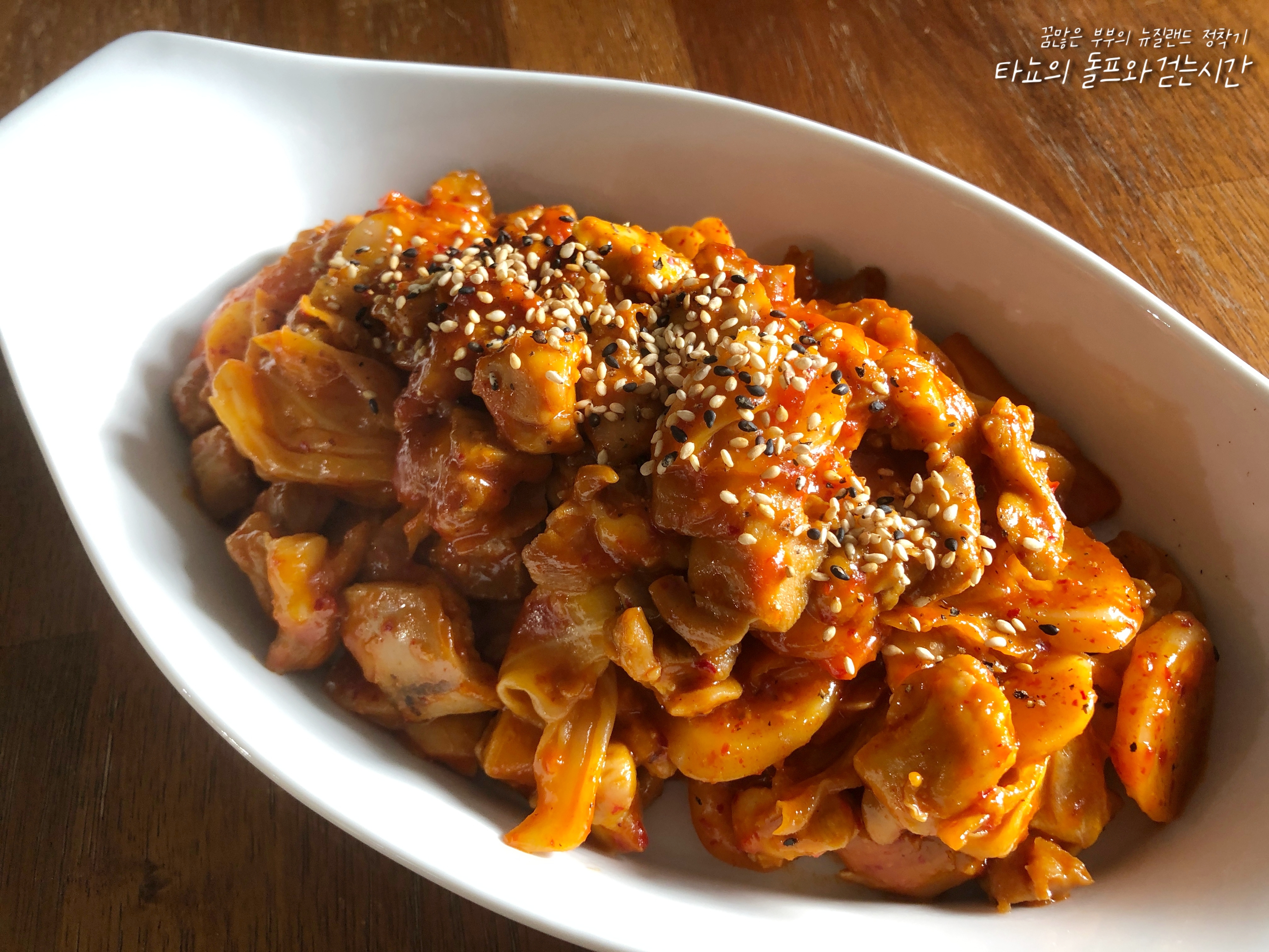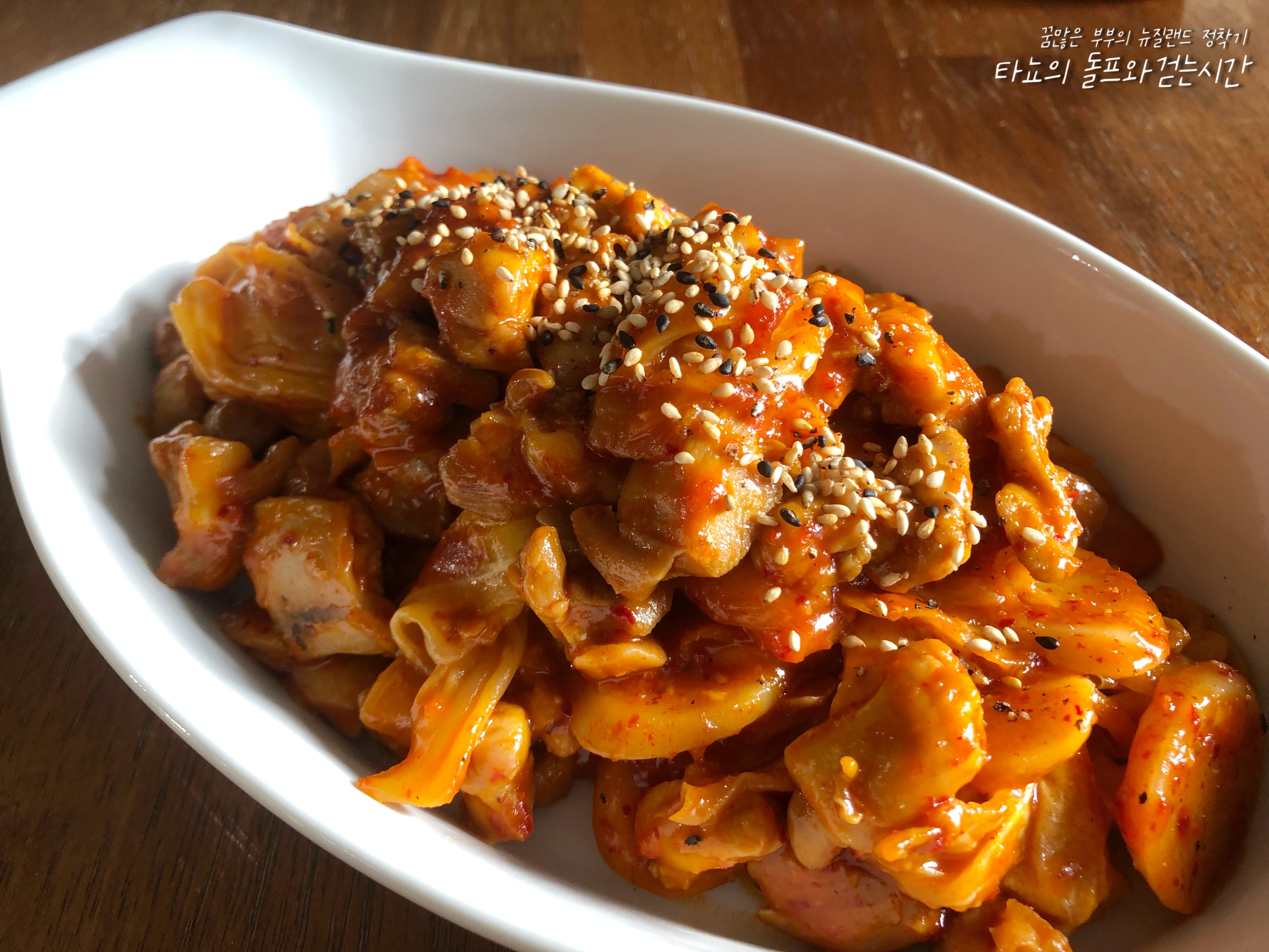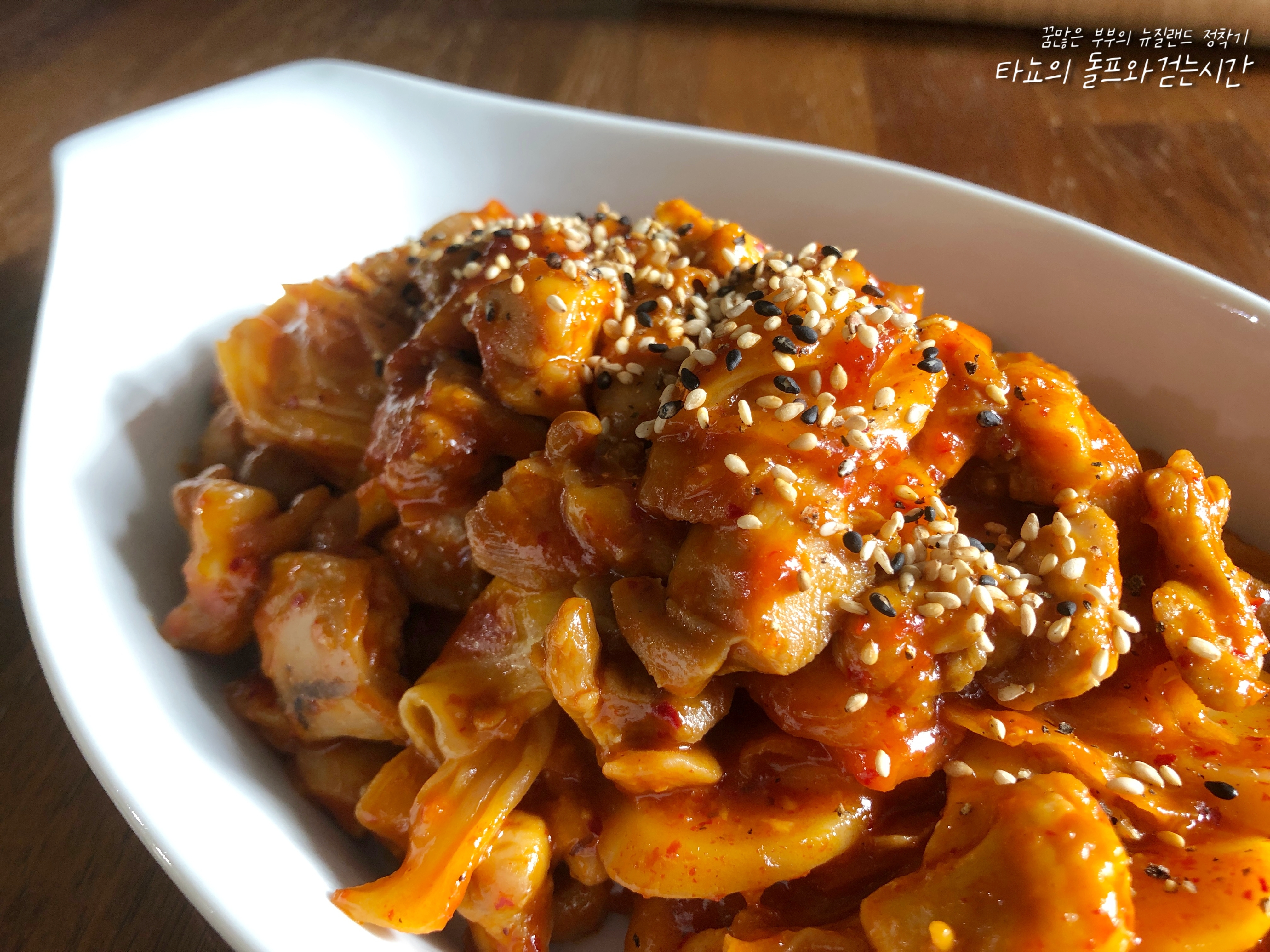 마지막은 참깨 솔솔 뿌려서 마무리했습니다. 이 넓적다리 살 맛이 워낙 좋아 치킨 튀길 때를 제외하면 보통 이 부위를 구입합니다. 뼈 없는 가라게 치킨을 만들 때도 마찬가지로 이 부위가 가장 맛이 좋아요. 워낙 부드럽고 식감도 좋아서 먹을 때 만족도가 높습니다. 집에서 간단하게 만들어 즐길 수 있는 닭갈비, 여러분도 한번 만들어보세요.