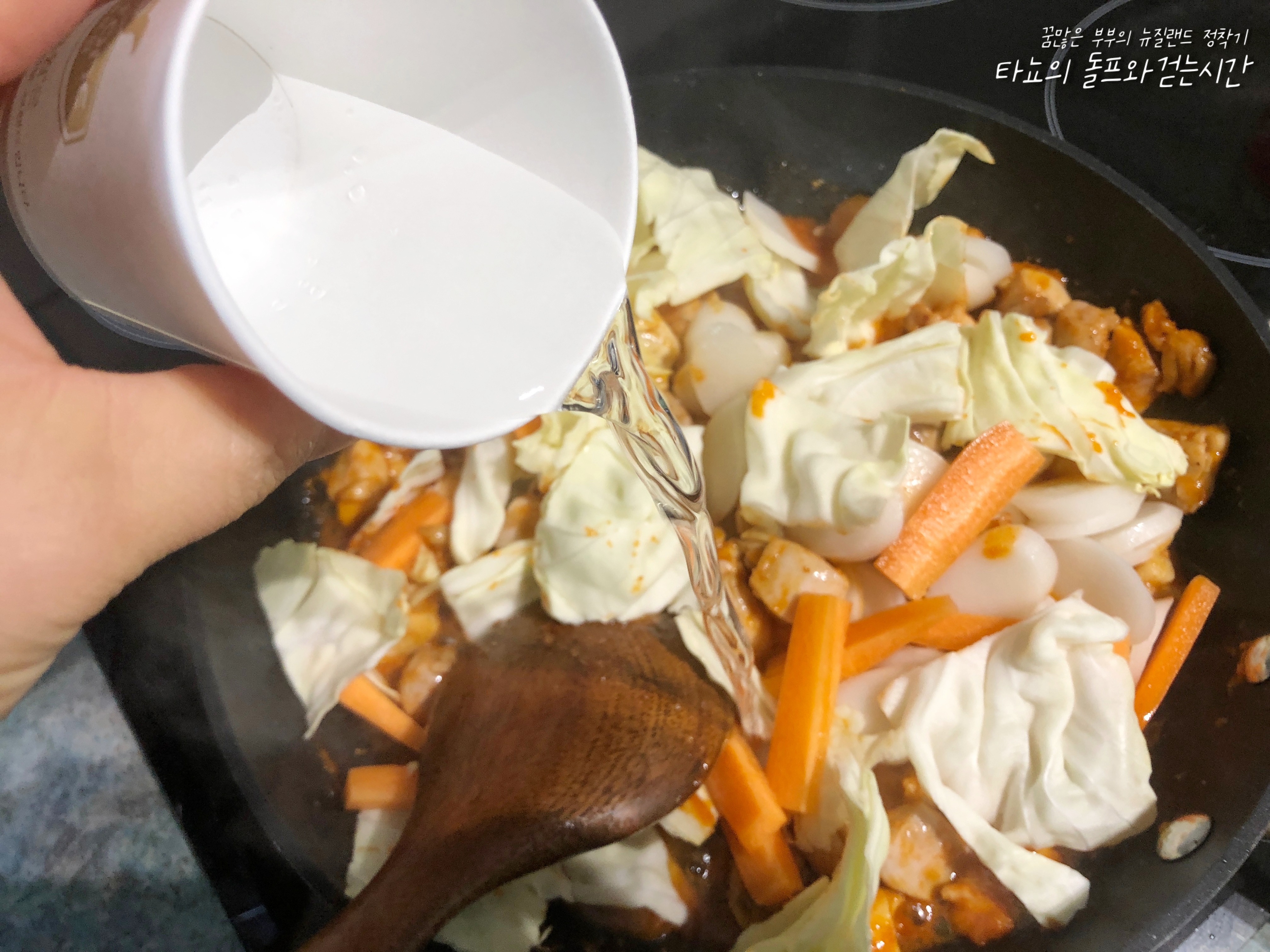 고기에 붉은기가 사라지면 야채와 떡을 모두 넣어주세요.