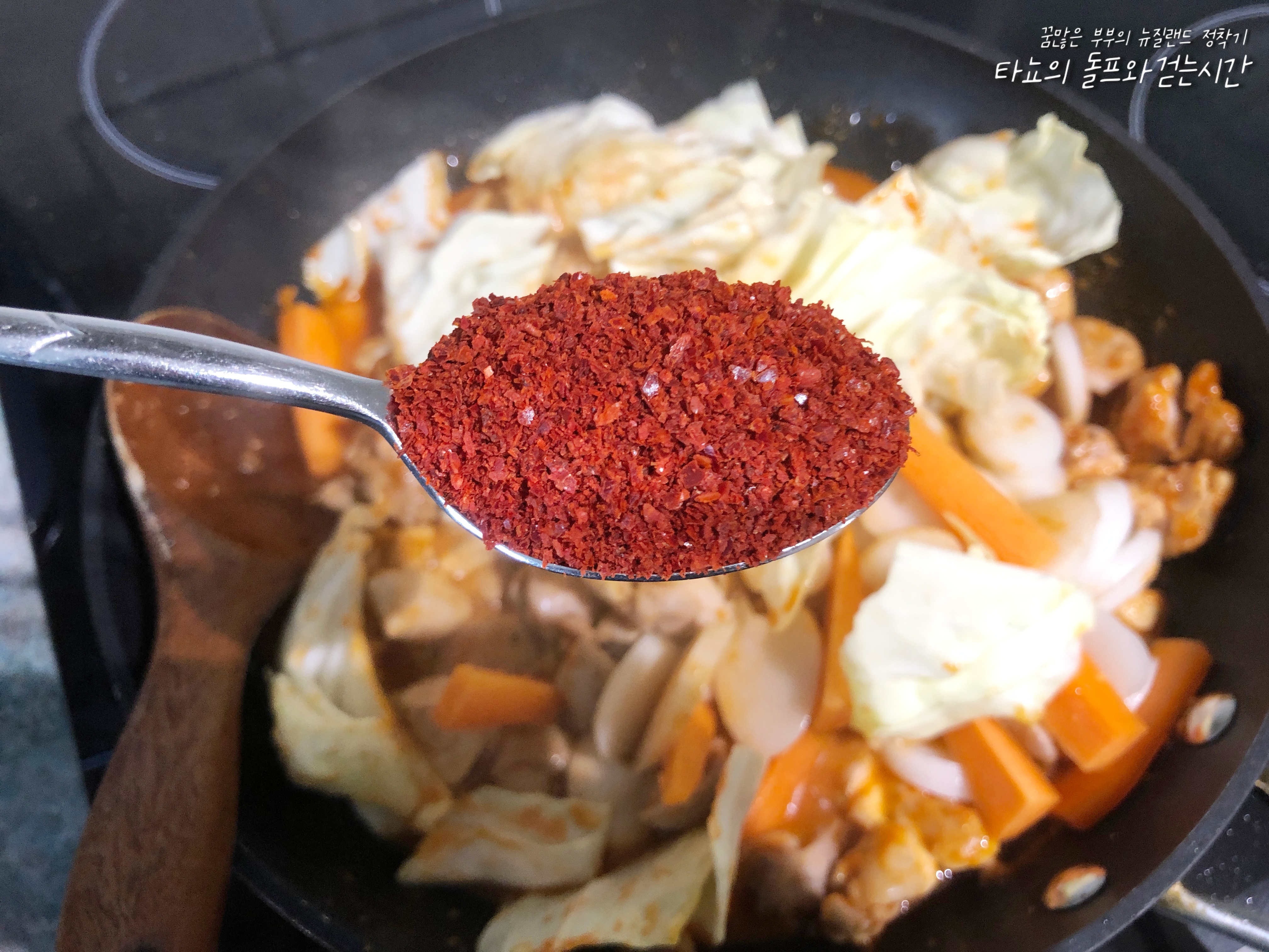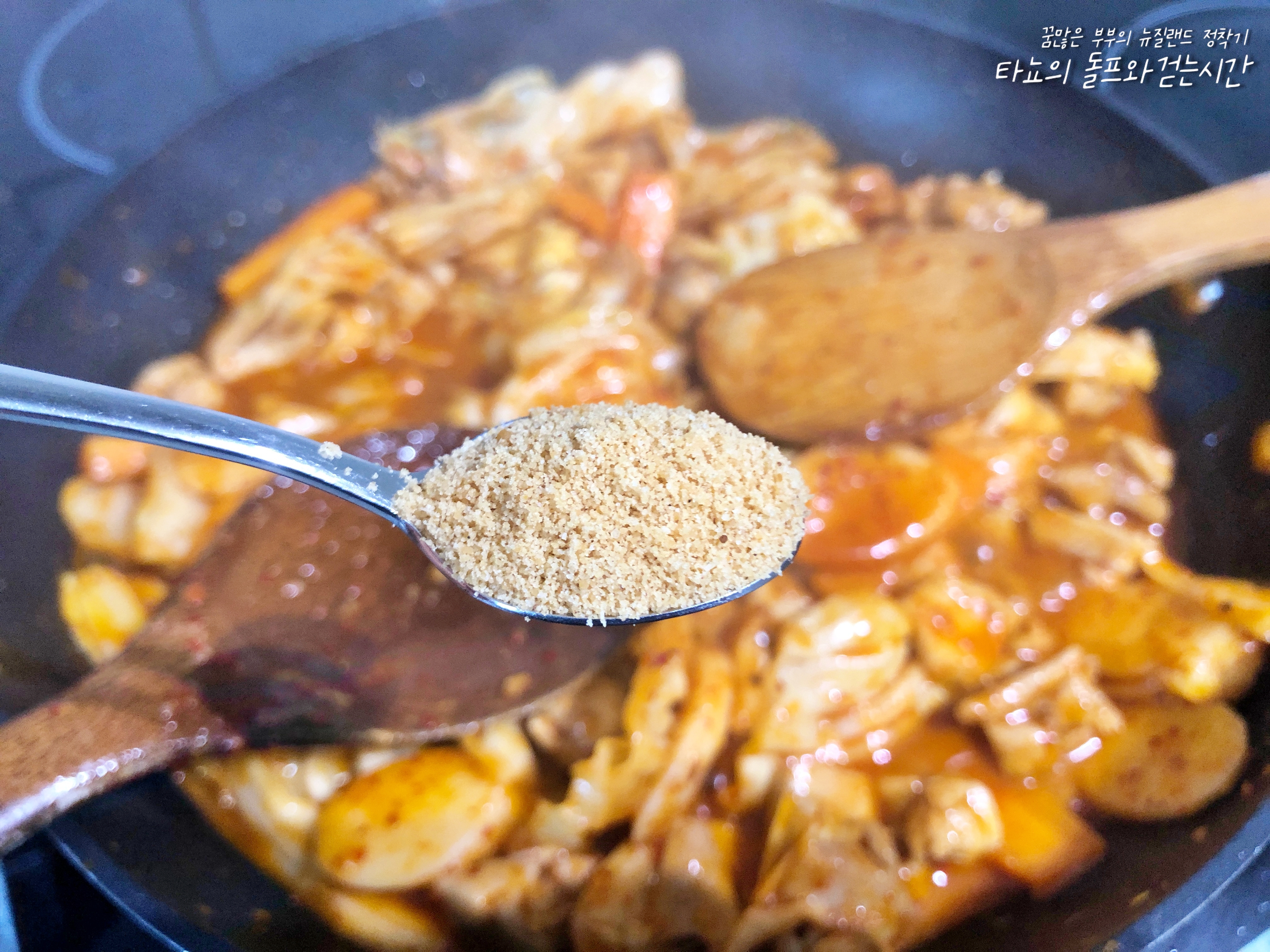 고춧가루를 넣지 않을까 했지만, 색감을 조금 더 붉게 만들고 매운맛을 조금 더 내기 위해서 1큰술 넣었습니다. 물 2/3컵, 다시다 1작은술 넣어서 약간 졸아들 때까지 볶아주세요. 혹시 개인의 입맛에 따라 간이 다를 수 있습니다. 싱거운 분들은 간장이나 소금을 조금씩 더 넣어서 간을 맞춰보세요. 더 달콤하게 드시고 싶다면 설탕이나 물엿, 올리고당 등을 넣으면 됩니다.
