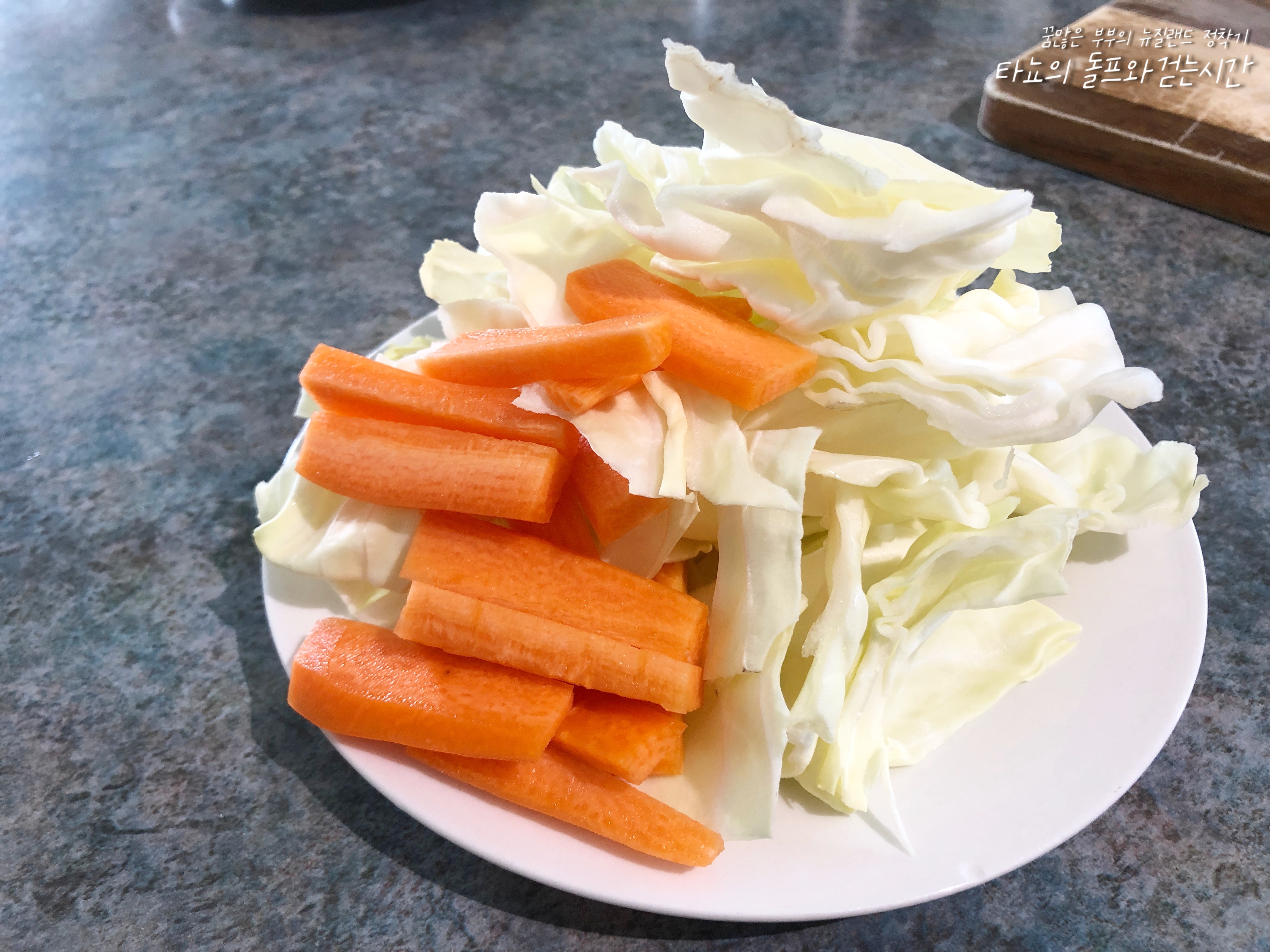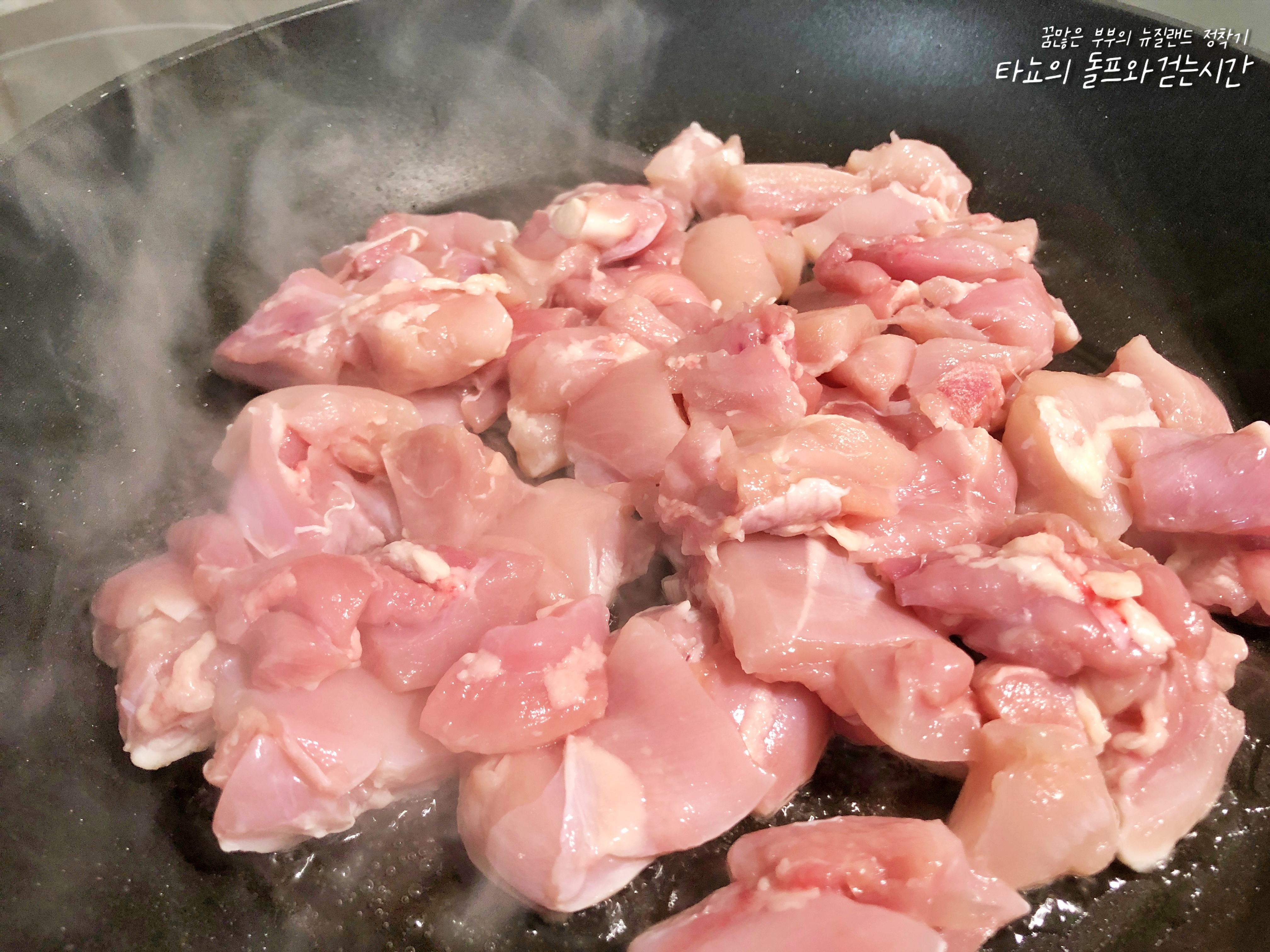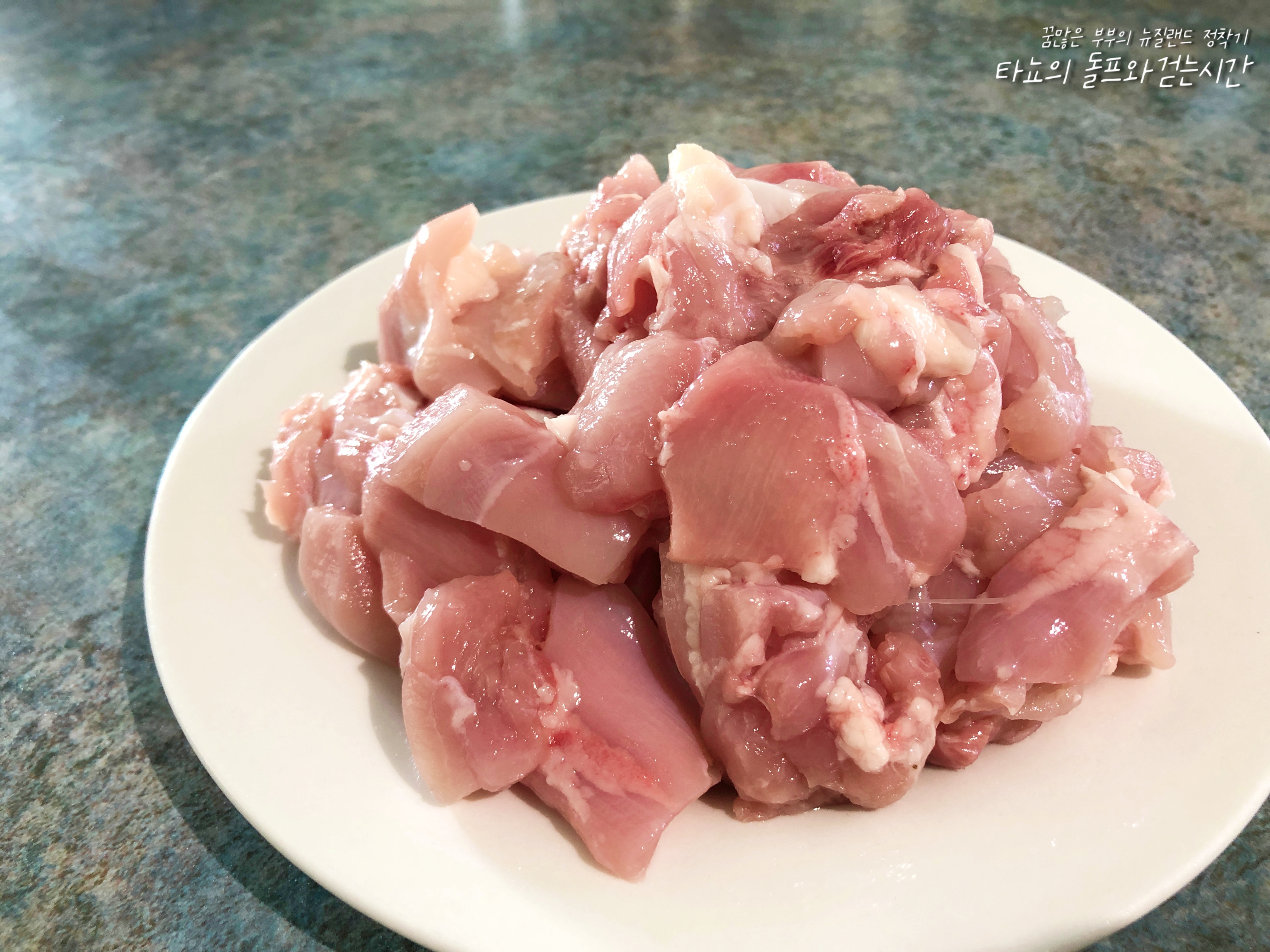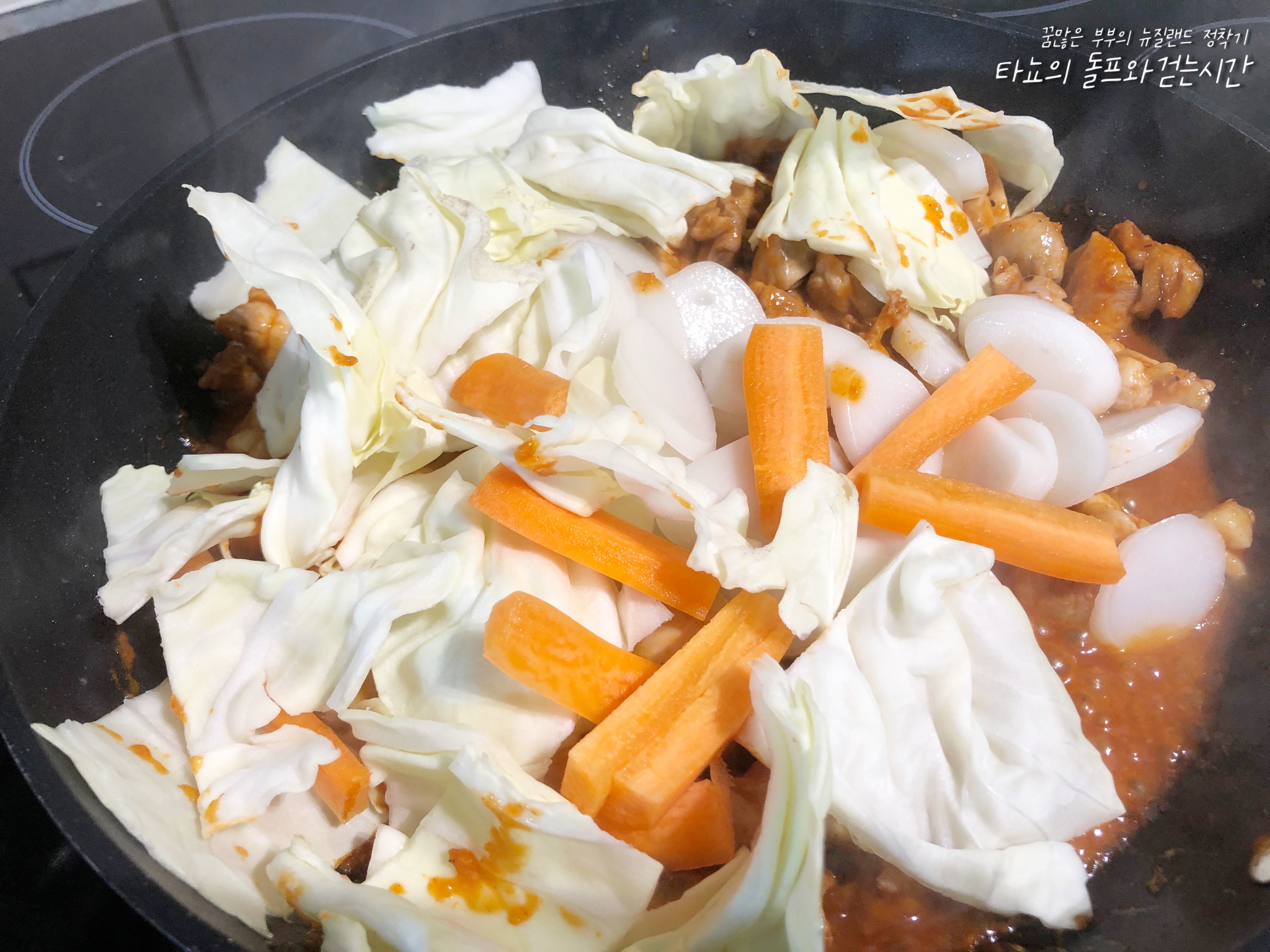 닭 넑적다리 살(윗다리 살)은 식감이 좋고 특유의 감칠맛이 좋아서 인기가 좋은 식재료입니다. 기름기가 조금씩 뭉쳐있을 수 있는데 뼈 제거하면서 모두 함께 제거했습니다. 먹기 좋은 크기로 자르고 당근과 양배추도 넉넉하게 준비했어요. 채소는 집에 있는 것으로 사용하시면 될 것 같은데요. 대파, 깻잎, 청경채, 고구마, 감자 등 좋아하는 채소를 넣어주세요. 떡을 좋아하는 신랑을 위해서 떡도 많이 넣었어요.