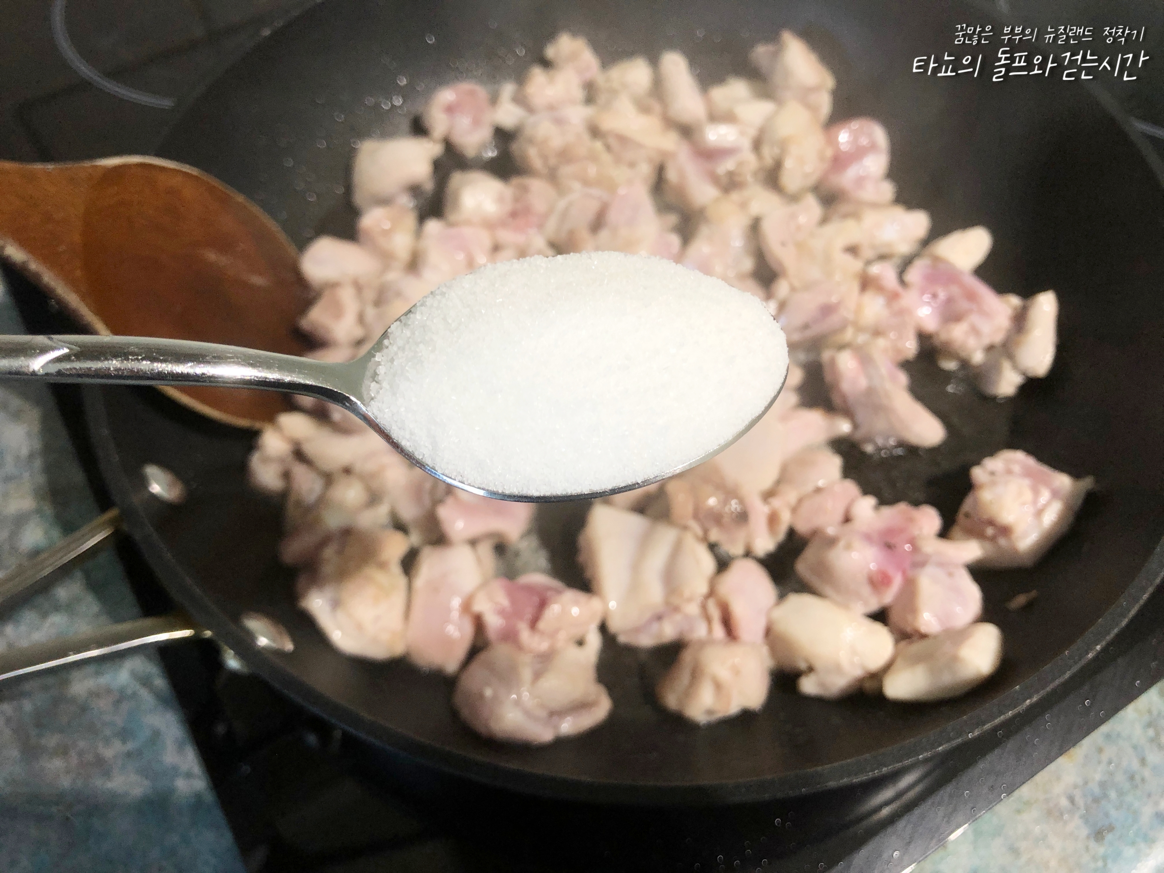 기름 두른 팬에 고기 올리고 설탕 2큰술 넣어서 볶기 시작합니다.