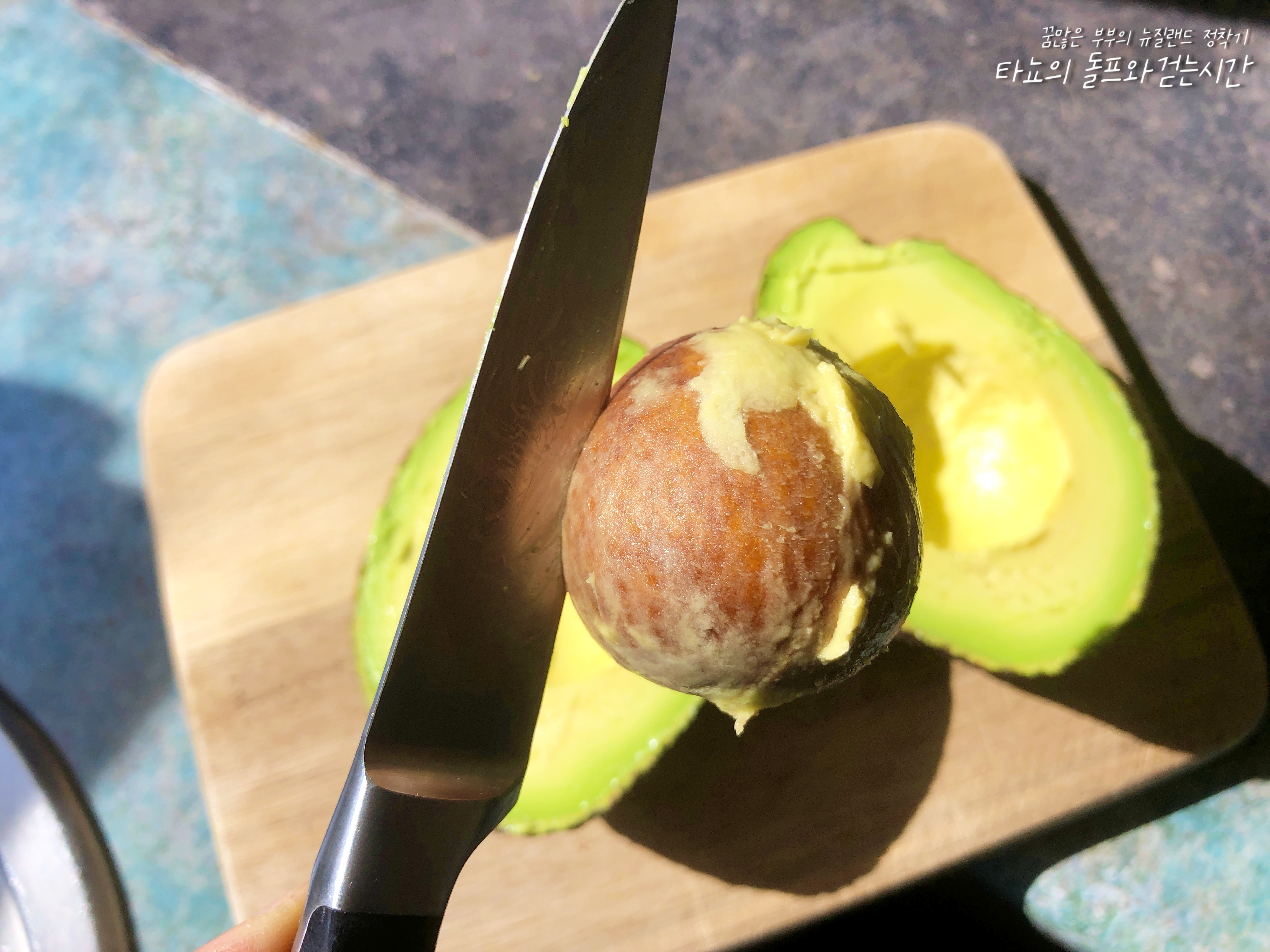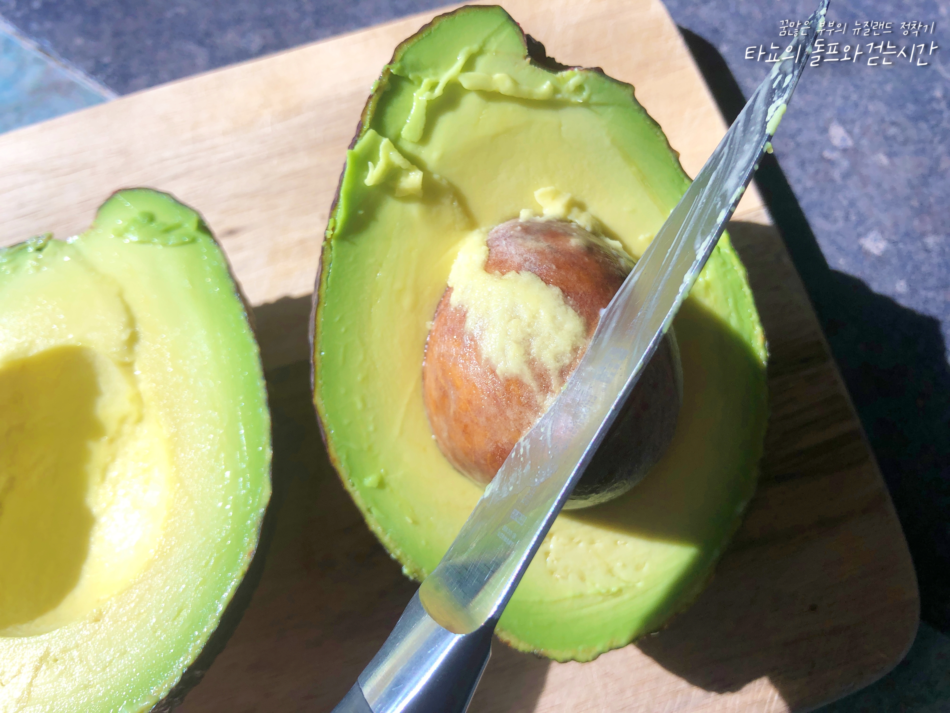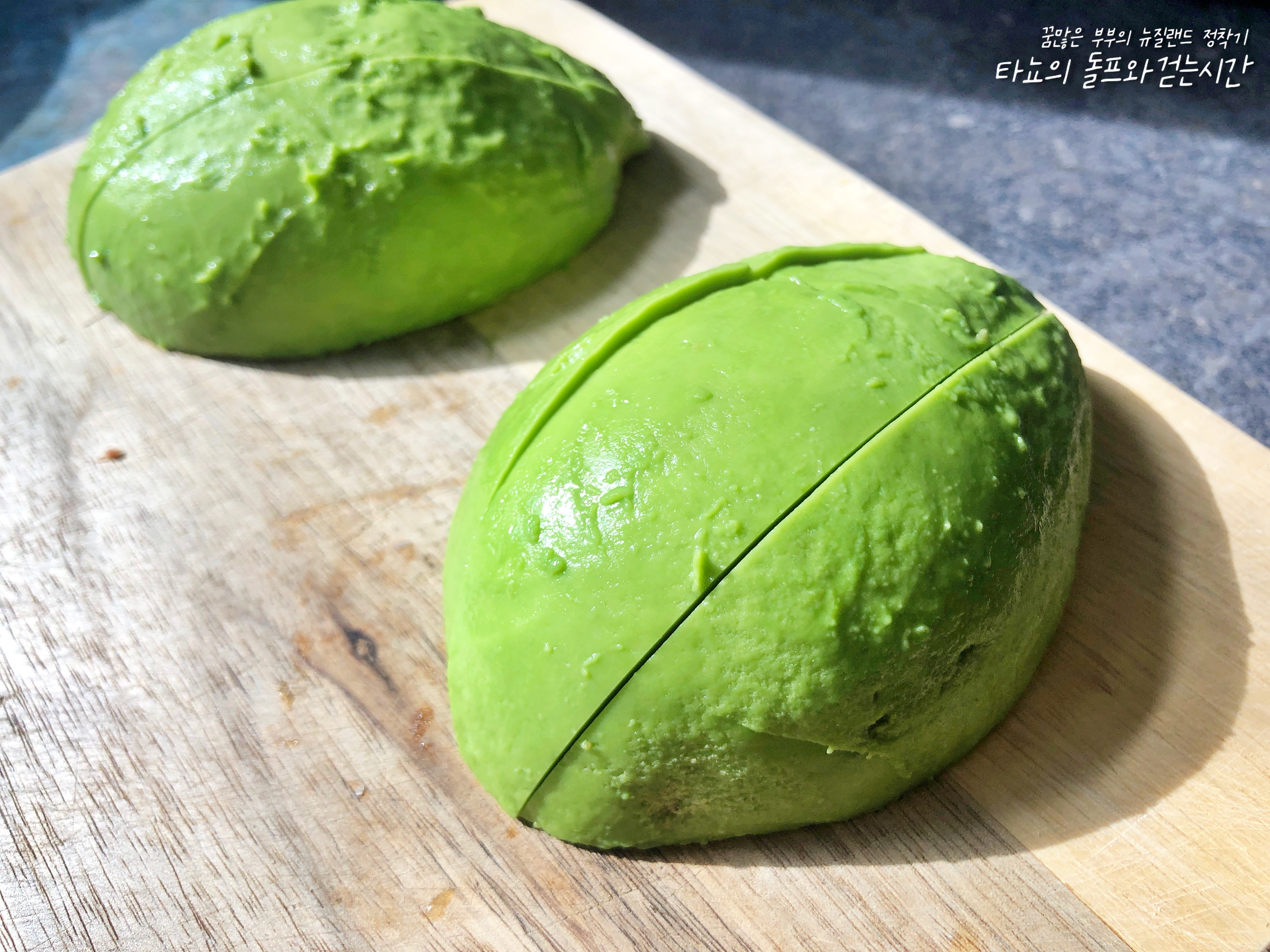 잘 익은 아보카도를 사용했습니다. 초록빛은 너무 단단해서 사용하기 어렵고 너무 까맣게 익은 것은 물러서 속이 상했을 수 있습니다. 짙은 초록빛과 갈색빛이 동시에 돌면서 만졌을 때 단단한 것을 사용해야 속이 부드럽고 딱 먹기 좋습니다.