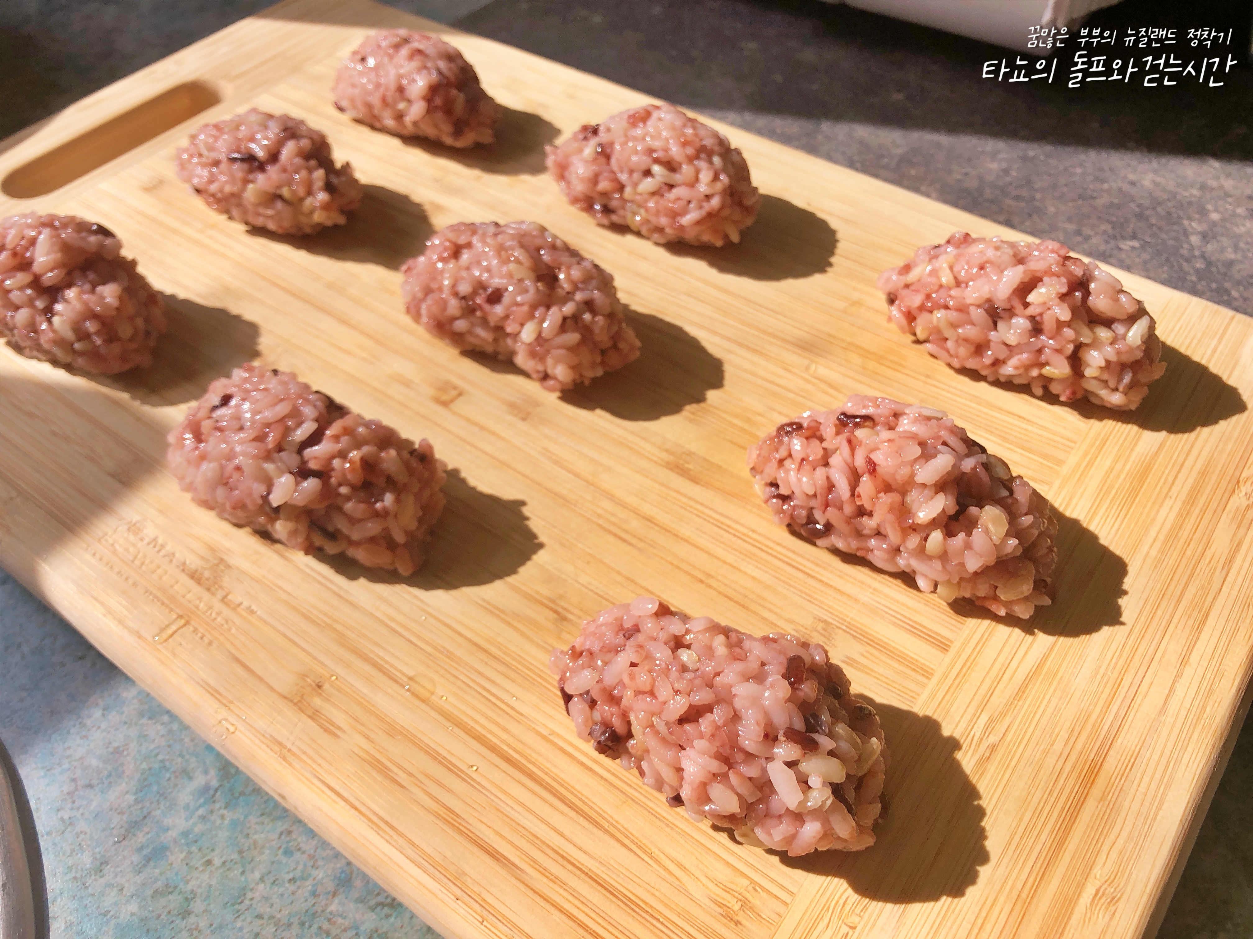 밥에 단촛물을 넣고 간을 맞춘 다음 적당한 크기로 잡았습니다. 사실 저는 초밥 만들기 1도 모르는 일반인이라 그냥 저희가 먹기 좋은 크기로 먹기 좋게 만들었어요. 제대로 모양 잡고 싶으신 분들은 유튜브 전문가들의 영상을 참고하세요.