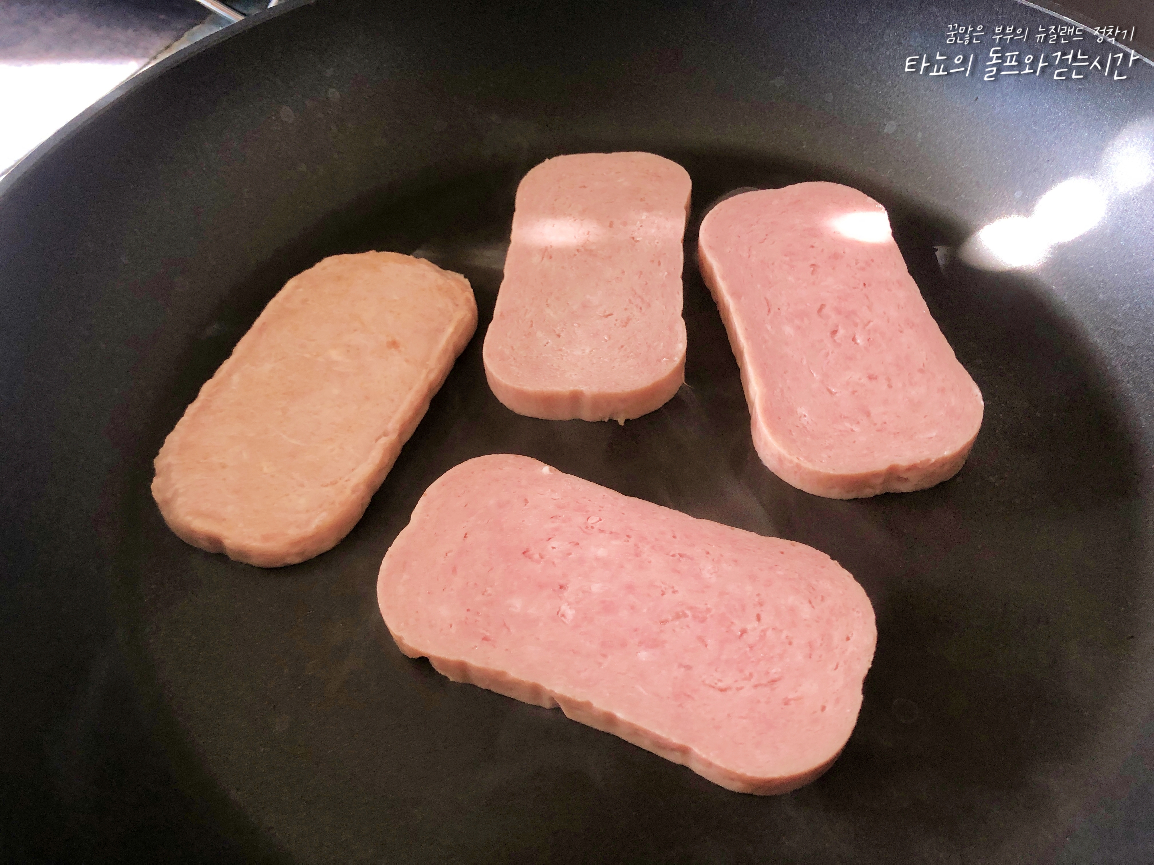 스팸은 끓는 물에 데친 후 노릇하게 구워서 길게 2 등분했습니다.