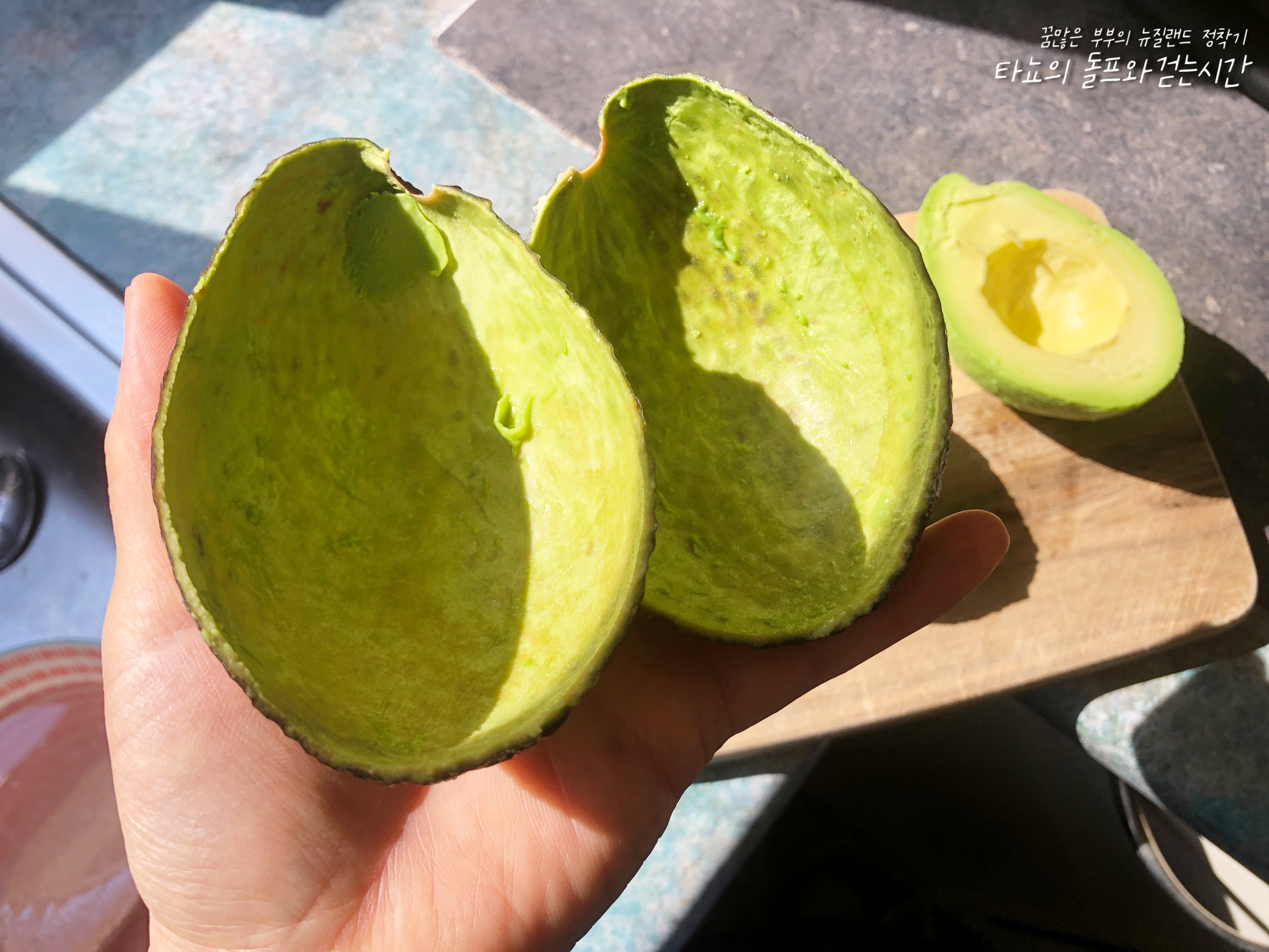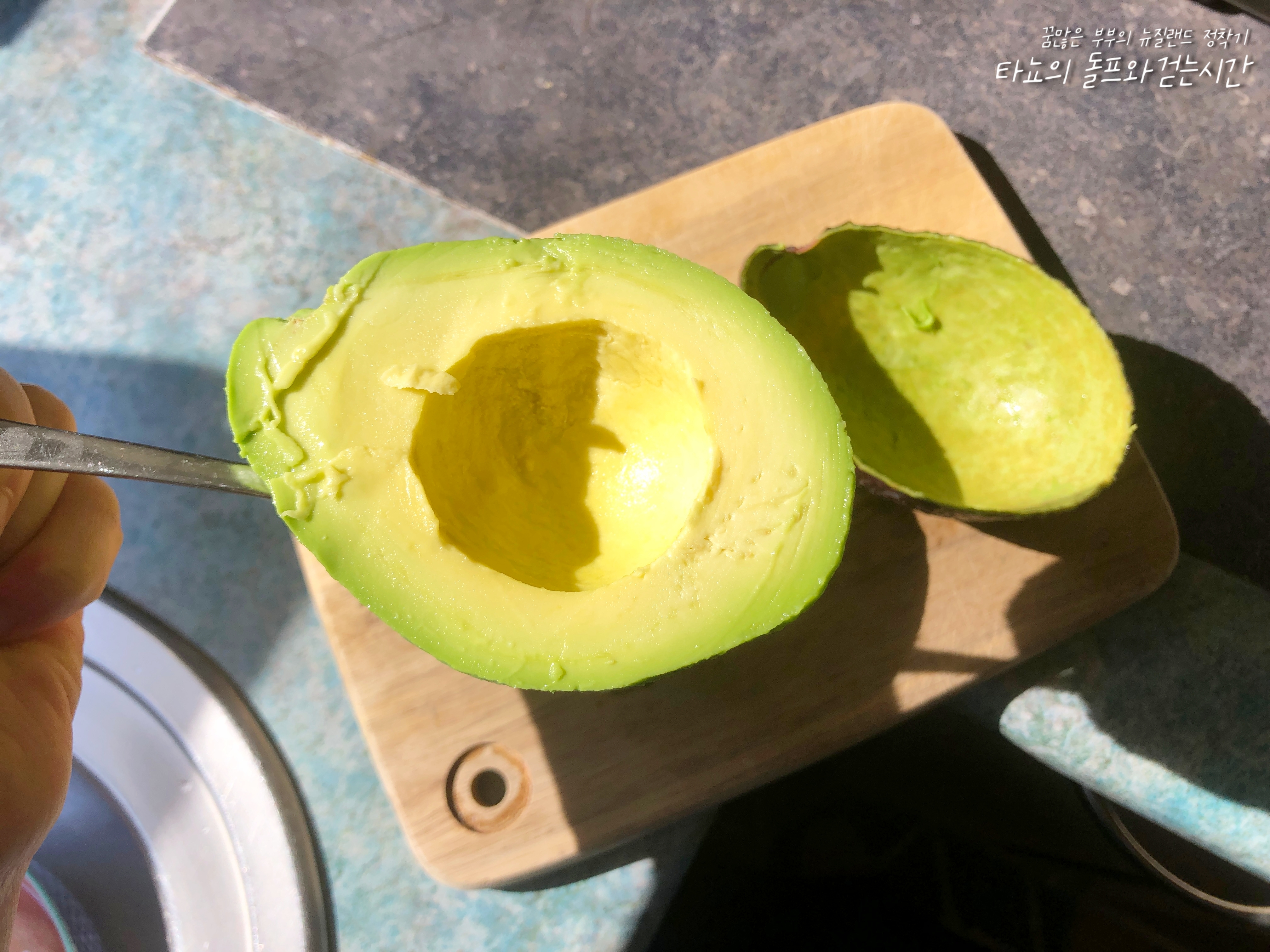 아보카도는 숟가락으로 과육만 뺄 수 있습니다. 껍질을 따라 숟가락으로 쑤욱 돌려주면 쉽게 빠지는데요. 오른쪽 사진의 모습처럼 깔끔하게 껍질이 떨어집니다. 간혹 손으로 껍질을 벗기는 분들도 있는데요. 그렇게 하는 것도 하나의 방법입니다만, 저는 이게 더 편해서 늘 이렇게 합니다.