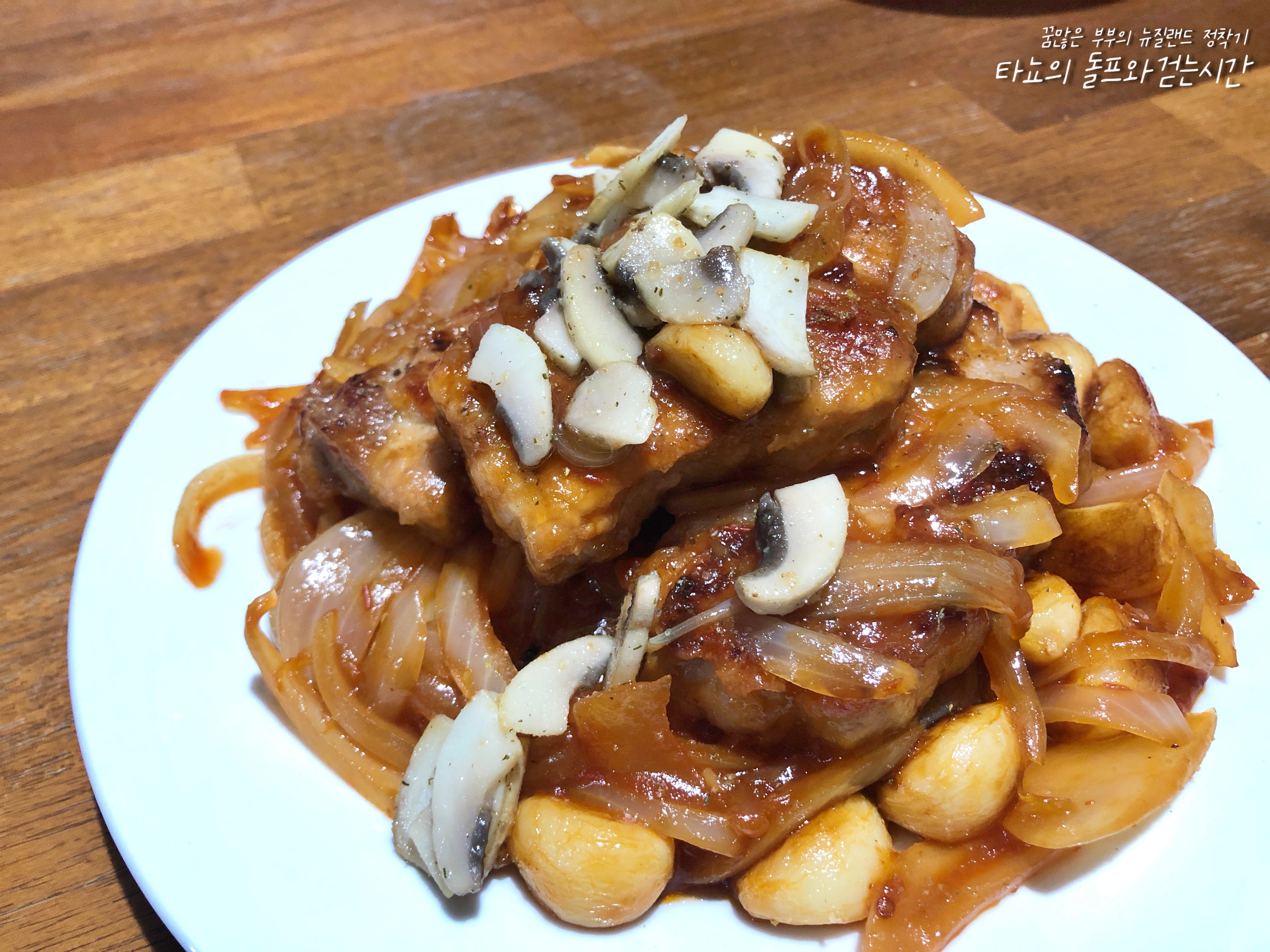 버터 듬뿍, 마늘은 더 듬뿍 넣고 만든 돼지 등심 스테이크입니다. 토마토 베이스 소스 달큰하게 만들어서 졸여 먹었어요.