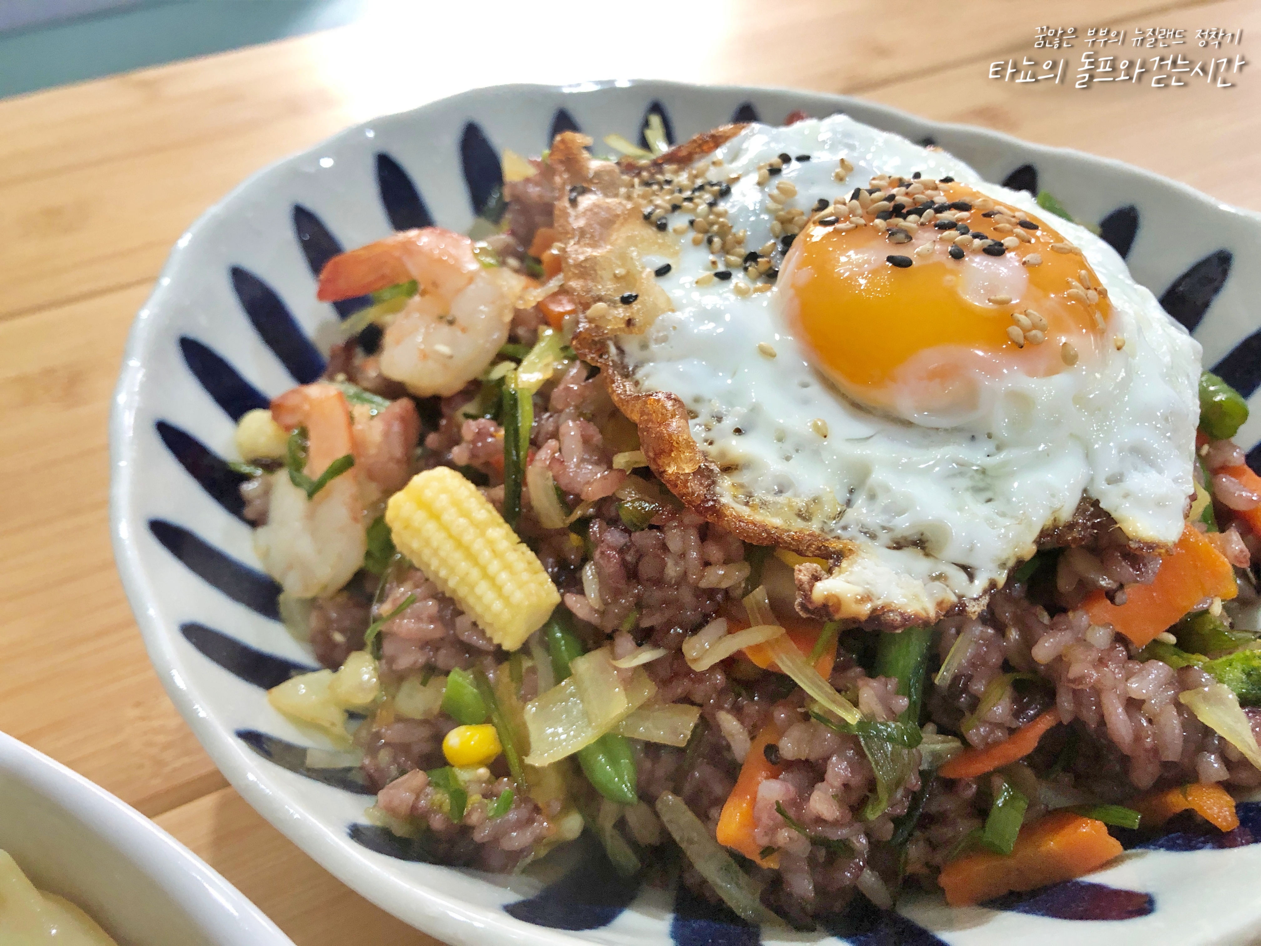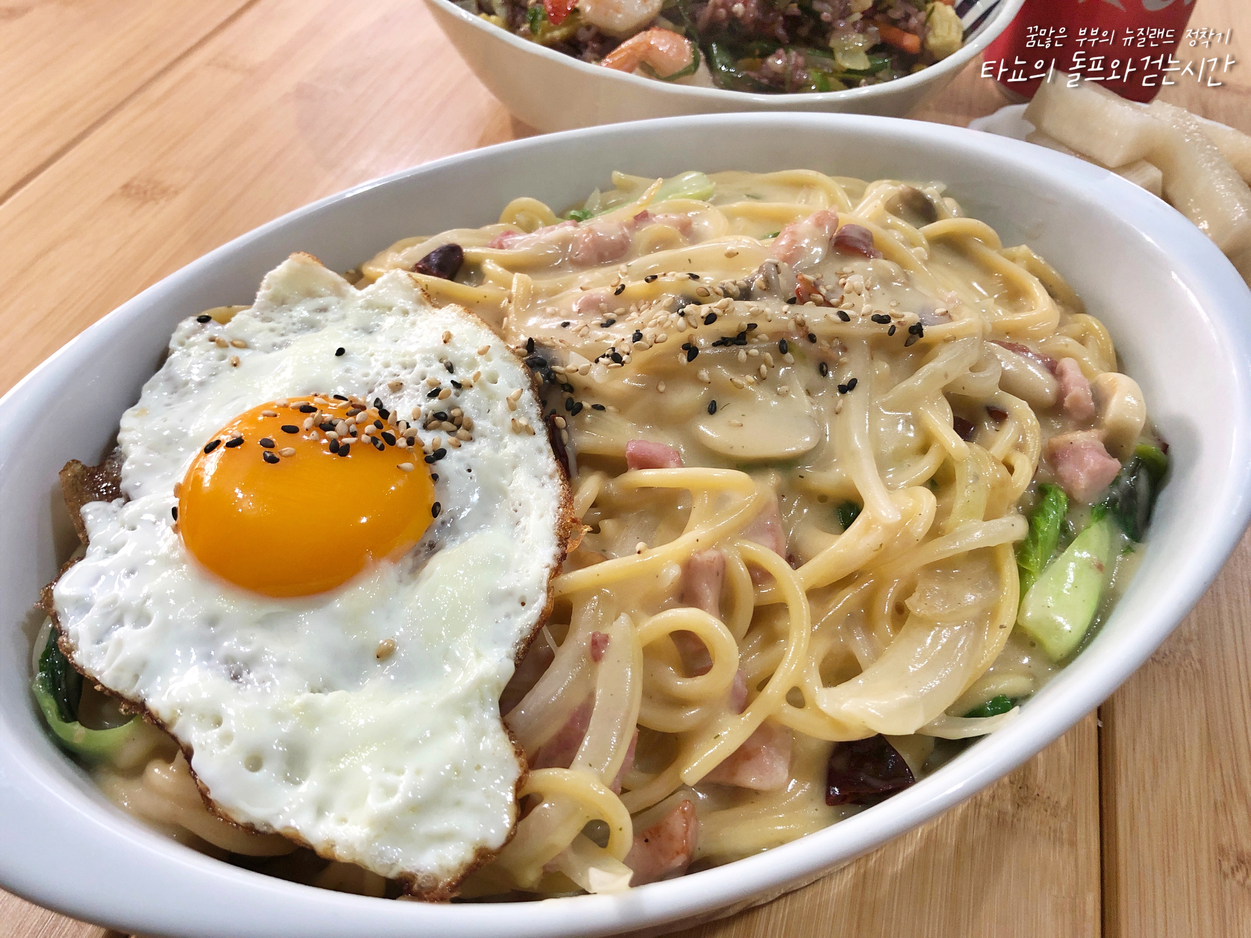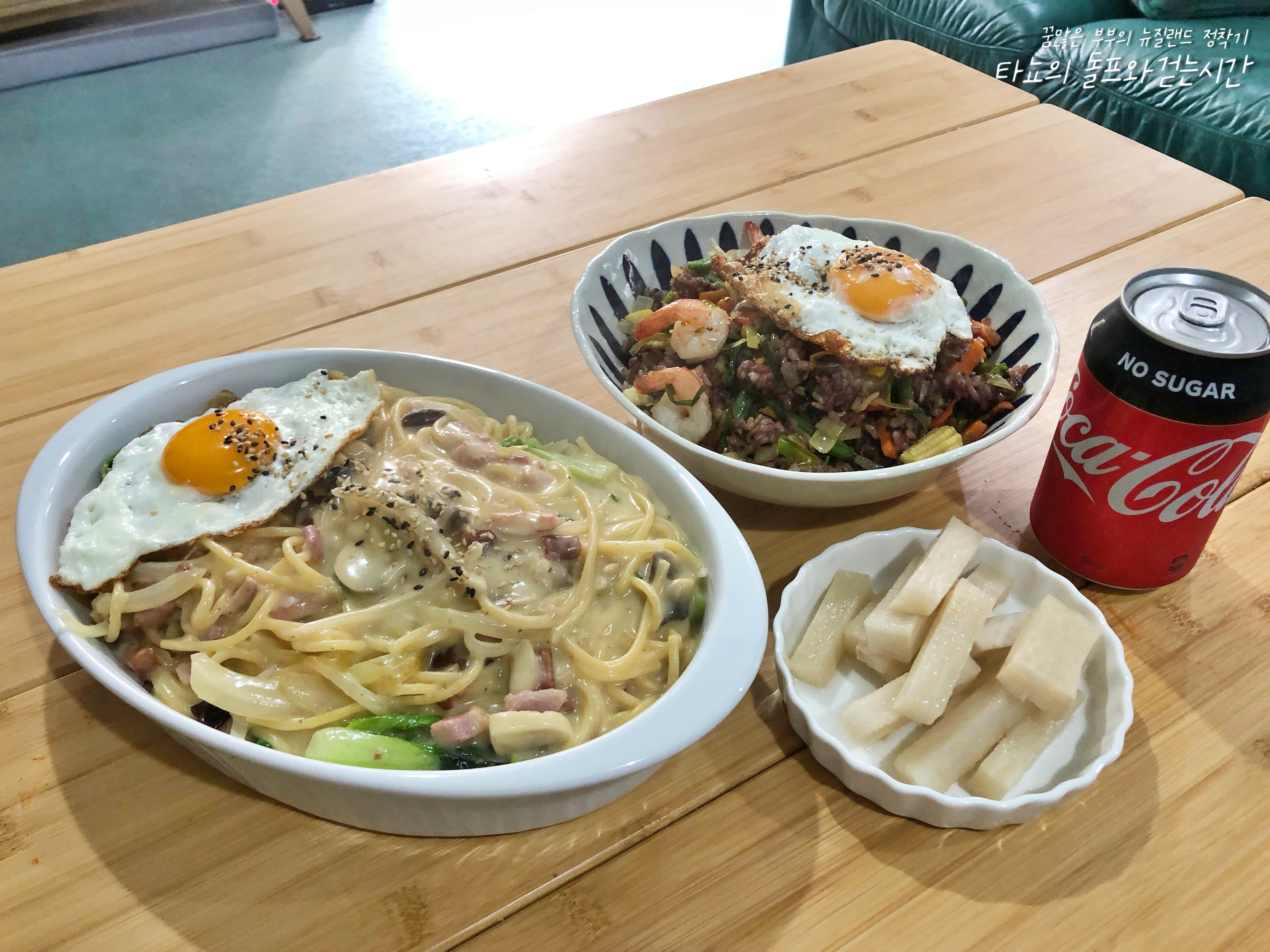 신랑이 좋아하는 크림 범벅 파스타에 새우채소볶음밥 준비했어요. 파스타에는 베이컨, 청경채, 양파, 양송이, 매운 타이고추 함께 넣었고 볶음밥에는 냉동으로 파는 모둠 야채와 새우 듬뿍 넣고 간장, 참기름 넣어서 간을 맞췄습니다. 반숙 달걀은 빠질 수 없죠.