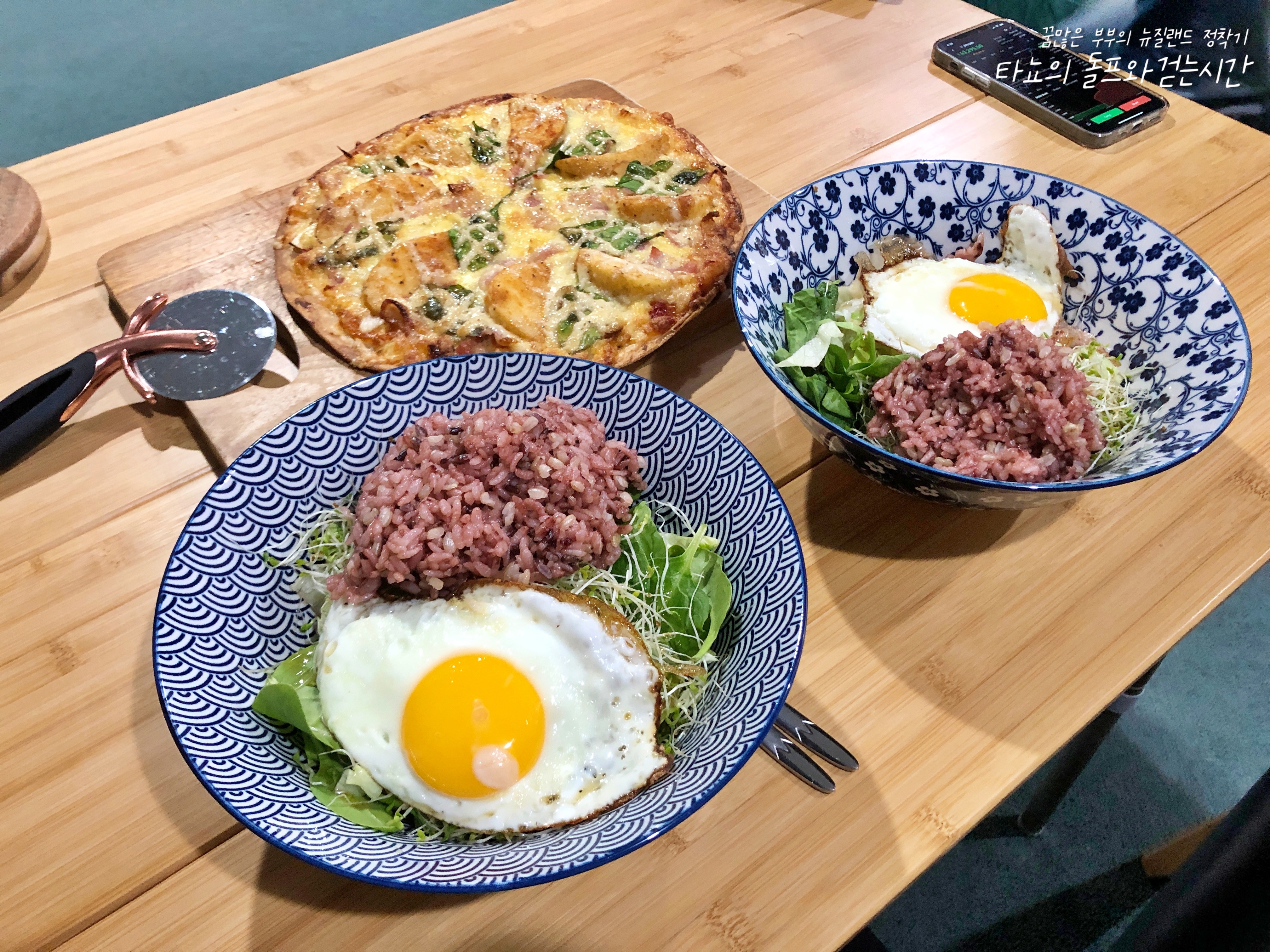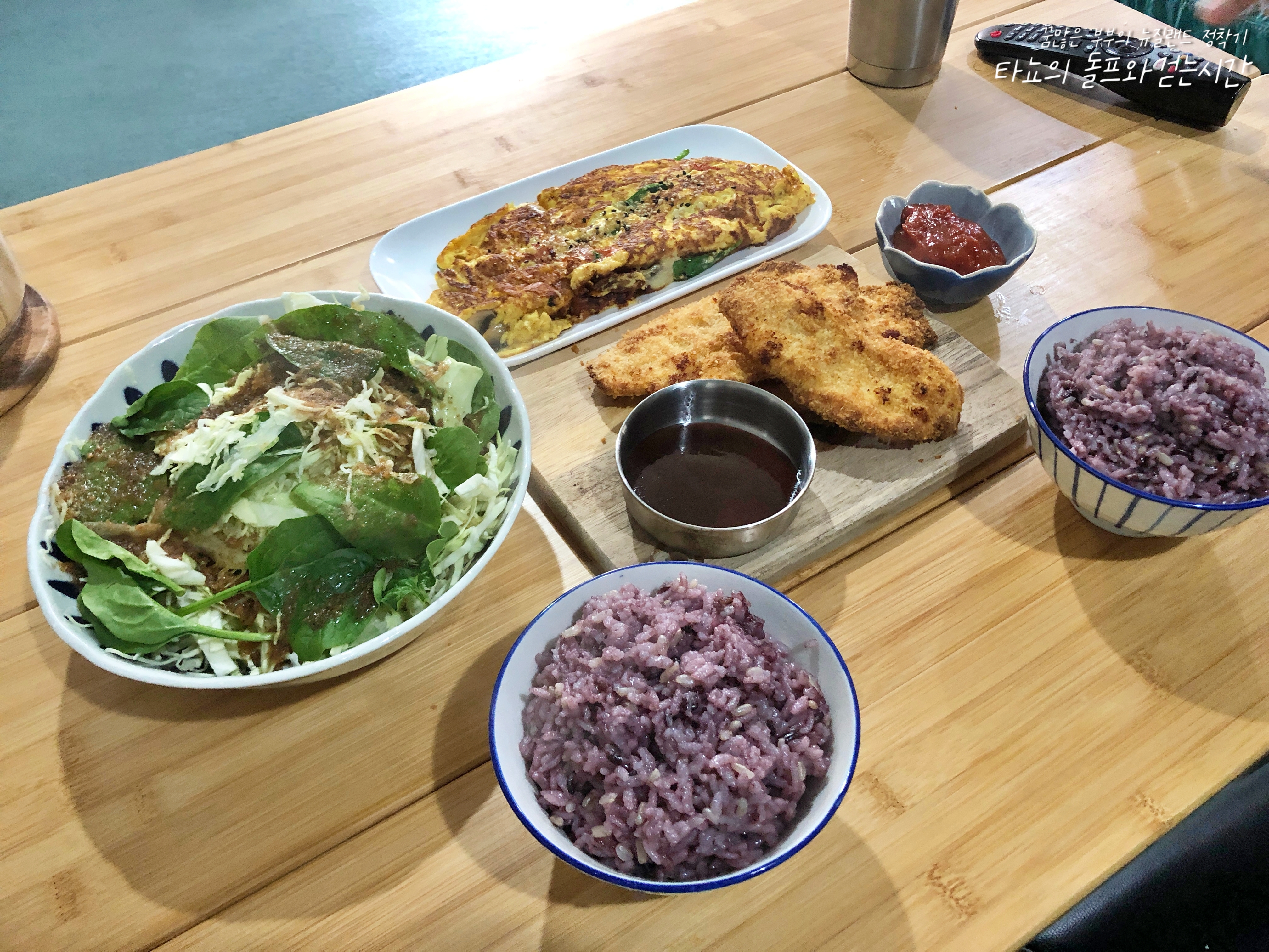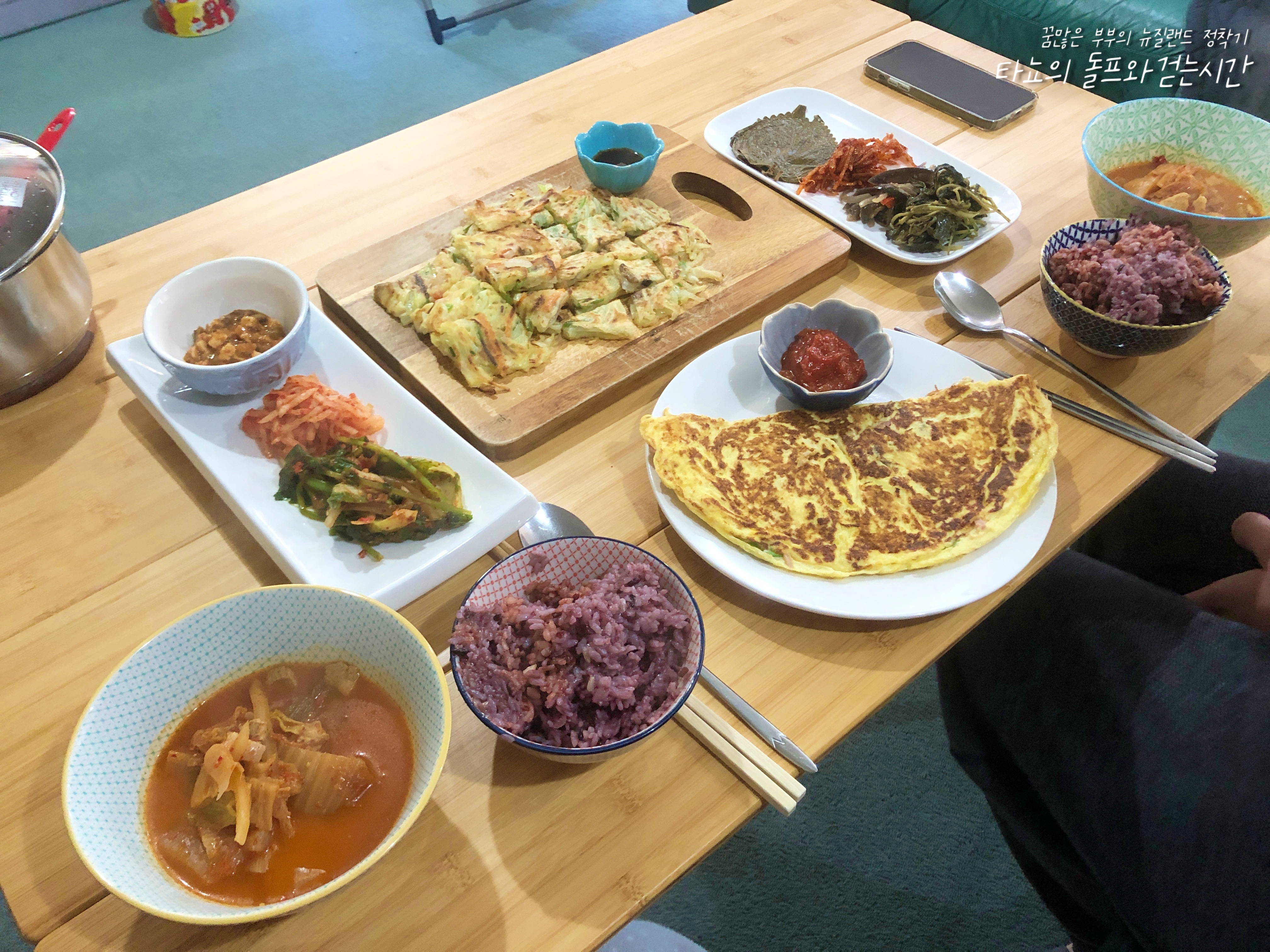 전날 저녁 간식으로 먹었던 해시 포테이토와 과카몰리를 얹은 피자와 잔뜩 차려서 먹은 아침 밥상입니다. 강된장, 각종 나물 무침, 파전, 오믈렛, 김치찌개까지 정말 완벽한 아침밥상! 이거 먹고 너무 든든해서 점심은 건너뛰었습니다.