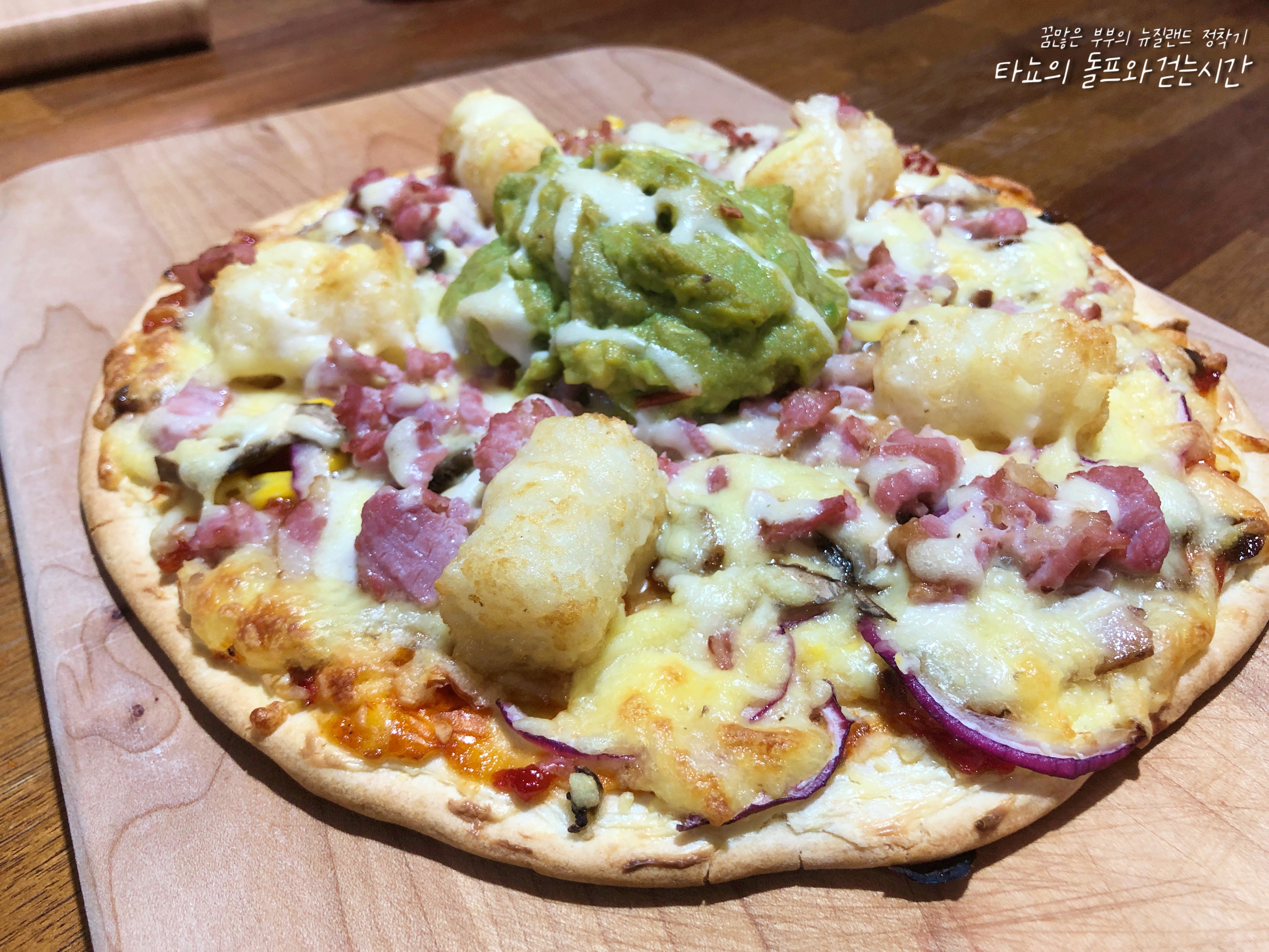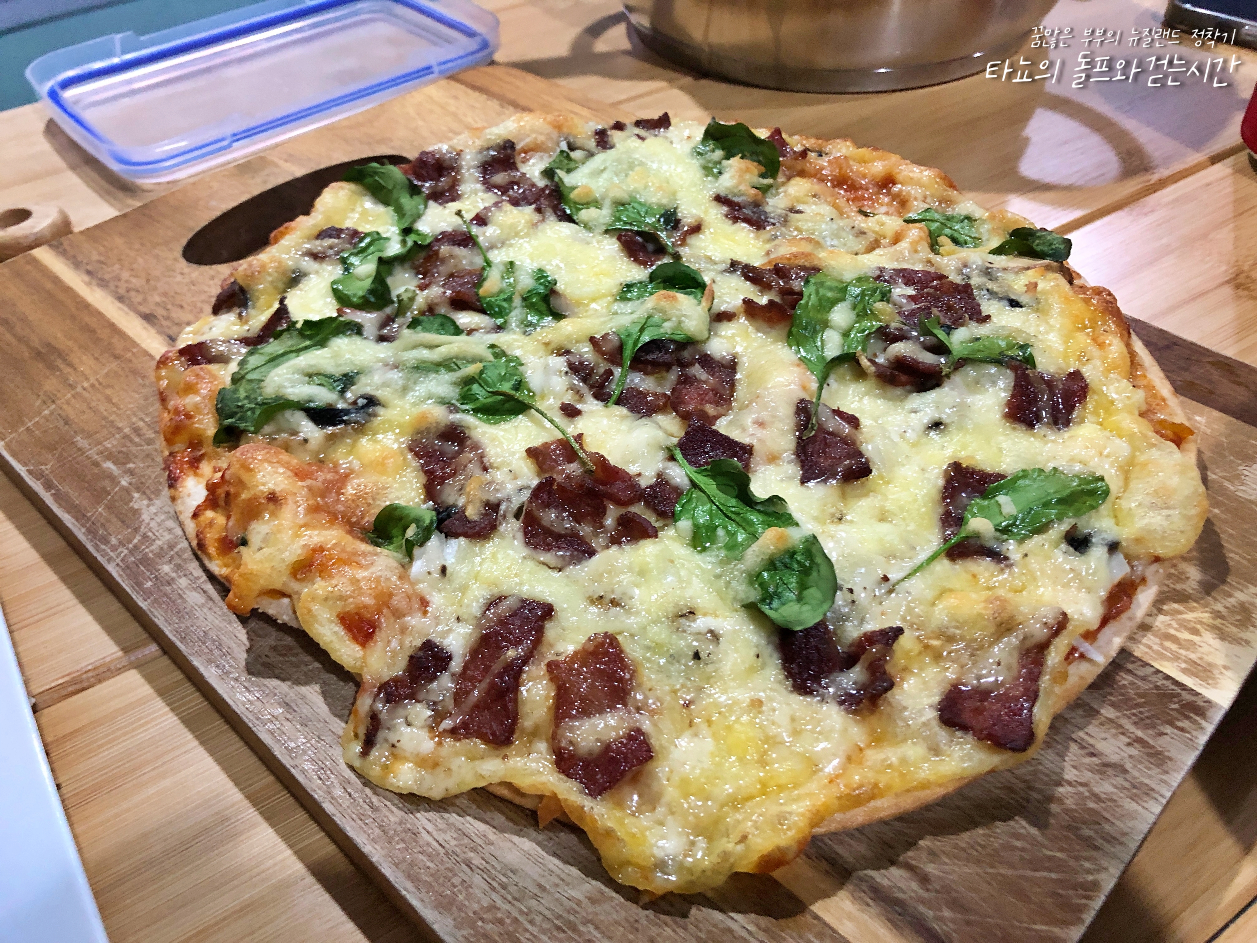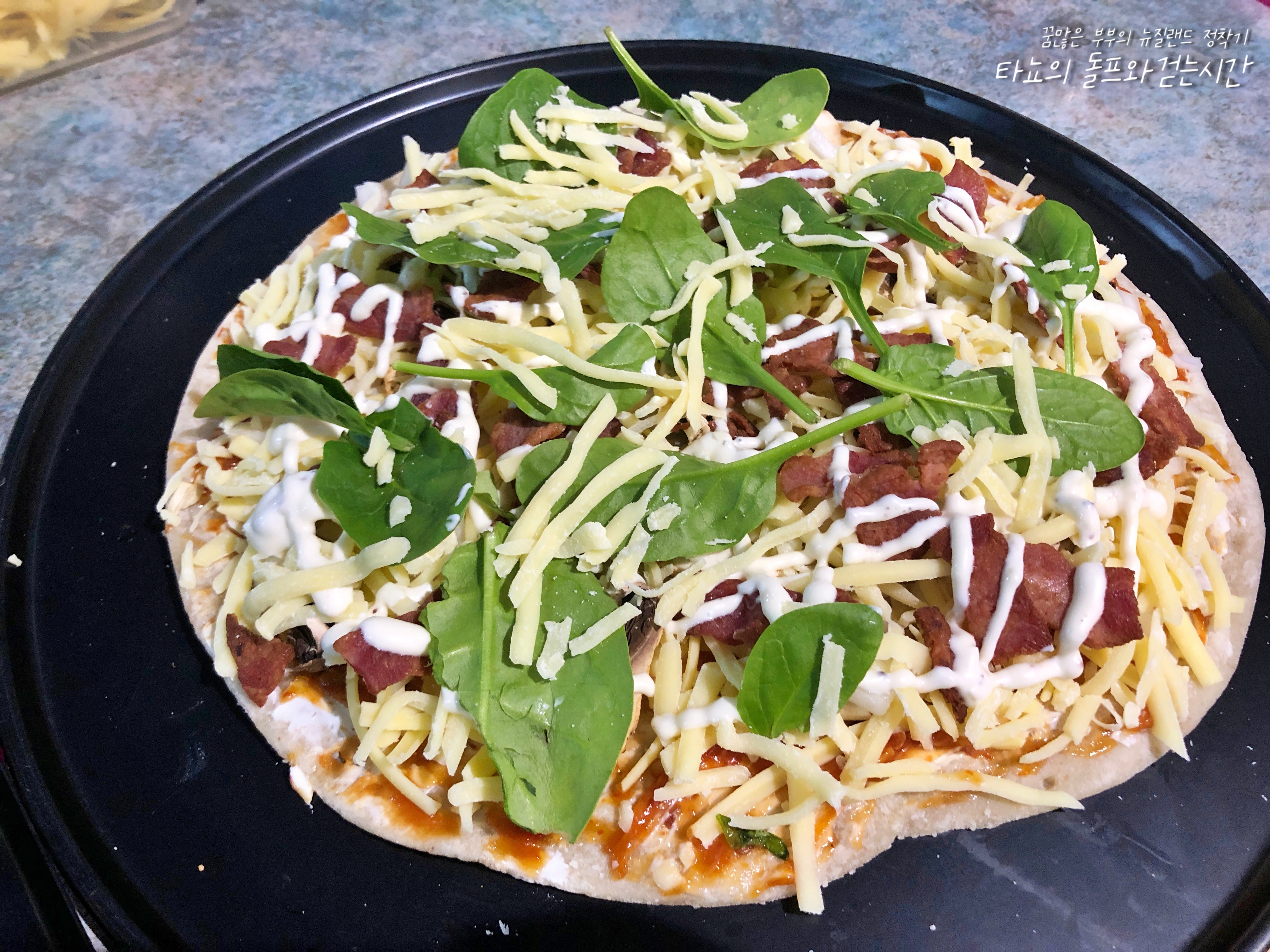 피자는 종종 등장합니다. 이번에는 그래도 제가 좋아하는 씬피자로 준비했어요. 토마토 소스, 크림치즈 바닥에 듬뿍 깔고 모짜렐라 치즈, 체다치즈, 베이컨, 시금치, 아이올리 소스 뿌려서 구워냈습니다. 아이올리 소스 덕에 마늘 향이 솔솔!