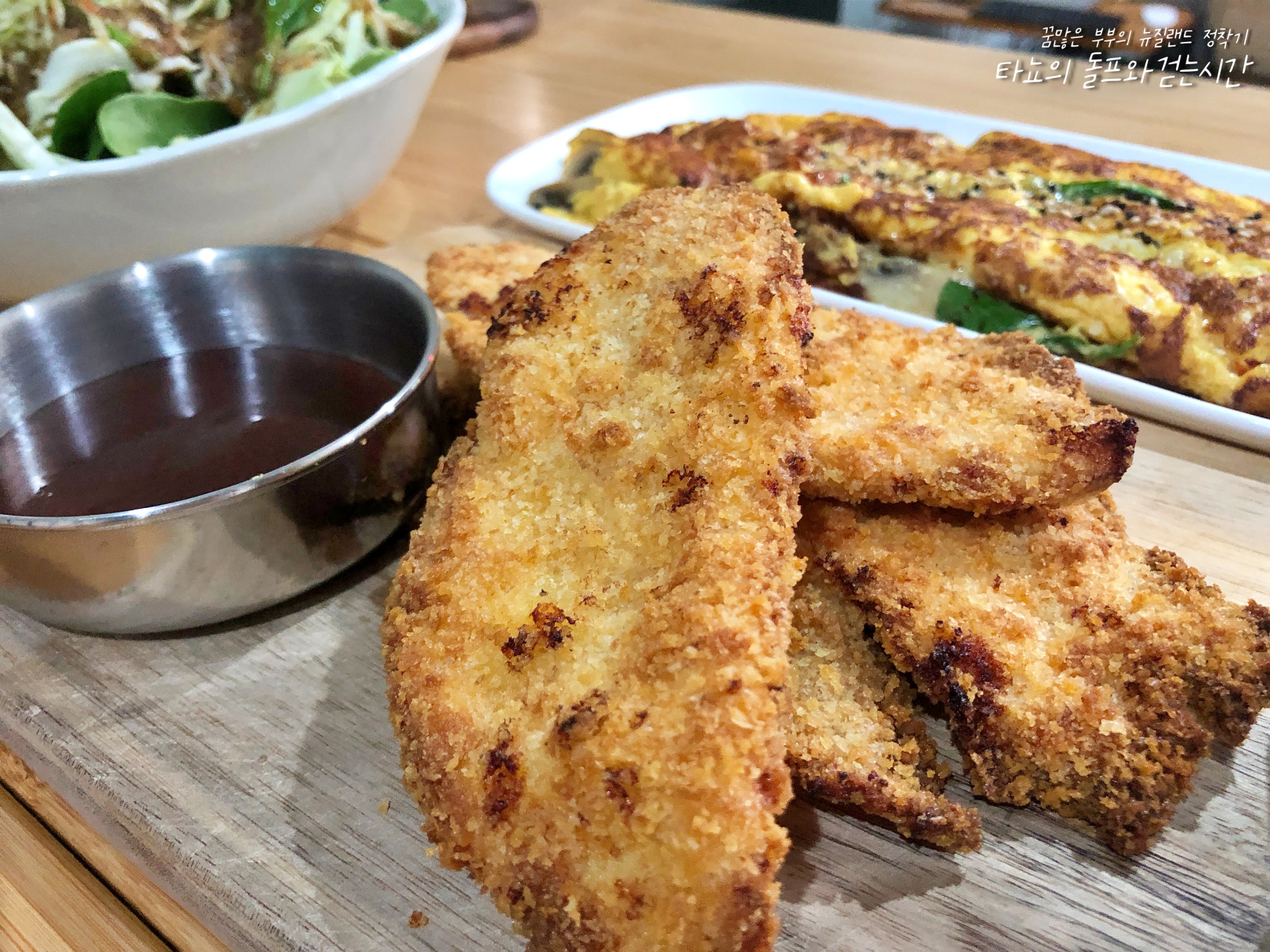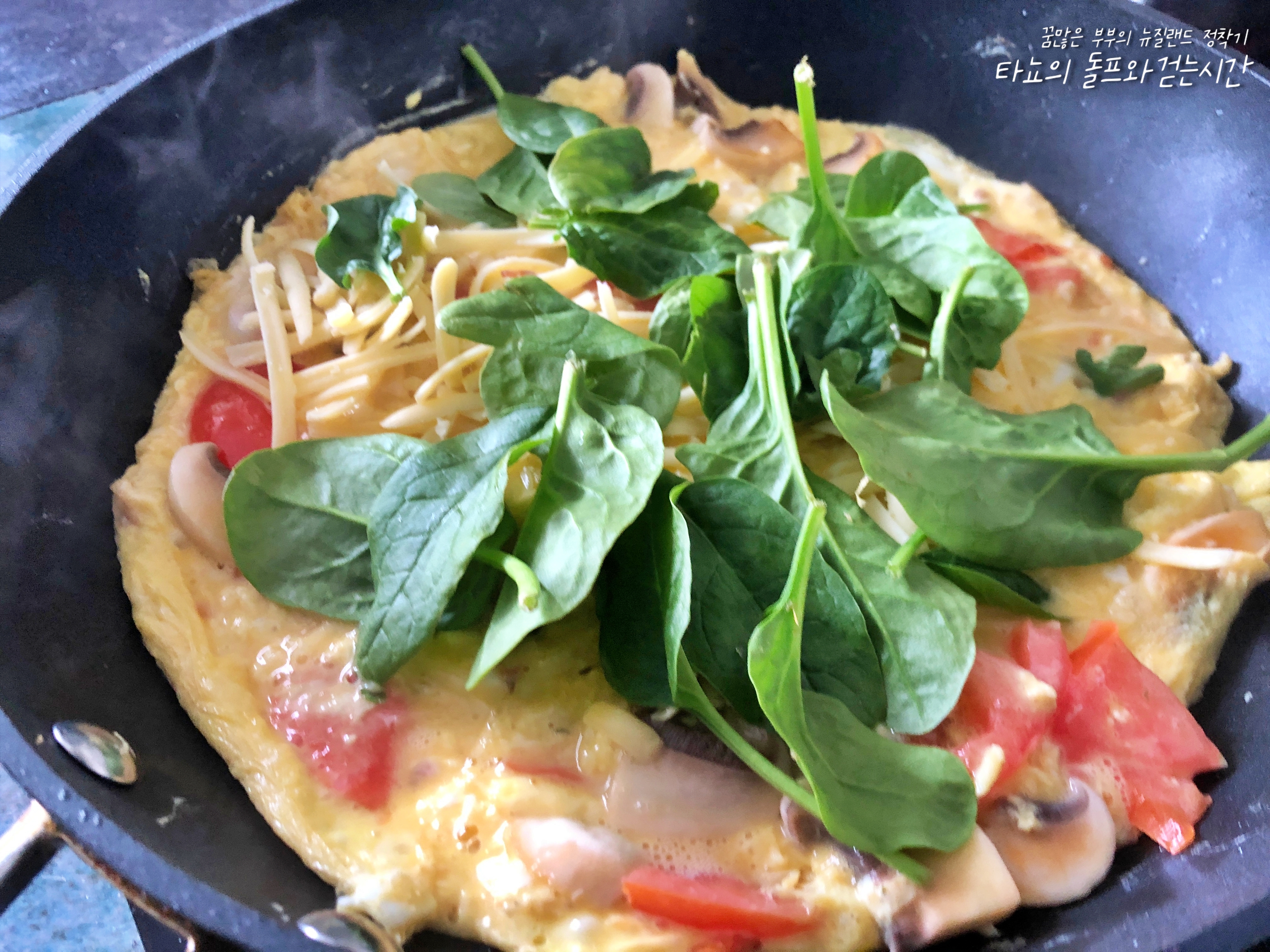 베이컨, 토마토, 시금치, 체다치즈, 양송이 넣어서 두툼하게 만든 오믈렛과 닭가슴살로 만든 치킨까스입니다. 간장 베이스 드레싱에 양배추 얇게 채 썰고 샐러드용 시금치 얹어서 함께 먹었어요. 오믈렛에는 토마토 랠리쉬 곁들였습니다.
