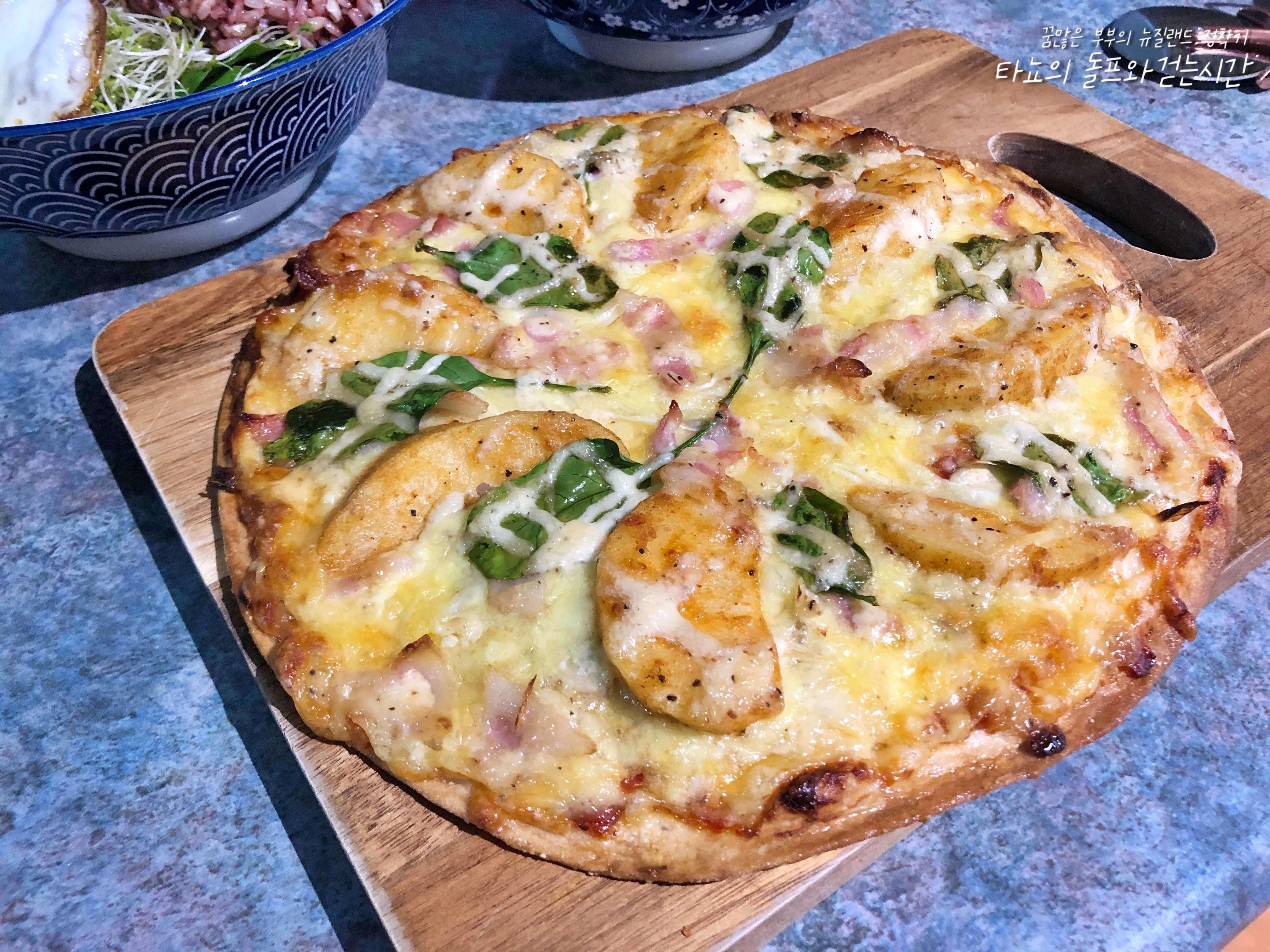 신랑이 매일 먹어도 행복하다고 말하는 피자와 제 만족을 채워주는 모듬 채소 비빔밥을 함께 차렸습니다. 두 사람의 취향이 극과 극을 달리지만, 어느 한쪽이 포기할 수 없을 때는 같이 차려내는 것이 가장 좋은 방법입니다. 신랑도 만족하고 나도 만족하는 행복한 마무리! 웻지 감자 잔뜩 올려서 구웠는데요. 도미노에서 판매하는 미스터 웻지를 살짝 따라 만들어 봤습니다.