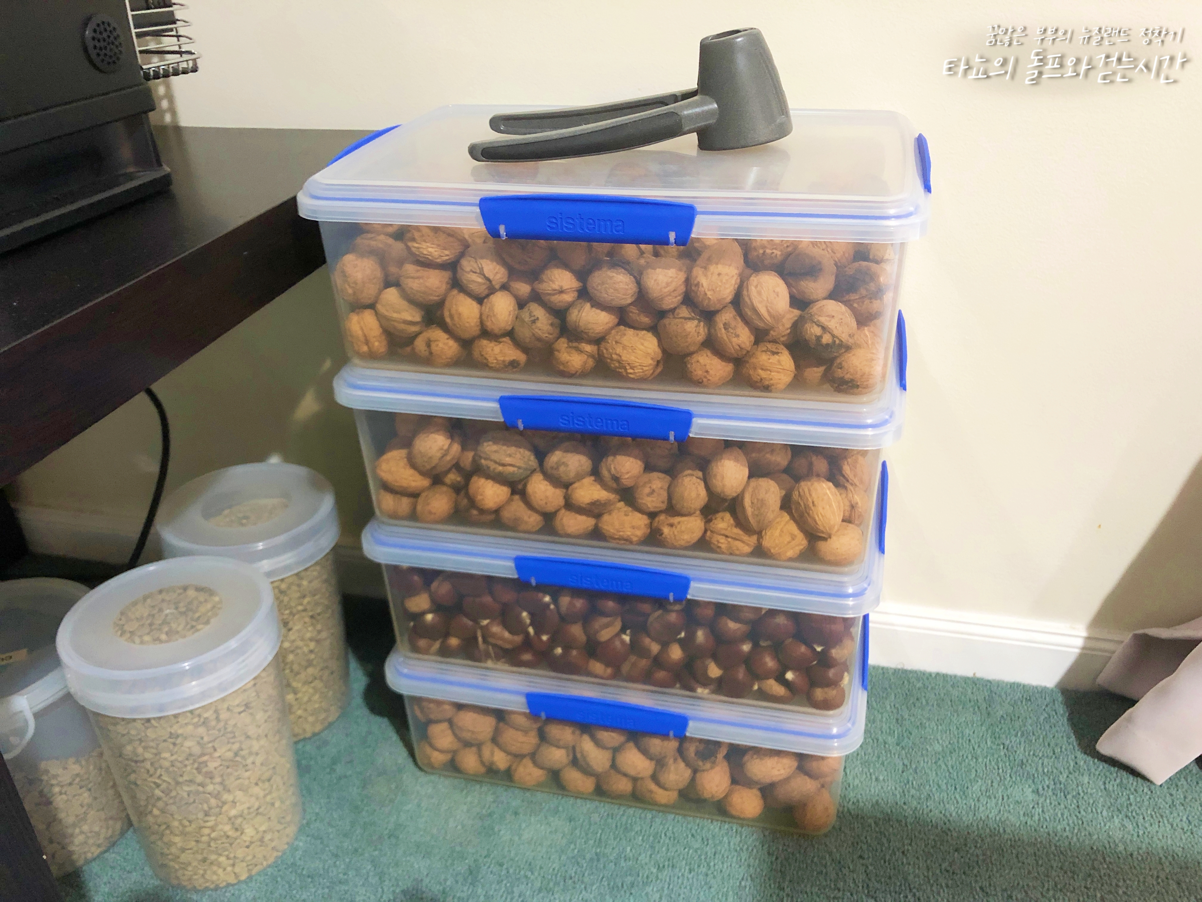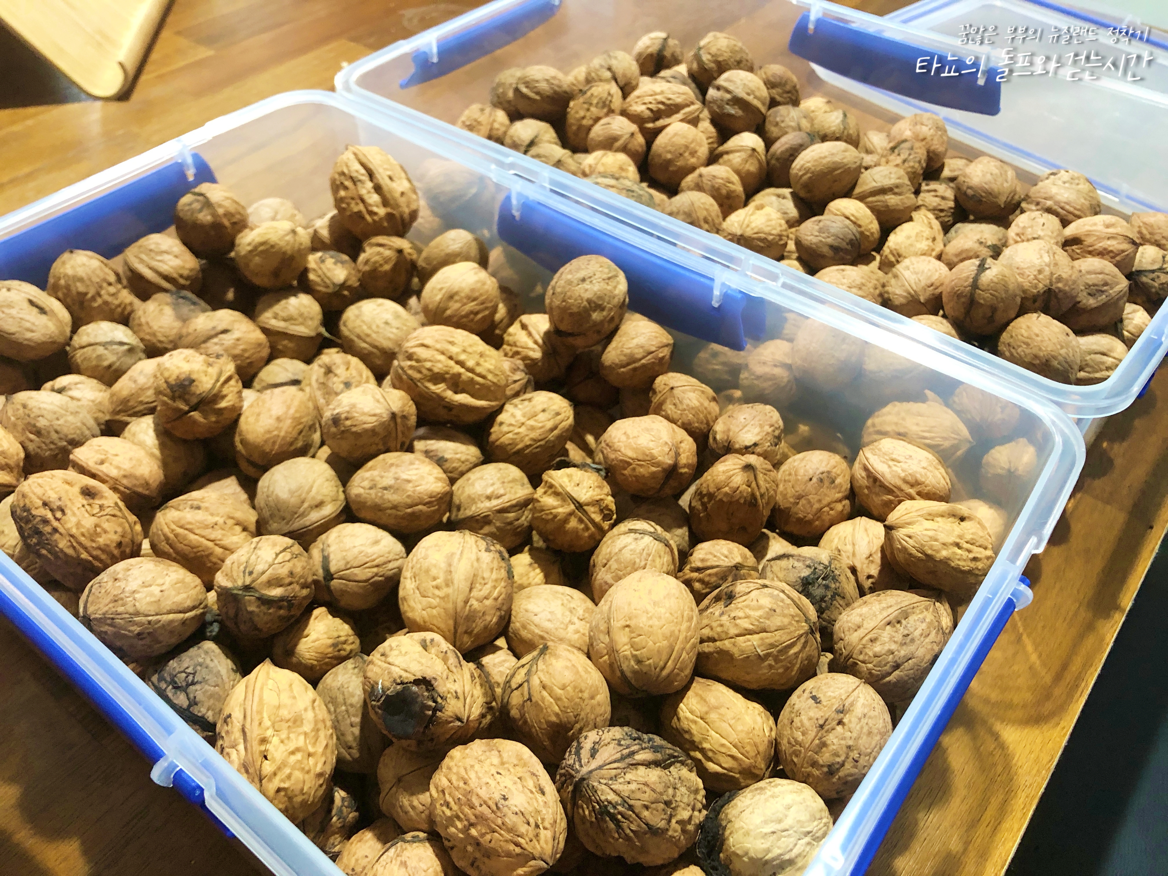 다음 날 친구가 다시 방문했습니다. 이번에는 호두를 주러 왔는데요. 제가 좋아하는 치아바타 빵을 큰 놈으로 사 왔더라고요. 아침에 갓 구운 쫀득하고 부드러운 빵을 받고 들떴습니다. 단호박 수프랑 양송이 스프 얼려둔 게 있었는데 이 날은 수프를 녹였죠. 이 친구 덕에 저희 집 달걀과 호두는 마르지 않습니다. 진정한 마르지 않는 샘을 경험하고 있죠. 너무나 고마운 ㅜㅜ...