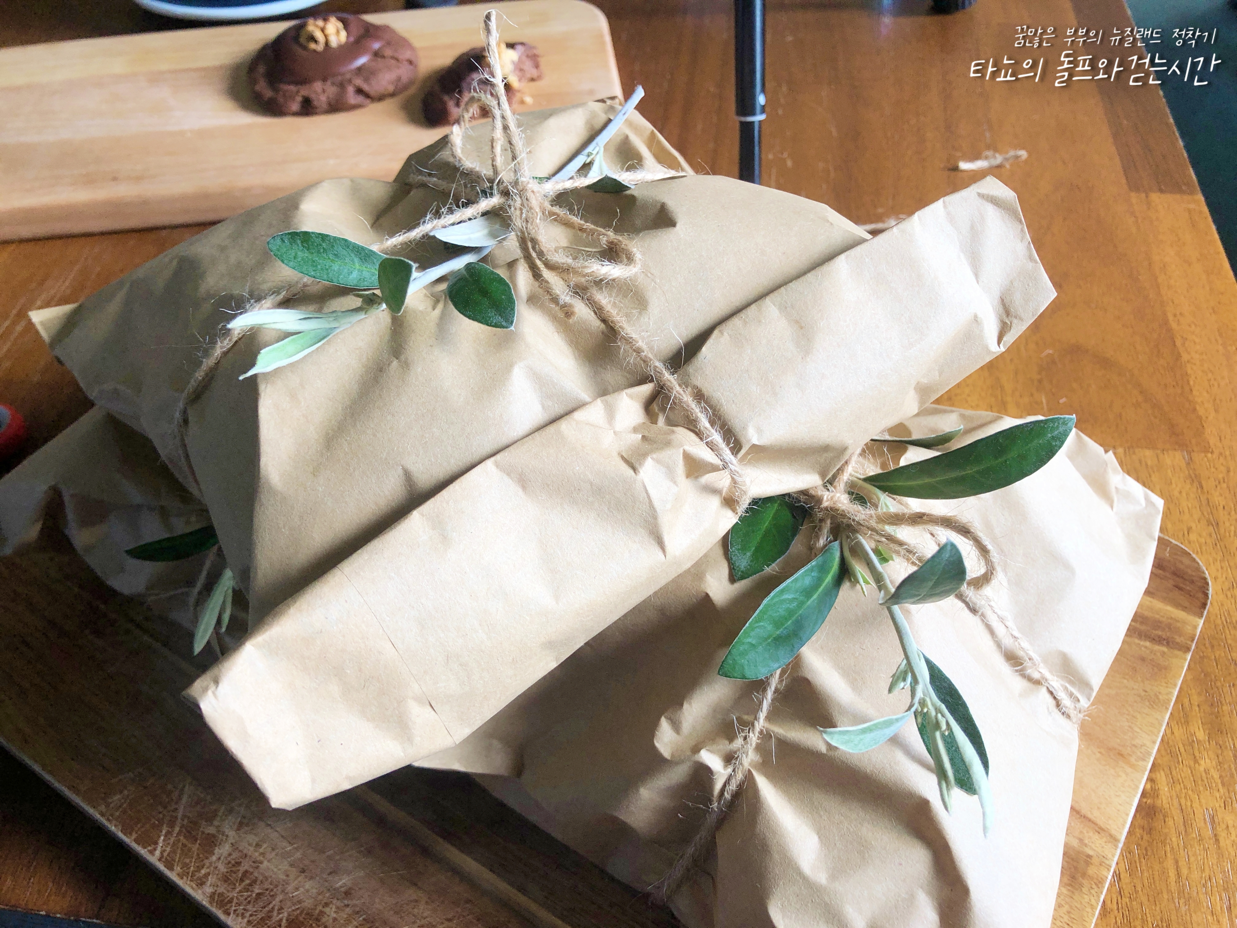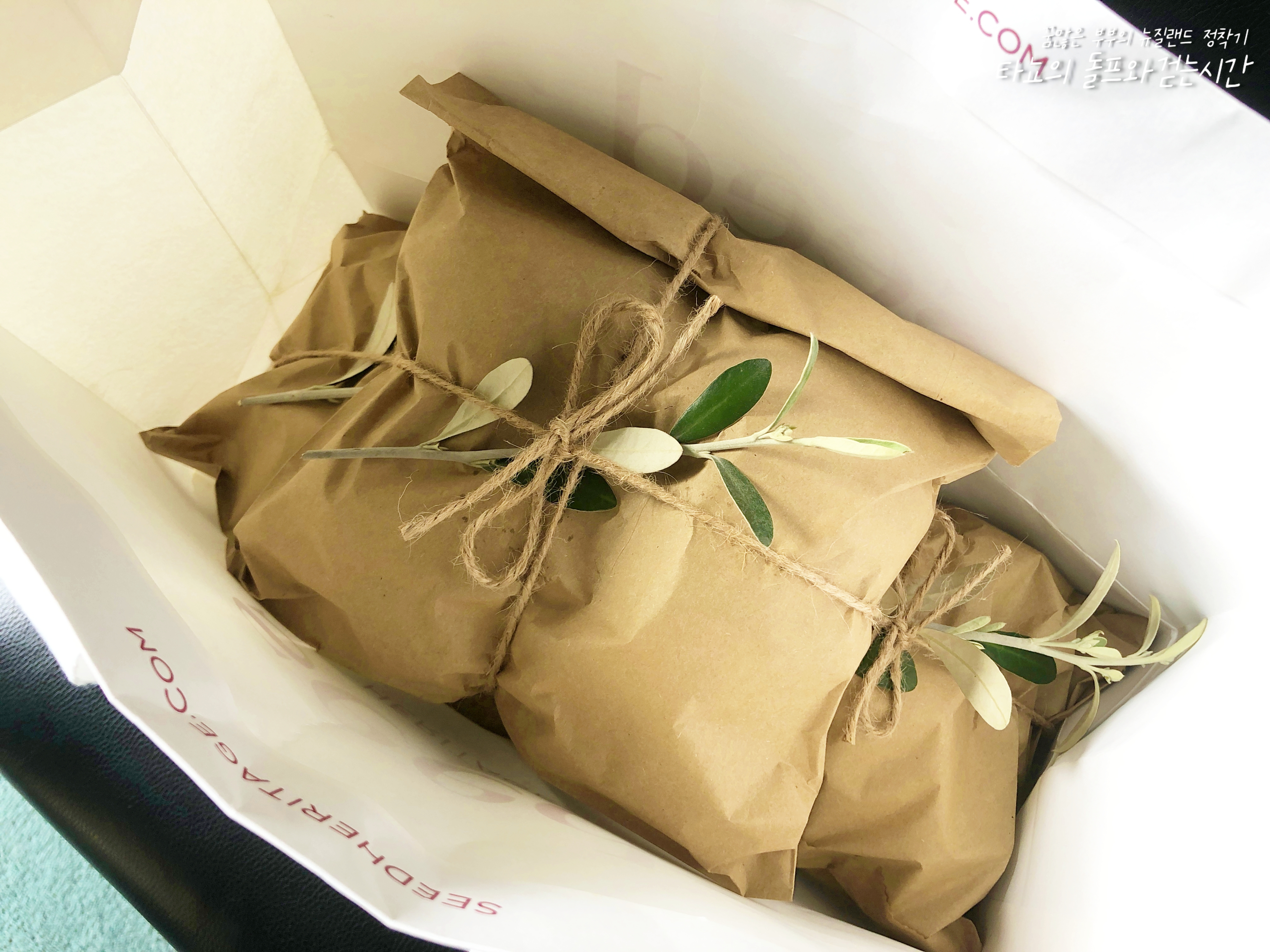 정원에 조경 나무가 많으니 좋은 것은 뭐 포장할 때 이런 잎사귀 잘라서 꽂아주기 좋다는 거? 포장 이쁘게 잘 돼서 대만족!