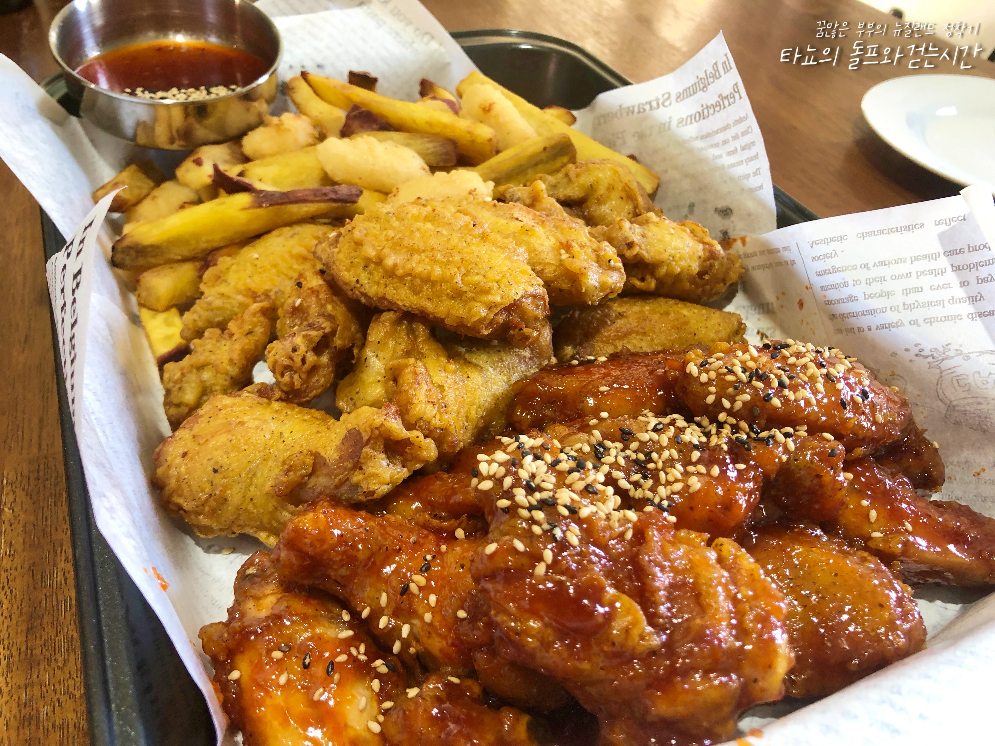 오잉 성공적으로 완성되었던 반반 치킨의 영롱한 모습입니다. 이렇게 보니까 또 튀겨 먹고 싶네요. 기름을 다시 부어야 하는 순간이 온 것 같습니다. 양념 소스는 백종원 소스를 기반으로 약간 수정해서 만들었습니다.