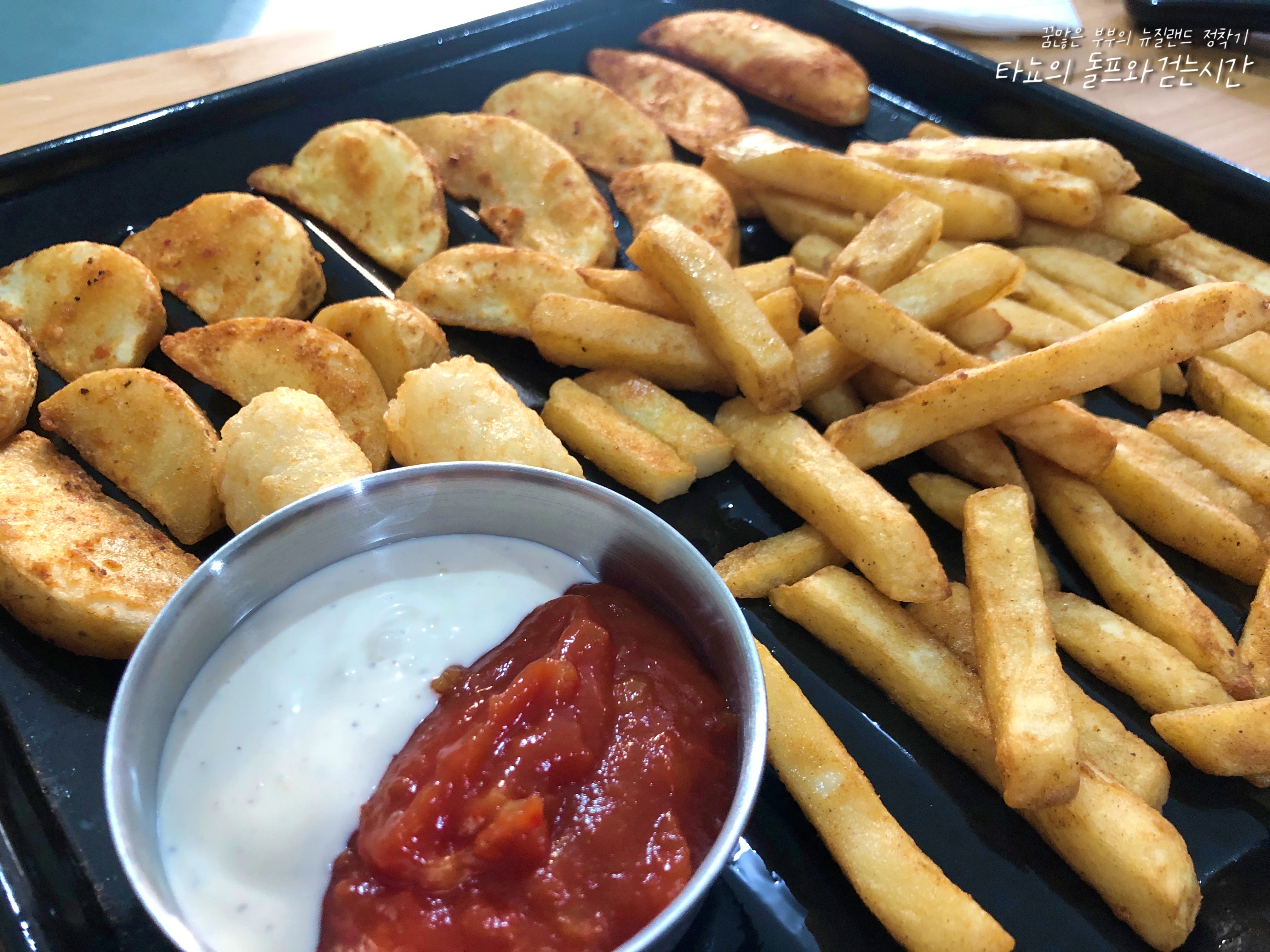 이 날도 웨지감자 피자 한판 준비했고요. 그걸로 부족해 칩스 잔뜩 튀겨서 토마토 랠리쉬와 아이올리 소스에 찍어 먹었습니다.