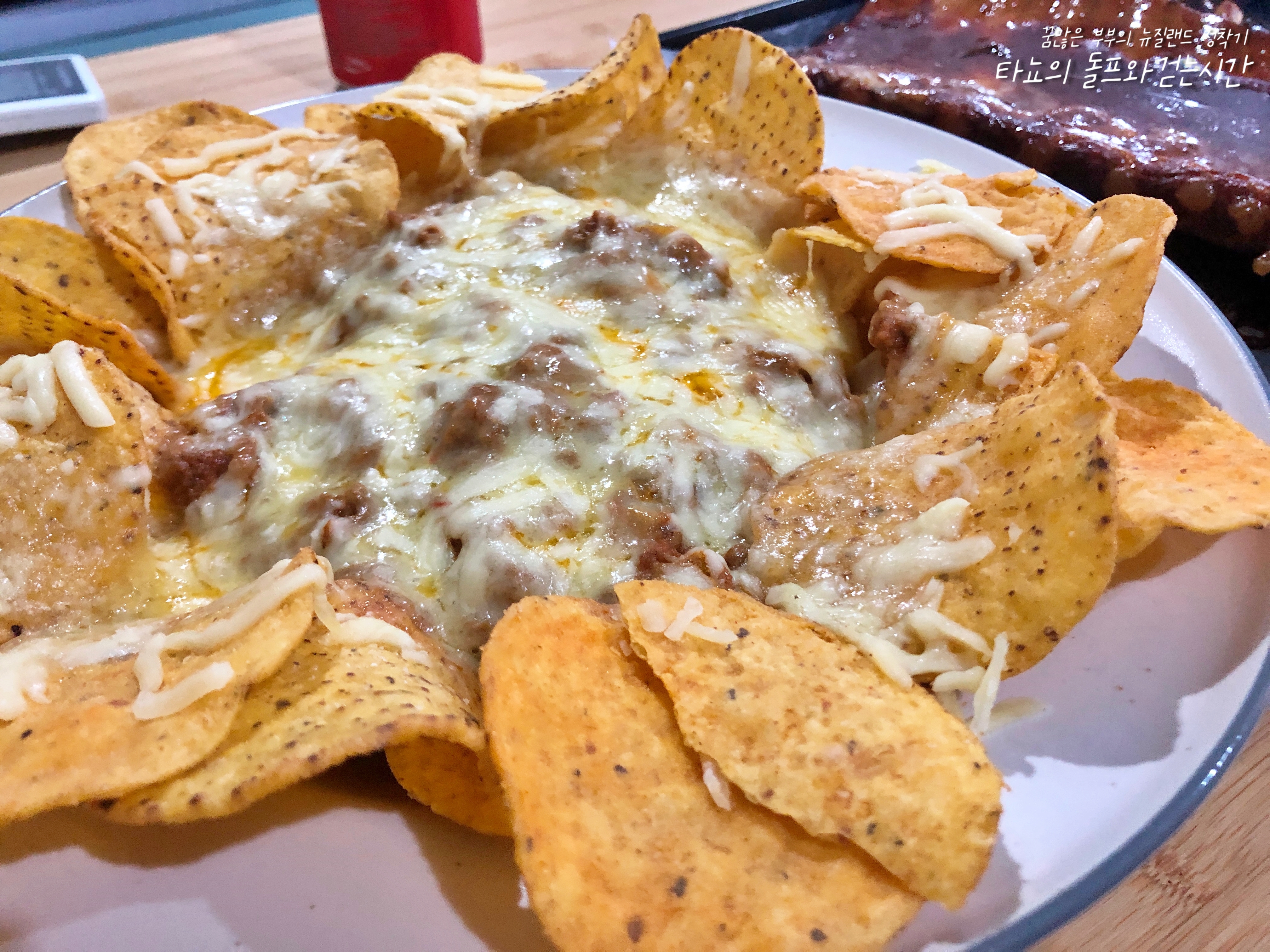 꿔바로우와 나초입니다. 꿔바로우 튀긴 날부터 무려 일주일 동안 하루 1치킨 튀겨 먹었습니다. 기름이 너무 아까워서... 어쨌든 몸무게는 불지 않아서 성공입니다. 나초칩에 매콤한 소고기 민스와 치즈 듬뿍 곁들여 먹었습니다.