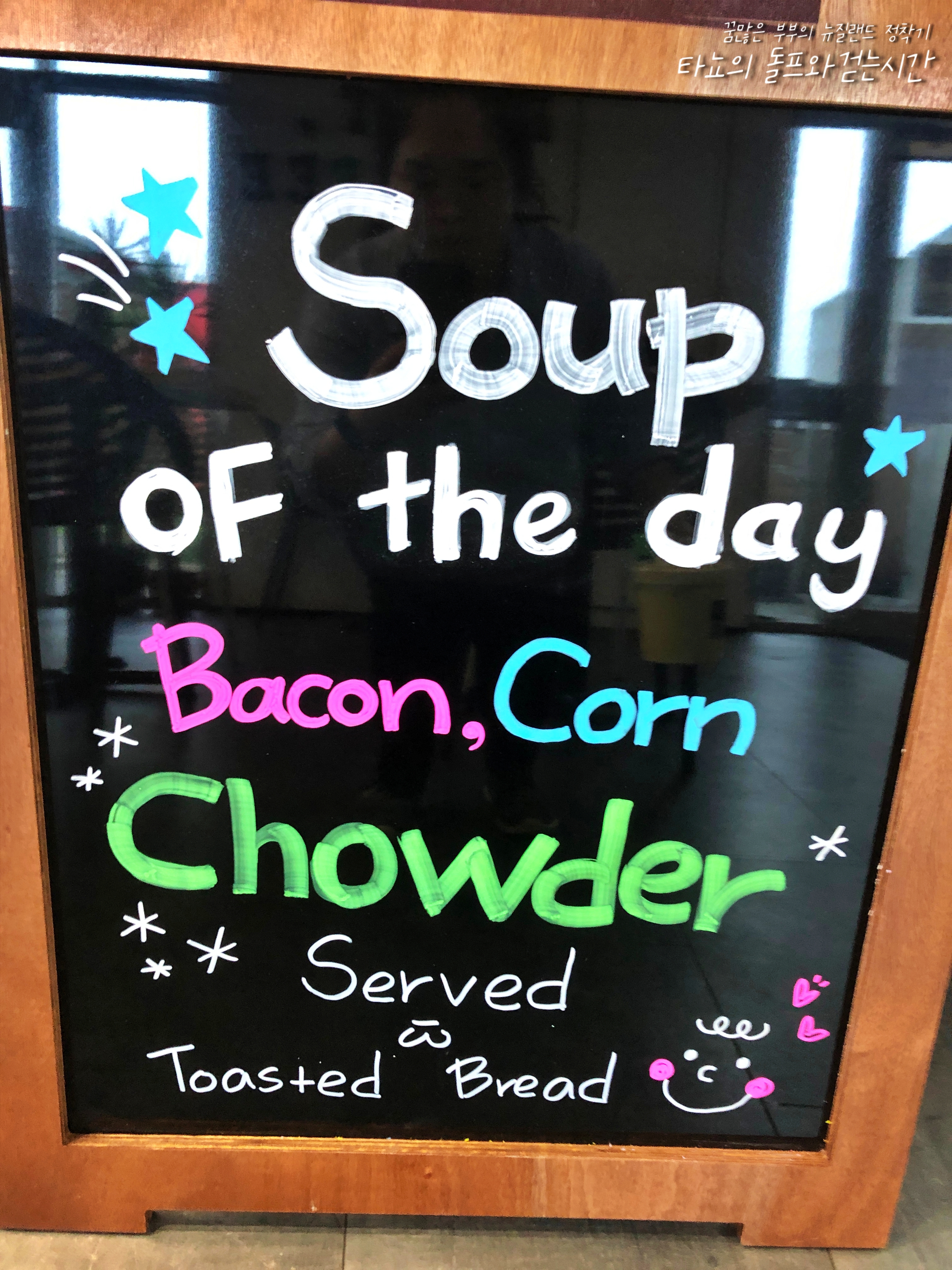 쿠키자에 이름도 다시 쓰고 이번에 판매할 수프 싸인도 새로 썼습니다. 이렇게 싸인을 바꾸면 한 일주일정도 판매합니다. 저희는 다섯 가지 정도의 수프를 차례로 돌려가며 만들어 팔고 있습니다. 차례가 되지 않더라도 제철에 맞는 식재료가 있다면 식재료에 맞게 수프를 준비하기도 합니다. 한동안 날이 추워서 수프 인기가 굉장히 좋았는데요. 락다운 3주를 보내며 어느덧 따뜻한 봄이 되어 이제 잘 나가지 않을 것 같네요. 벌써부터 시원한 스무디를 찾는 손님들이 꽤 있더라고요. 커피는 더워 죽어도 뜨거운 것만 마시는 키위들이지만, 시원한 음료는 잘 사 먹습니다. 시원한 커피를 안마실뿐...