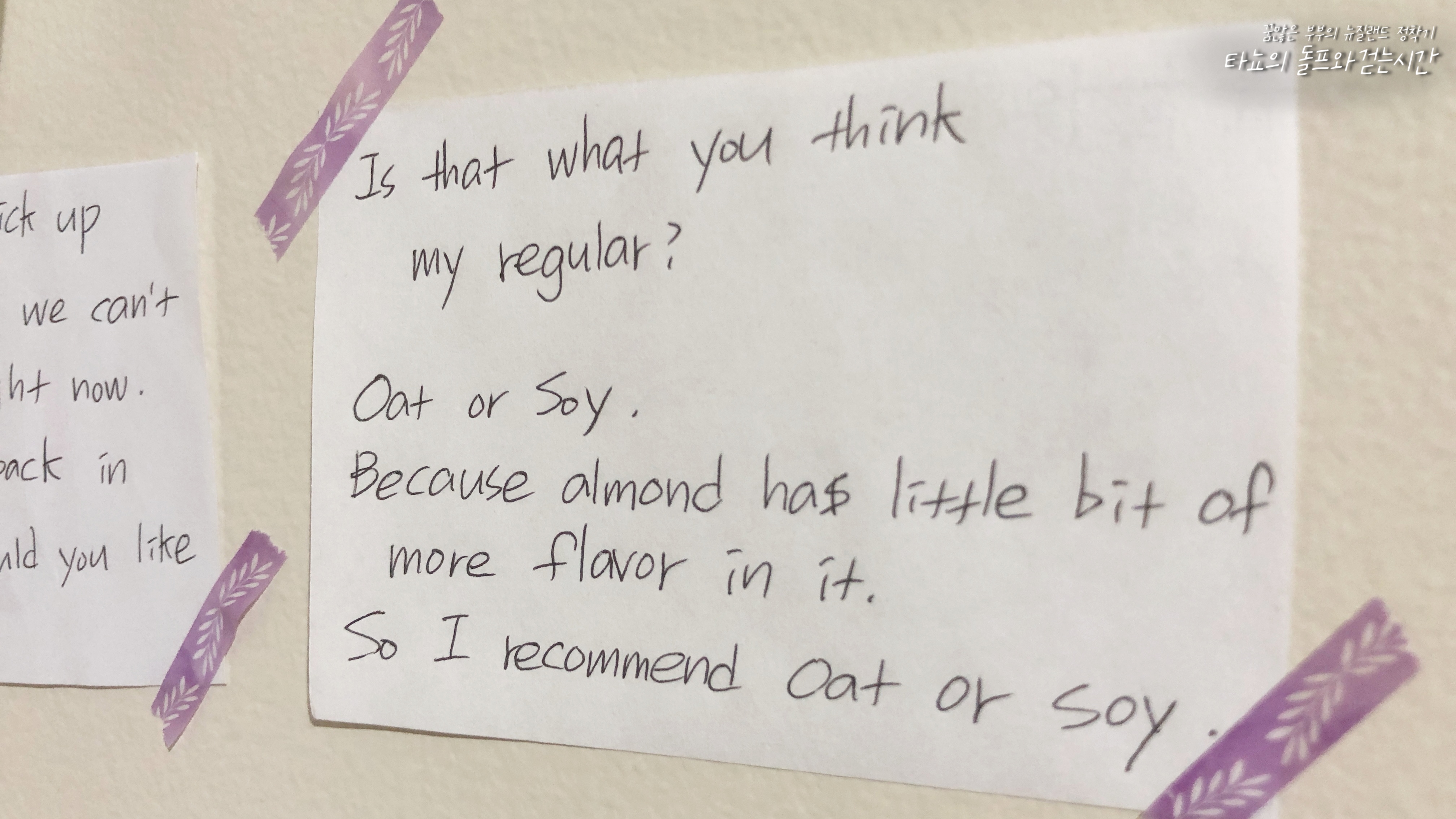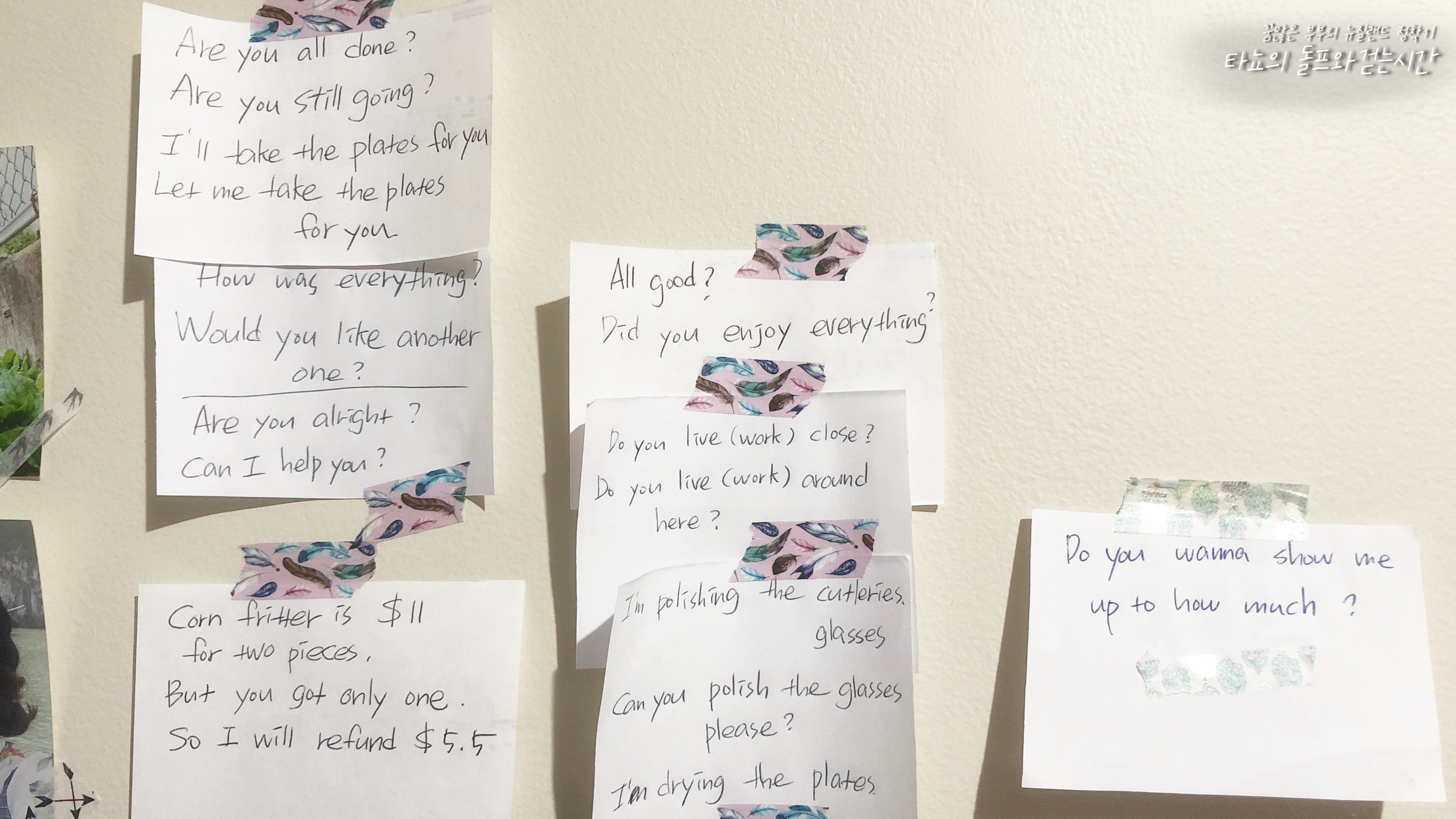 외국 카페에서 근무하는 사람들의 브이로그를 보면서 익숙해질 때까지 쉐도잉하고 거기서 나왔던 문장들을 매번 종이에 적었어요. 그리고 제가 종종 사용할 것 같은 문장은 붙여두고 달달 외웠죠. 외운 문장도 실제로 사람에게 던지는 게 얼마나 어렵던지요. 외국에서 몇 년을 살았지만, 울렁증이라는 게 정말 있더라고요. 벌써 5년째 뉴질랜드에 살고 있지만, 신랑과 함께 한국말로 이야기하고 지난 4년은 집에서 한국어로 재택근무만 했고 가깝게 지내는 사람들도 모두 한인들이다 보니 자연스럽게 영어는 더 멀어졌던 것 같습니다.