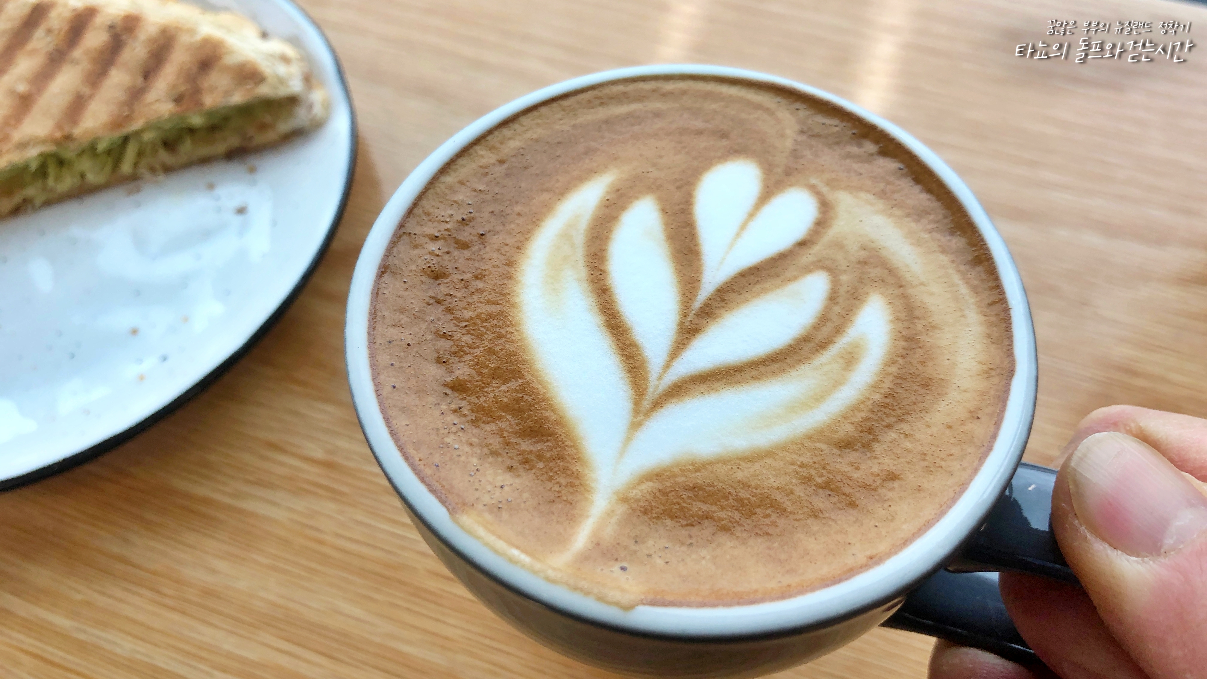 바질 페스토 치킨 토핑을 넣은 식빵 꼬다리 토스티와 플랫화이트
